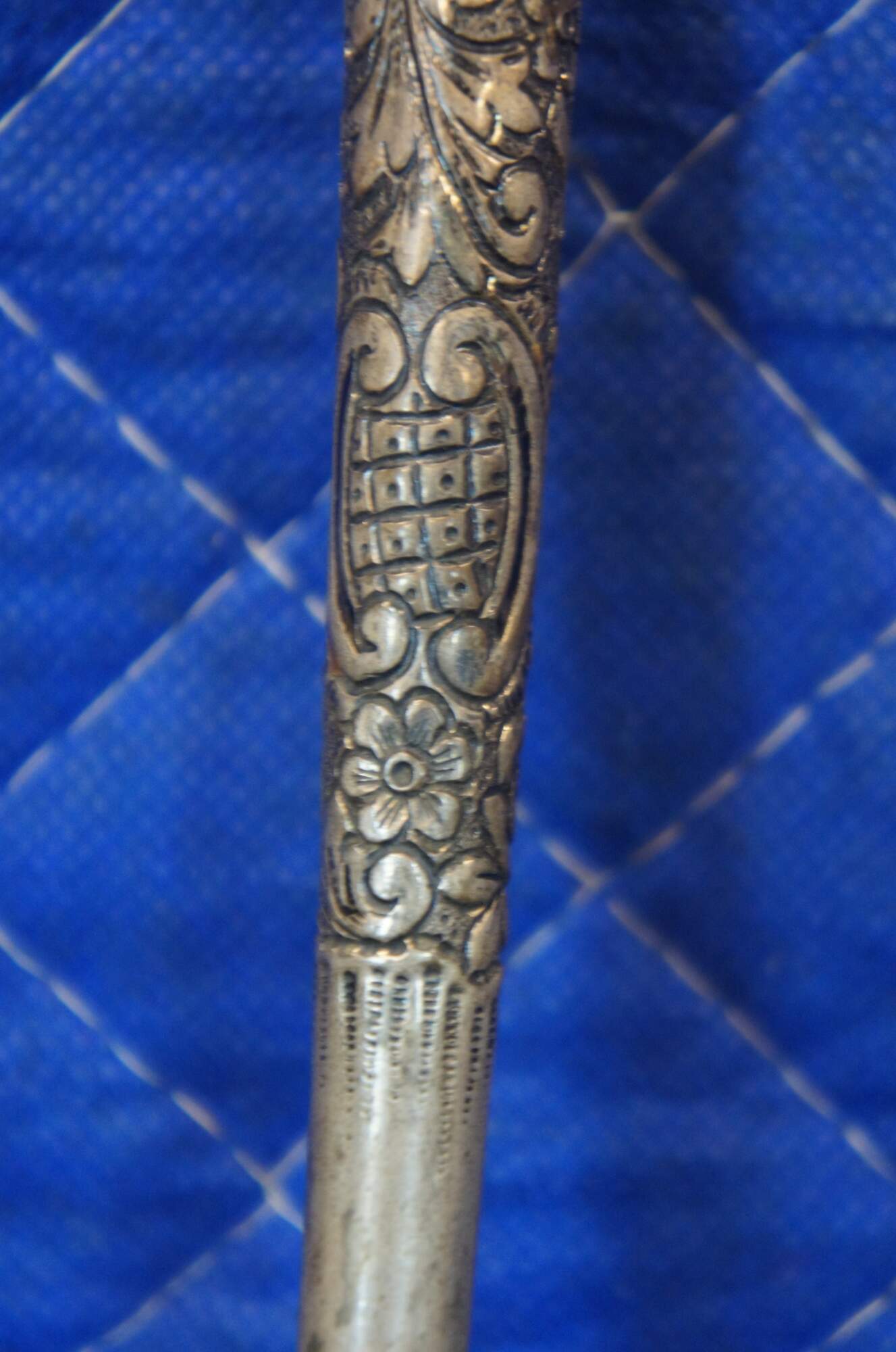 Antique Victoiran black silk parasol with floral 800 repousse silver handle; silk is marked Seta Pura Garantita along the edge.