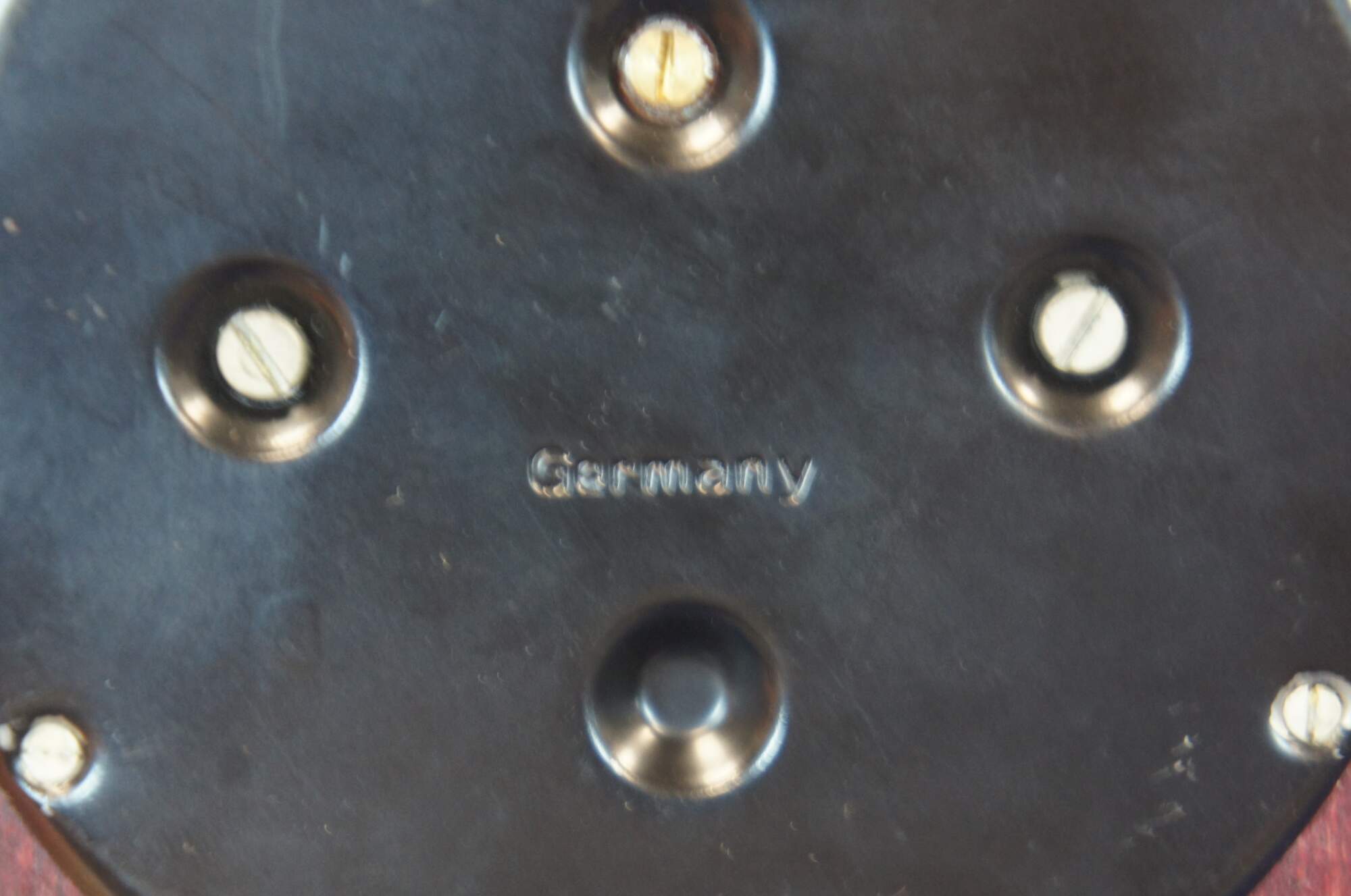 Mid century wall hanging barometer by Stellar Germany with a round pocket watch shaped wooden case and brass hanger.