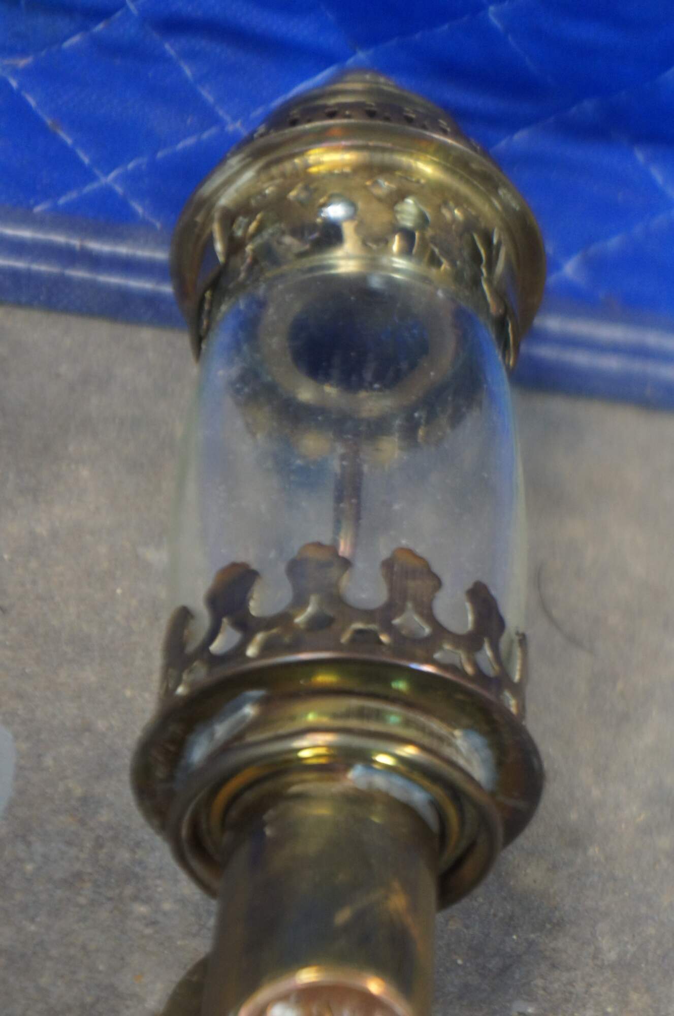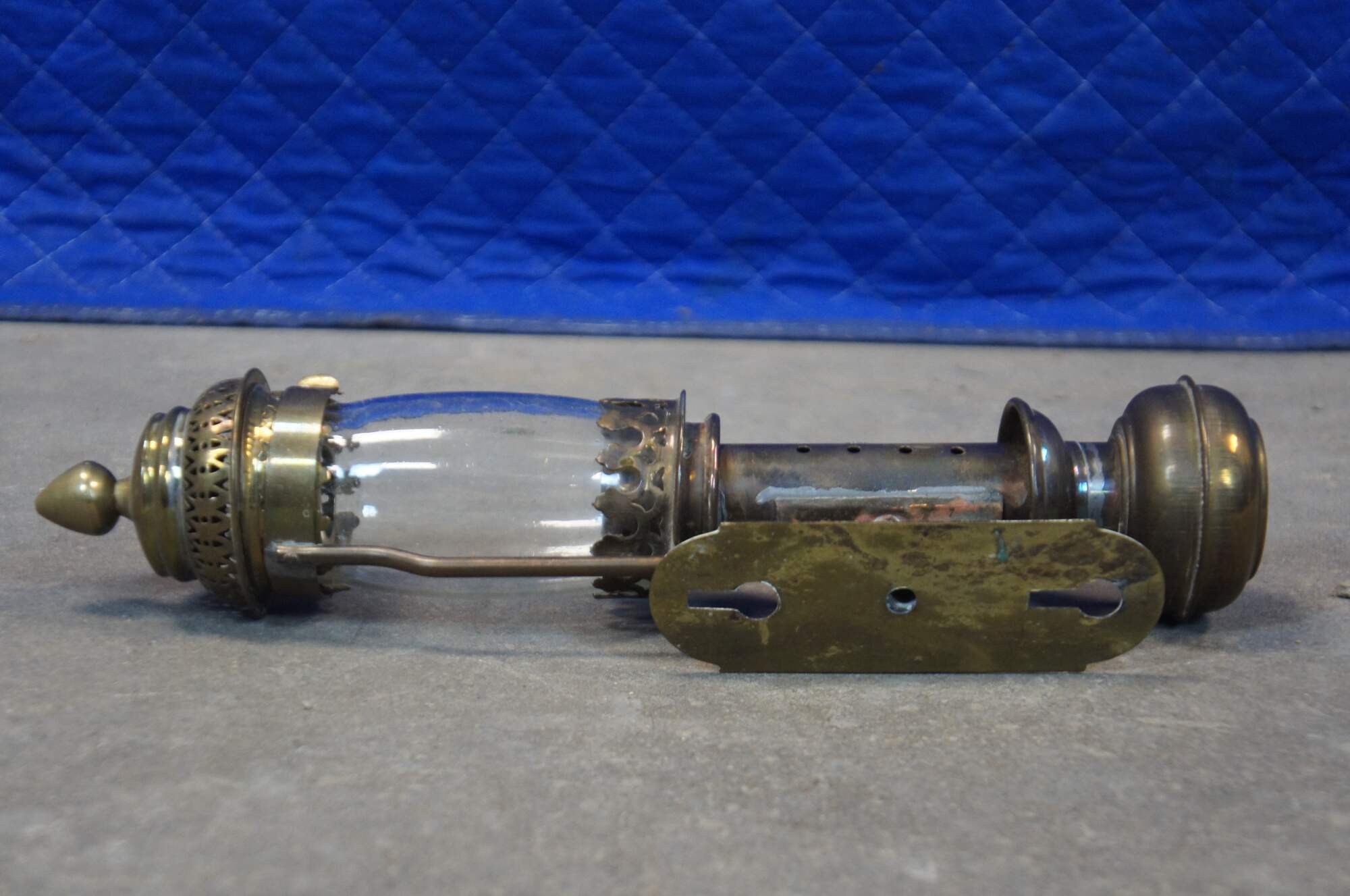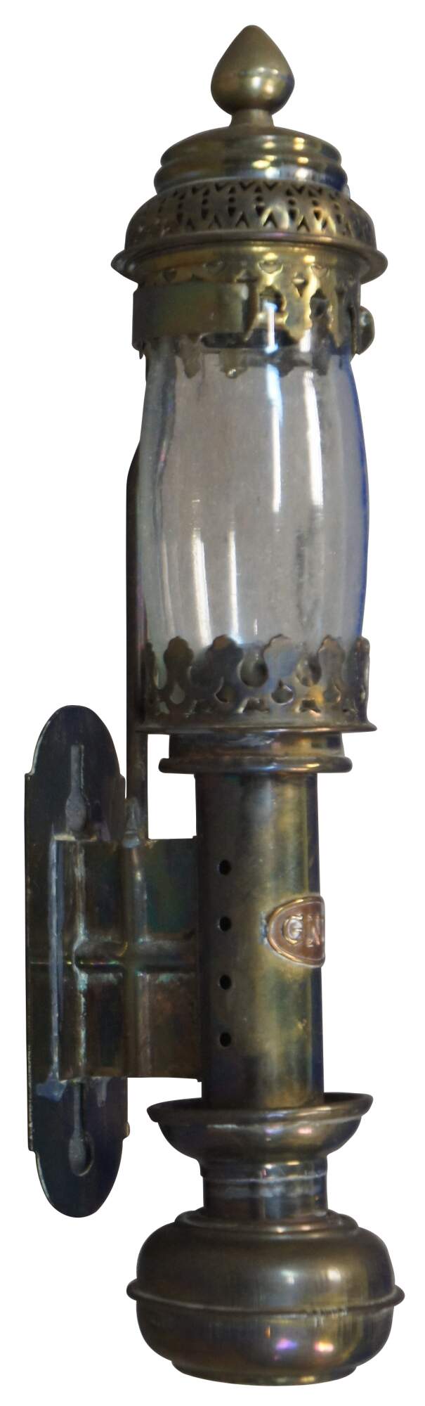 Antique brass and glass GNR Great Northern Railway candle lit train carriage lamp, light or lantern sconce.