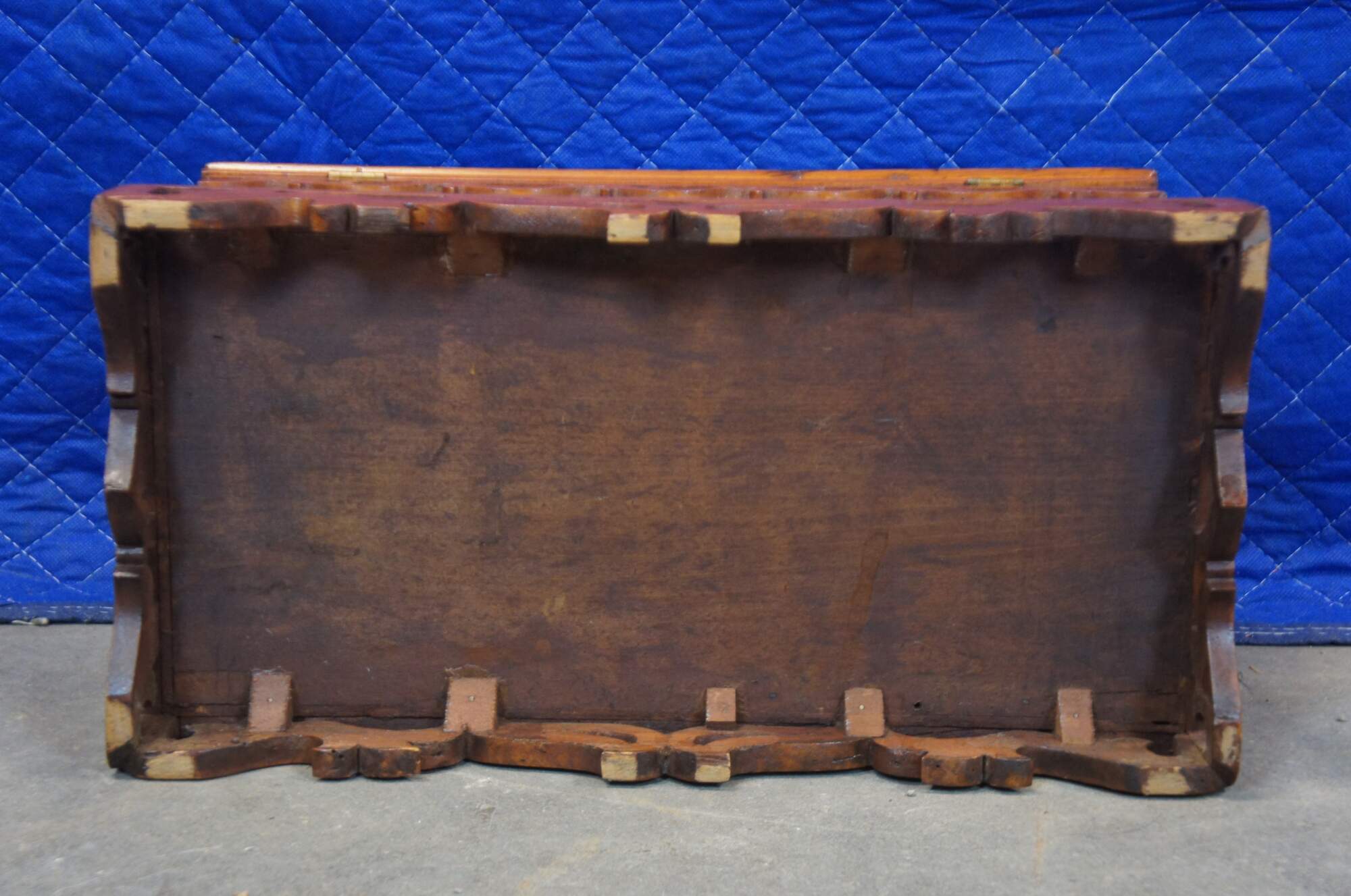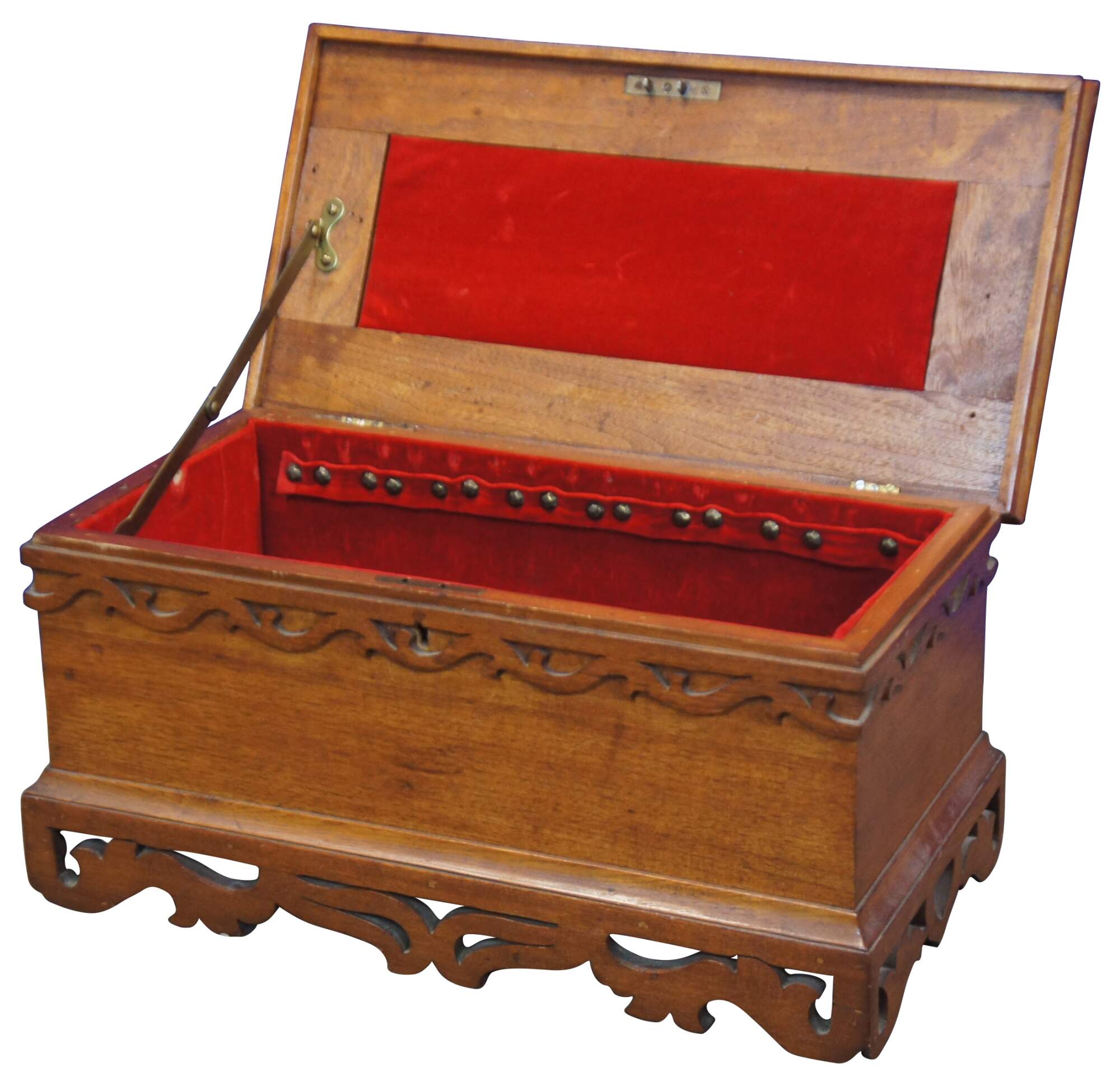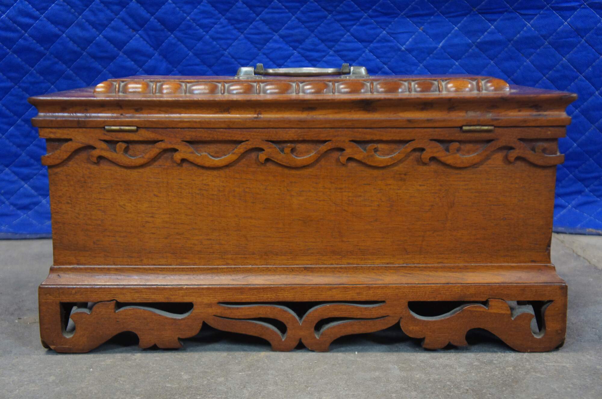 Antique red velvet lined carved and reticulated oak jewelry keepsake box or chest with handle on top and lock on the front.