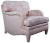 Mid century Donghia Furniture armchair featuring serpentine form with rolled arms, tapered and flared legs, and pink silk floral motif with goose down.
