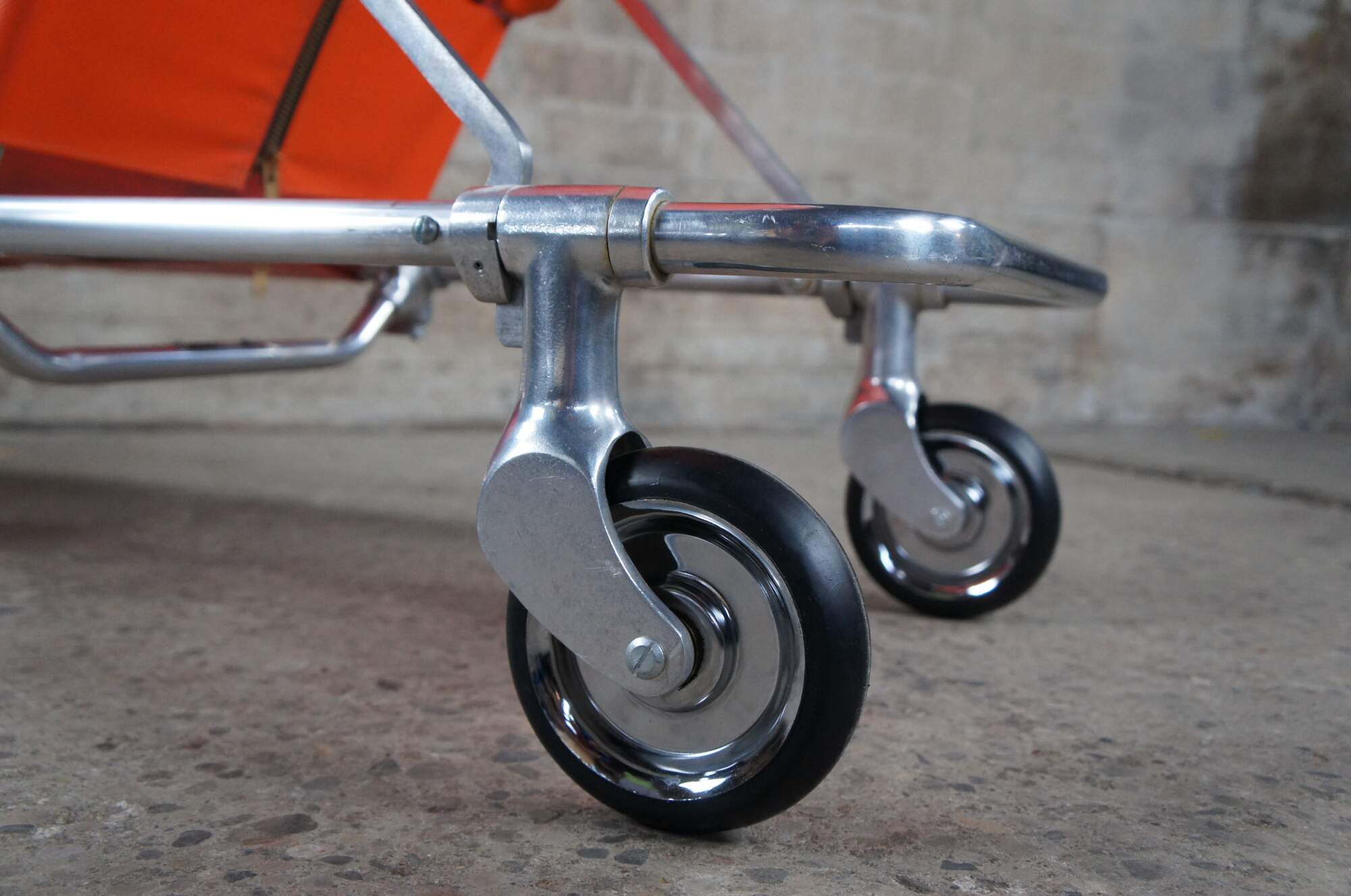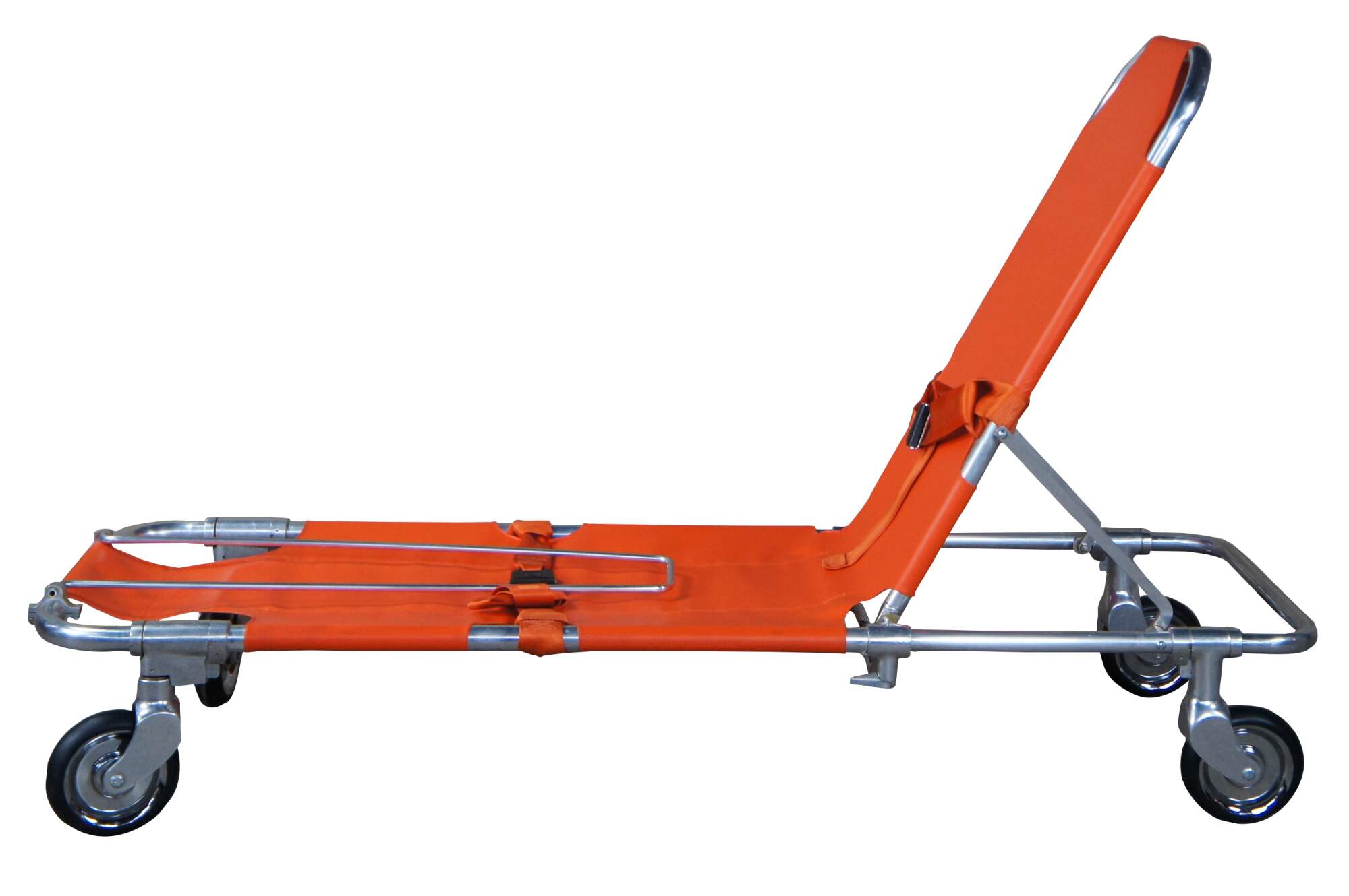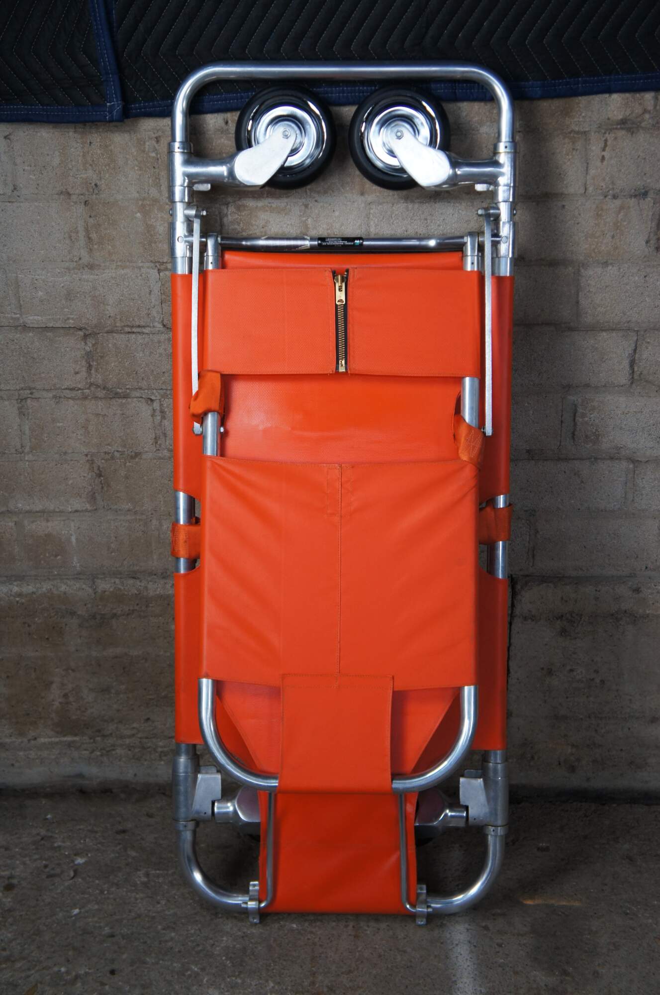 Ferno Washington Inc Emergency Stretcher Gurney Chair with Aluminum Case H 46902. This light weight stretcher is orange in color with steel and aluminum frame. Rolls easily and has immobilization/ safety belts. The unit can be positioned flat, folded or in a chair position.