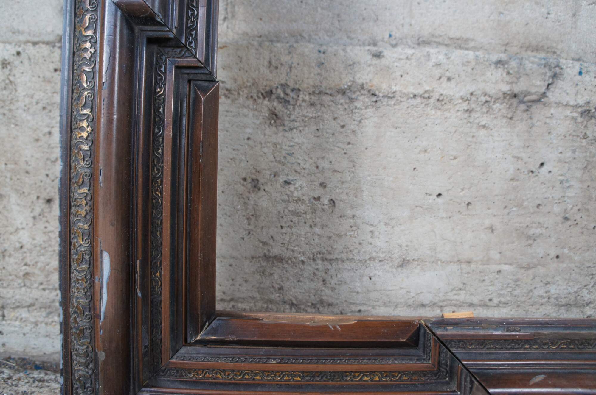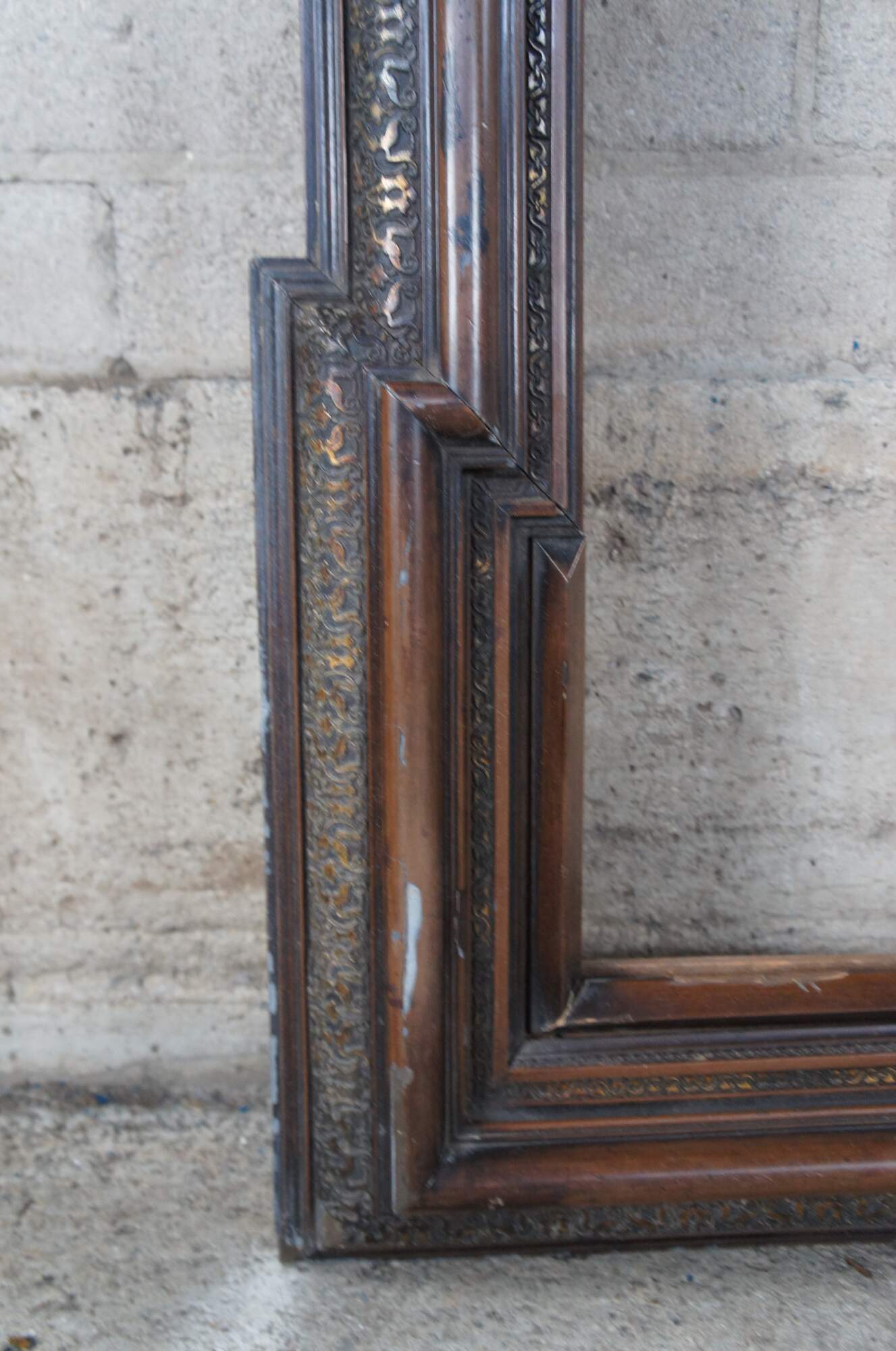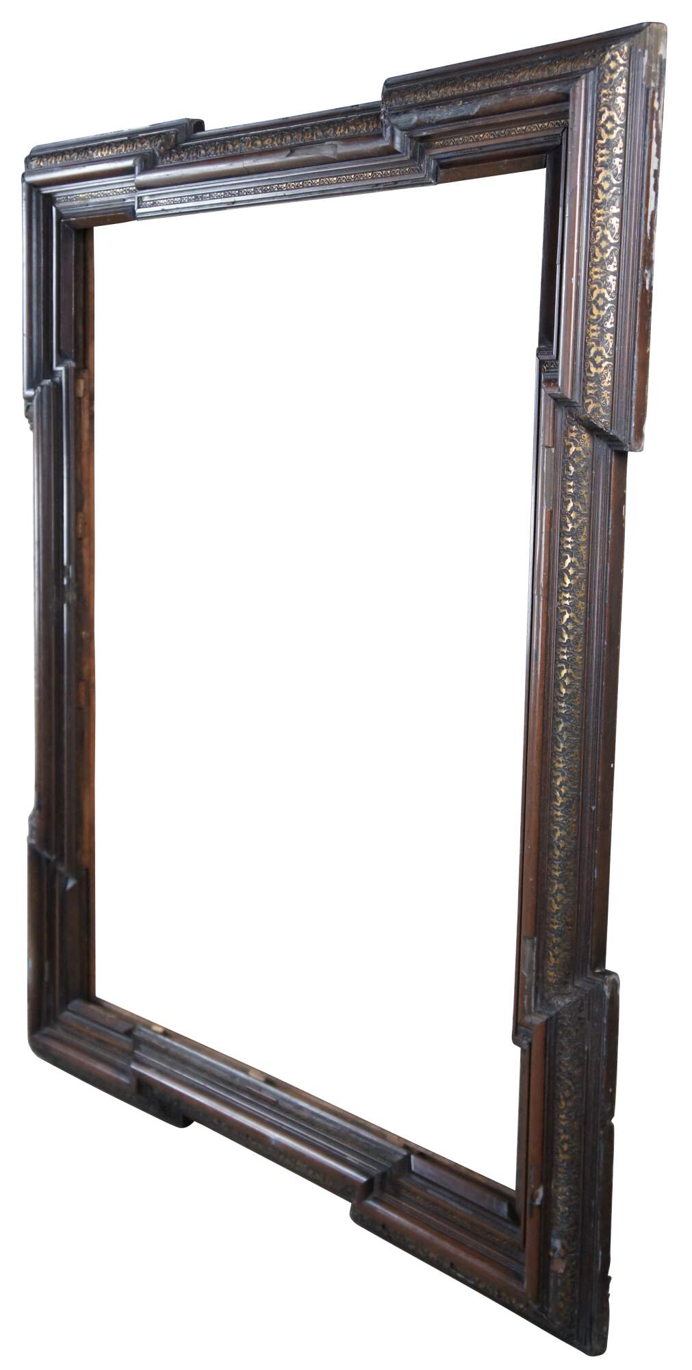 Monumental antique Dutch Baroque frame. Great for use as a mirror or art frame. Made of walnut featuring geometric form with extended corners and ornate carved gilded accents over a layered frame.