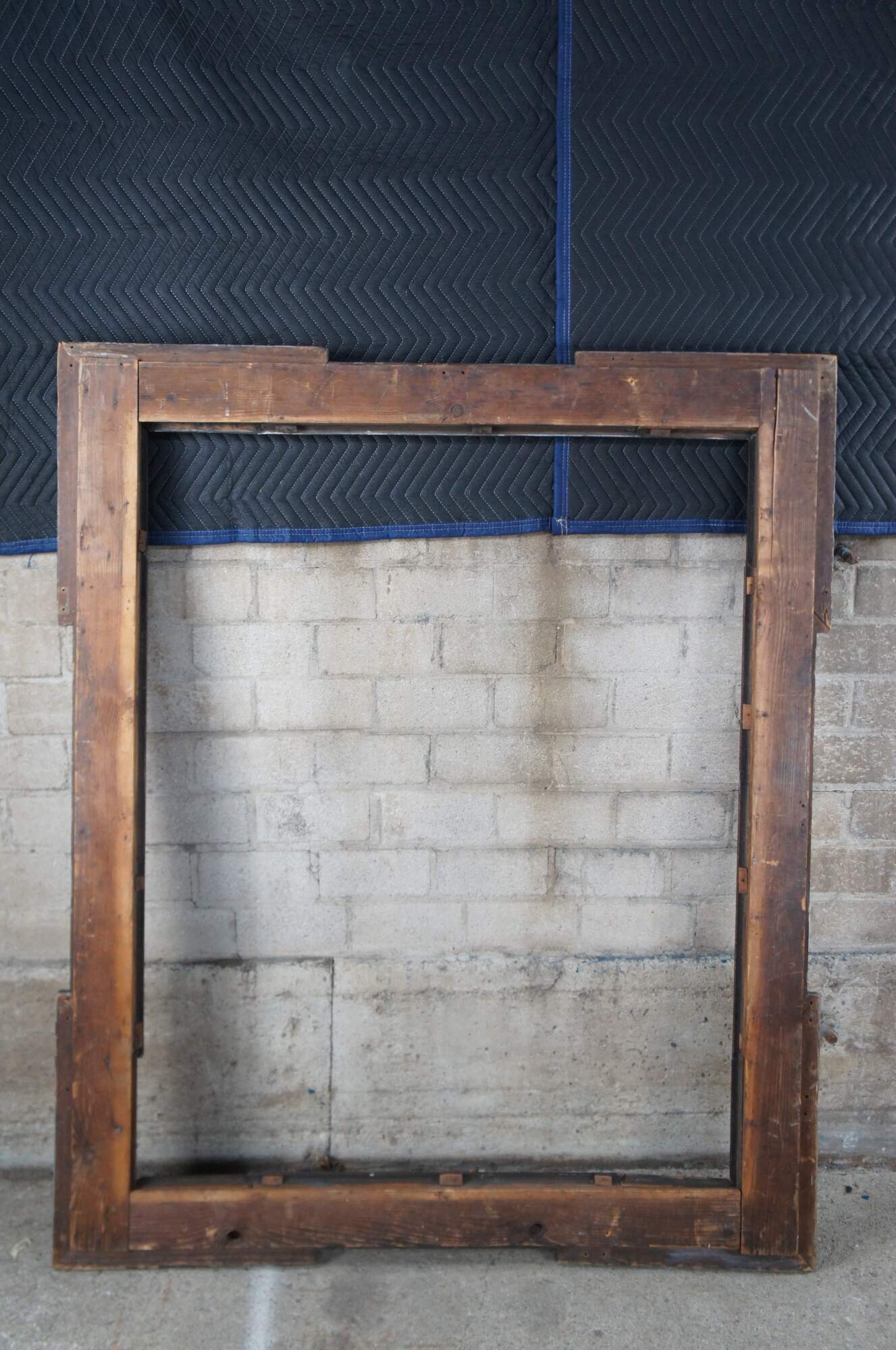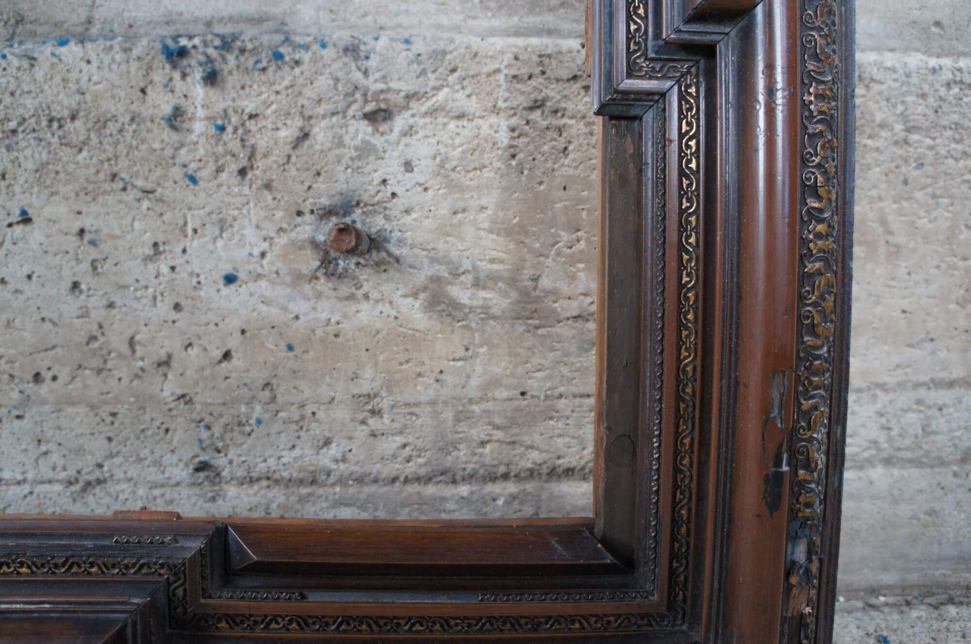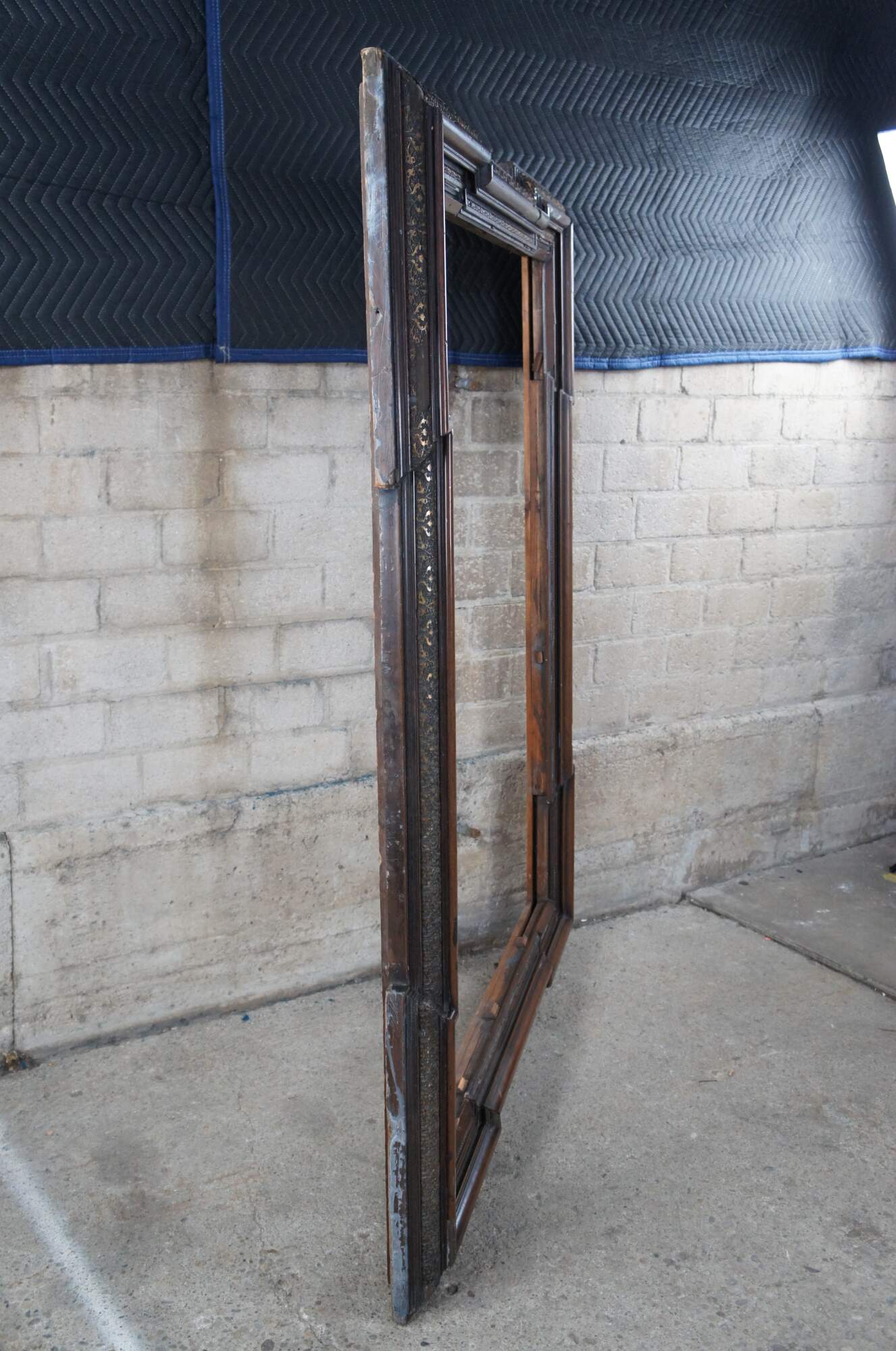 Monumental antique Dutch Baroque frame. Great for use as a mirror or art frame. Made of walnut featuring geometric form with extended corners and ornate carved gilded accents over a layered frame.
