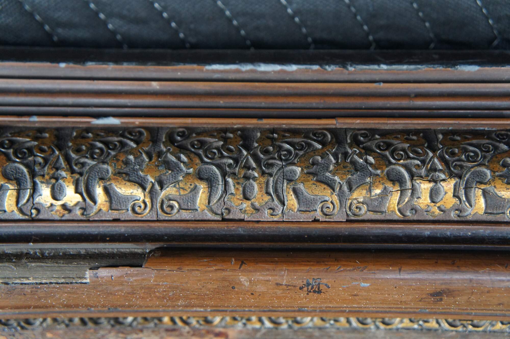 Good antique condition, wear and distressing commensurate with age and use, finish loss, marking and missing trim.