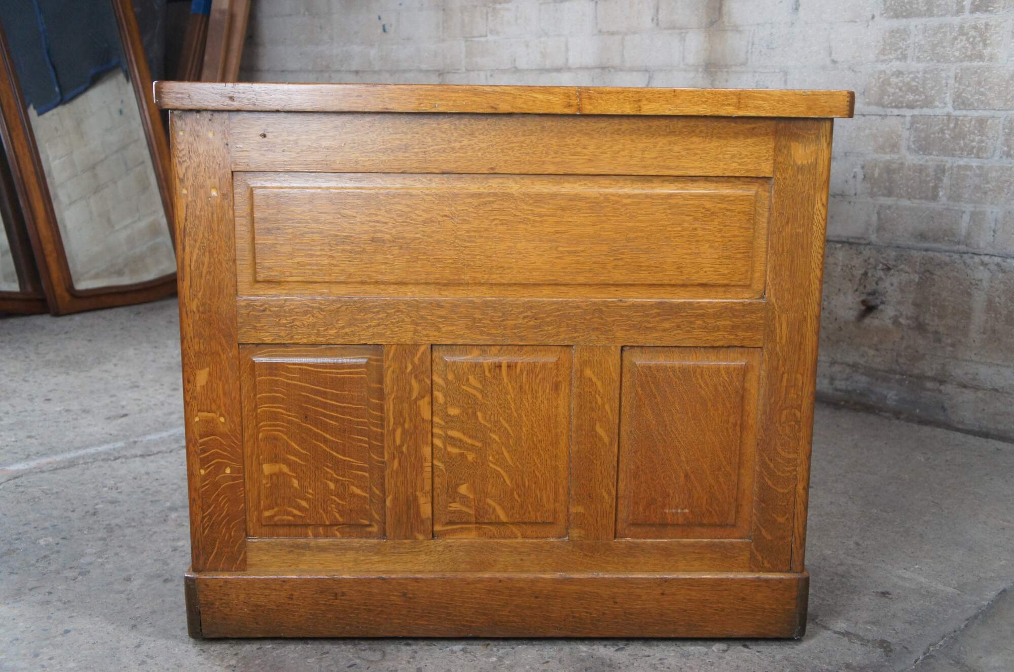 Antique late victorian oak executive desk. Made of quartersawn oak featuring rectangular form with paneled exterior, large central drawer flanked by six drawers, one file cabinet drawer and two pull out writing surfaces.