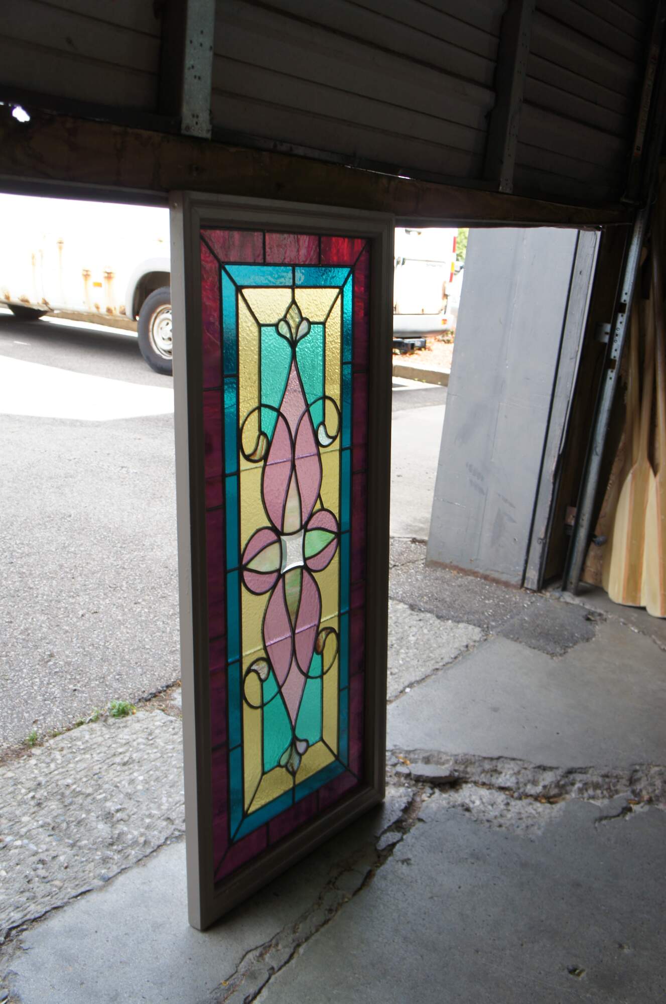 Beautiful antique Victorian leaded stained glass window panel. A geometric blend of amber, purple, greens and pink. Framed in gray and ready to hang.