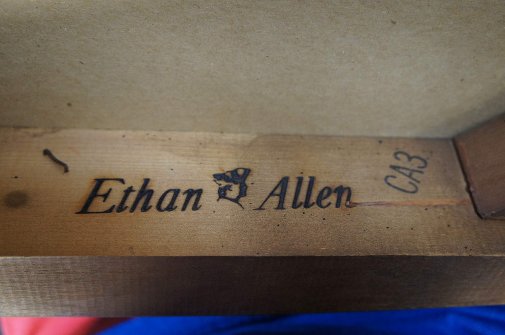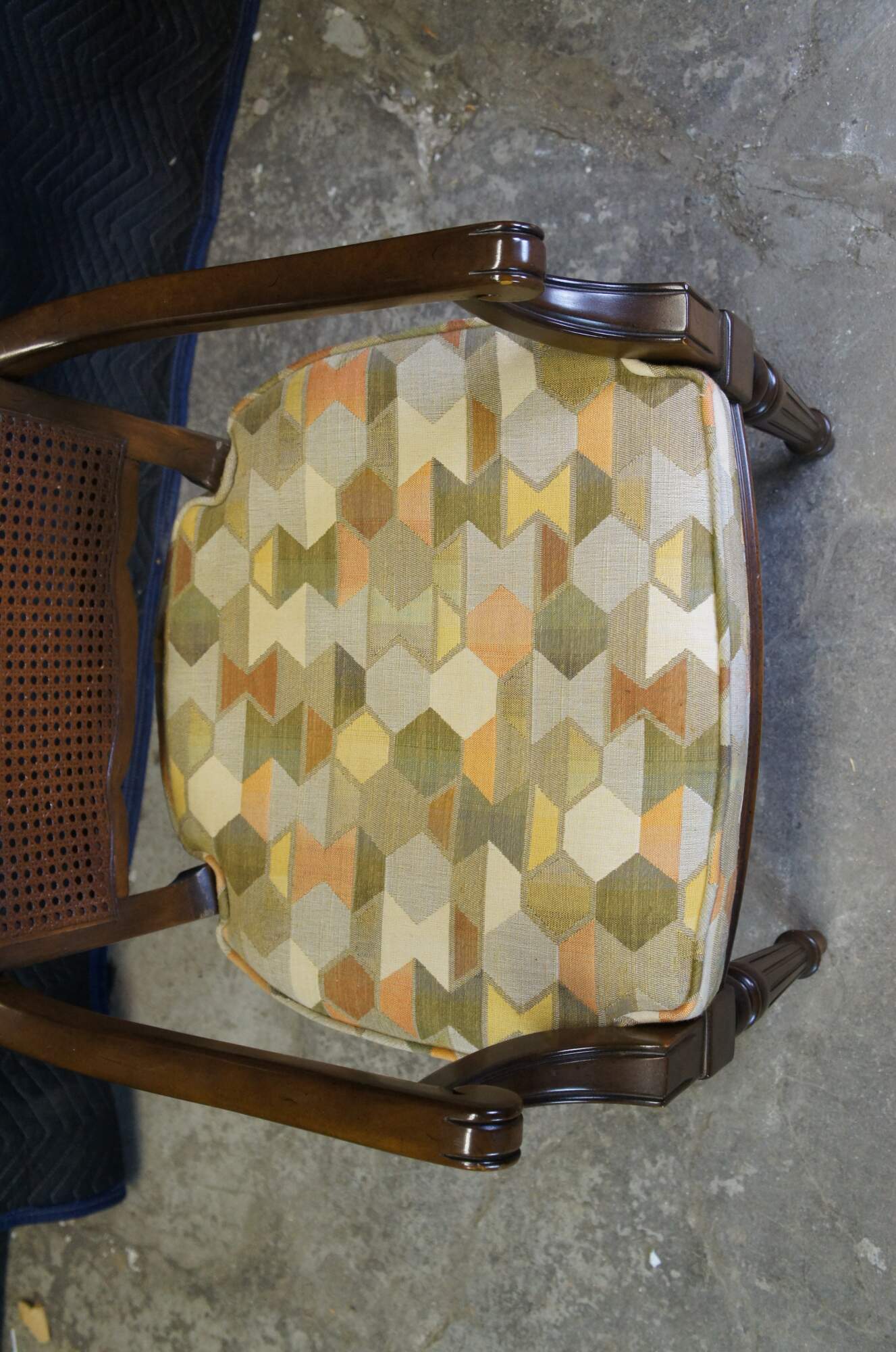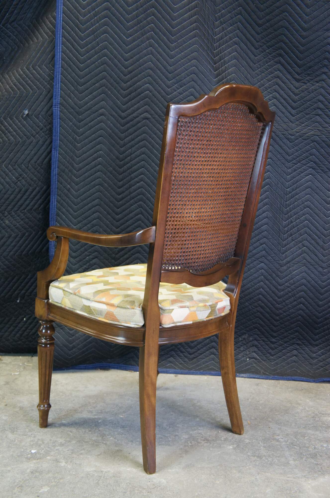 Six Vintage Ethan Allen Classis Manor dining chairs, circa 1970s. Made of solid maple featuring caned back with fluted and tapered accents and geometric / hexagon upholstery. Includes two arms and four sides. 15-6012. A rich blend of French Country and Louis XVI styling.