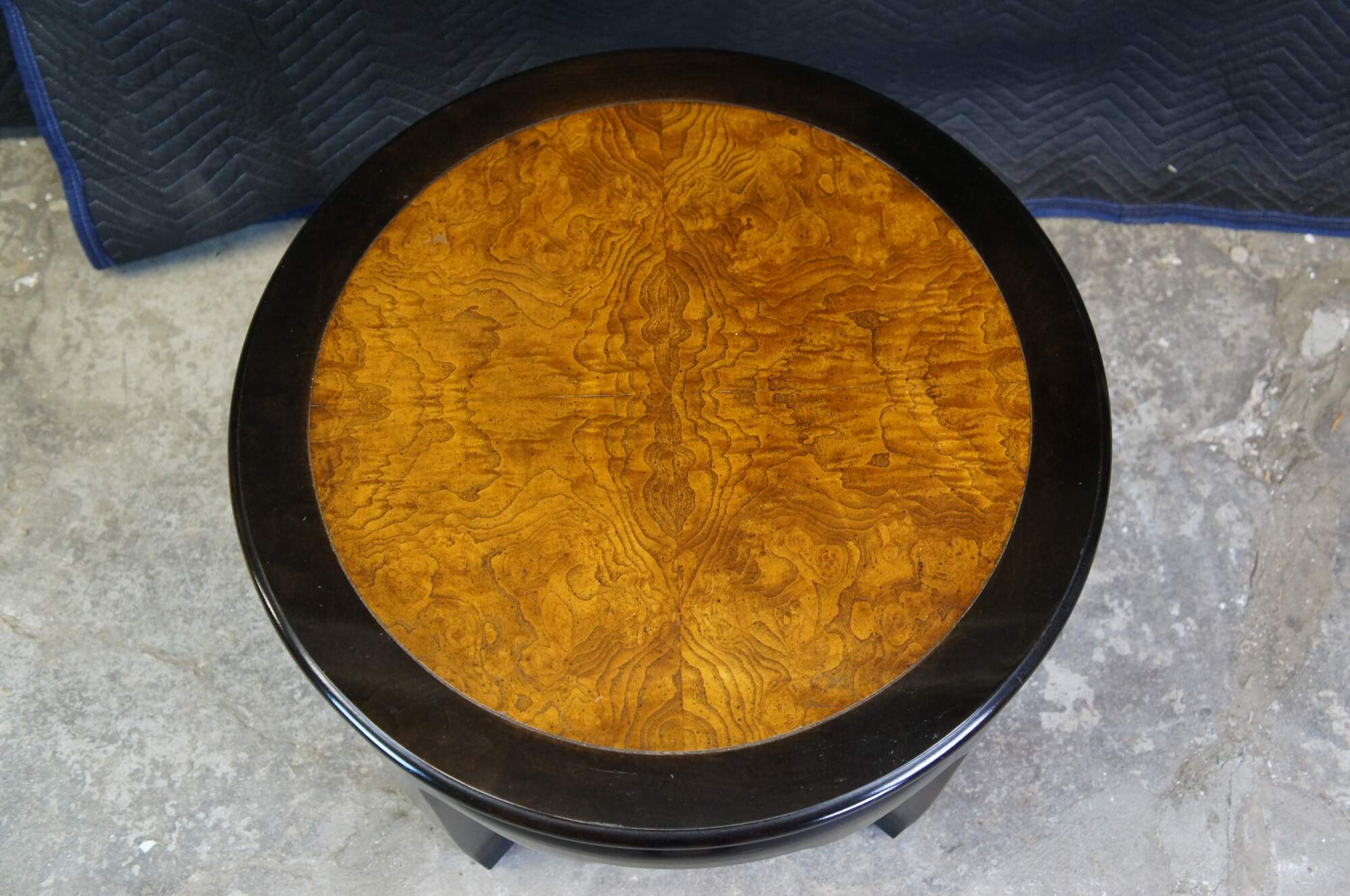 Vintage Century Furniture Chin Hua collection table. Made of burl wood and black lacquer featuring round form with chinoiserie / Ming styling.