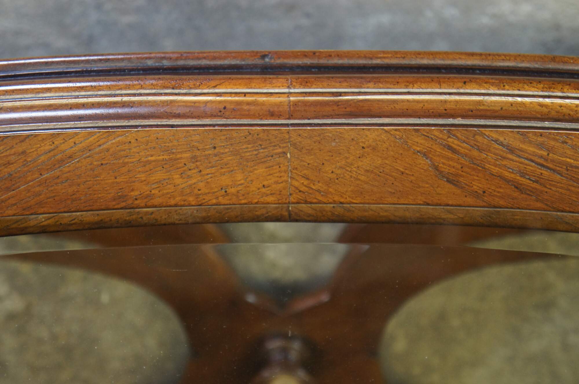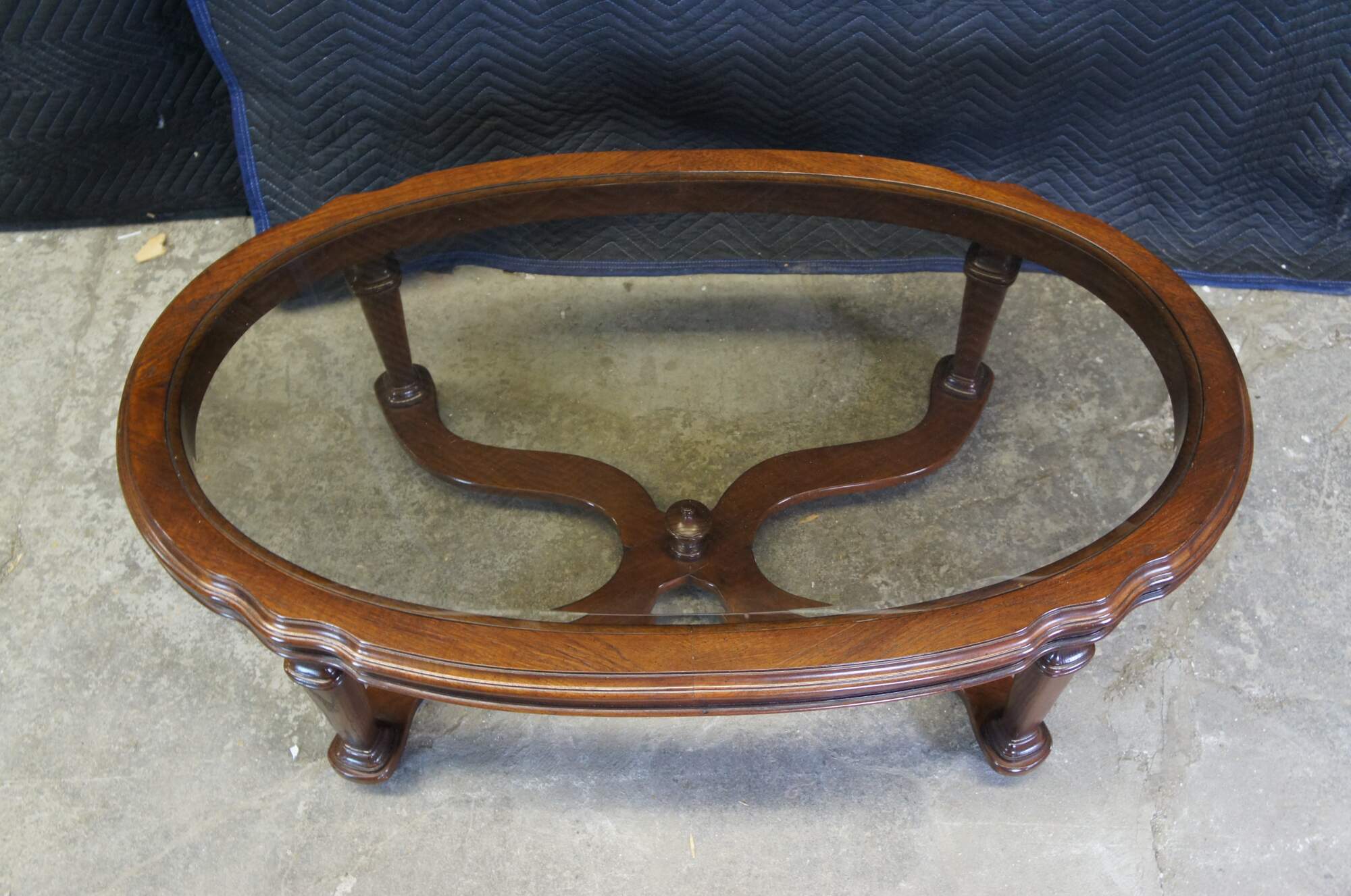 Ethan Allen Oval Cocktail Table, Circa 1984. Features an oval form with beveled lightly smoked glass, serpentine stretcher and central finial. 13-851