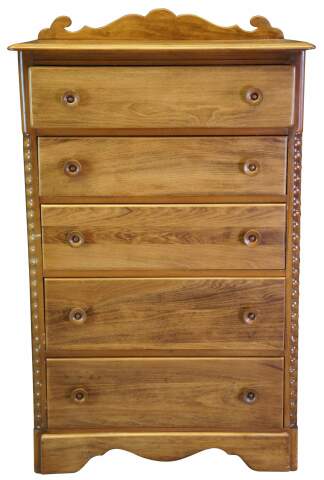 Early American inspired oak dreser, circa 1960s. Features 5 dovetailed drawers with quarter cut ribbed sides and ornate backsplash.