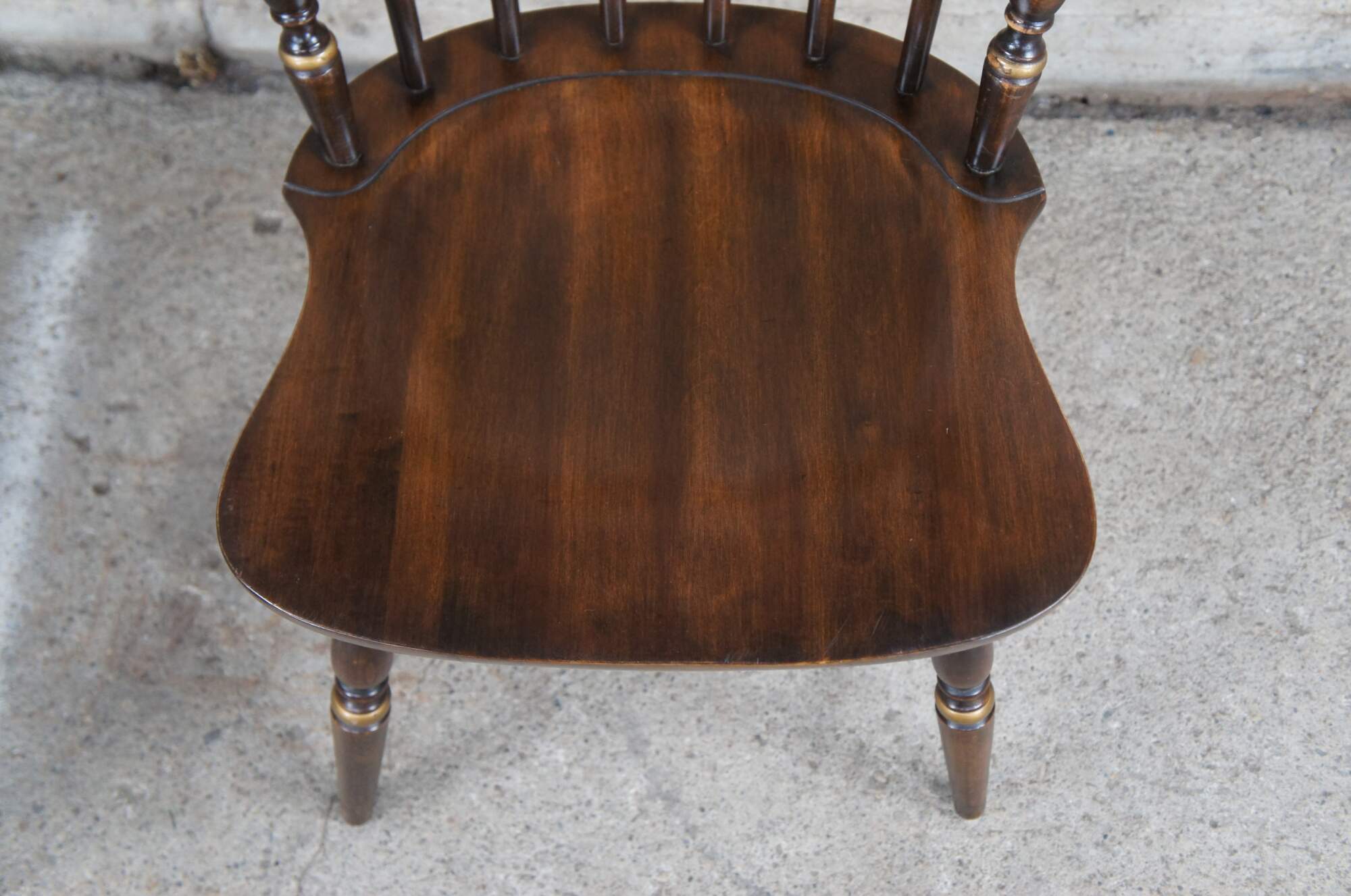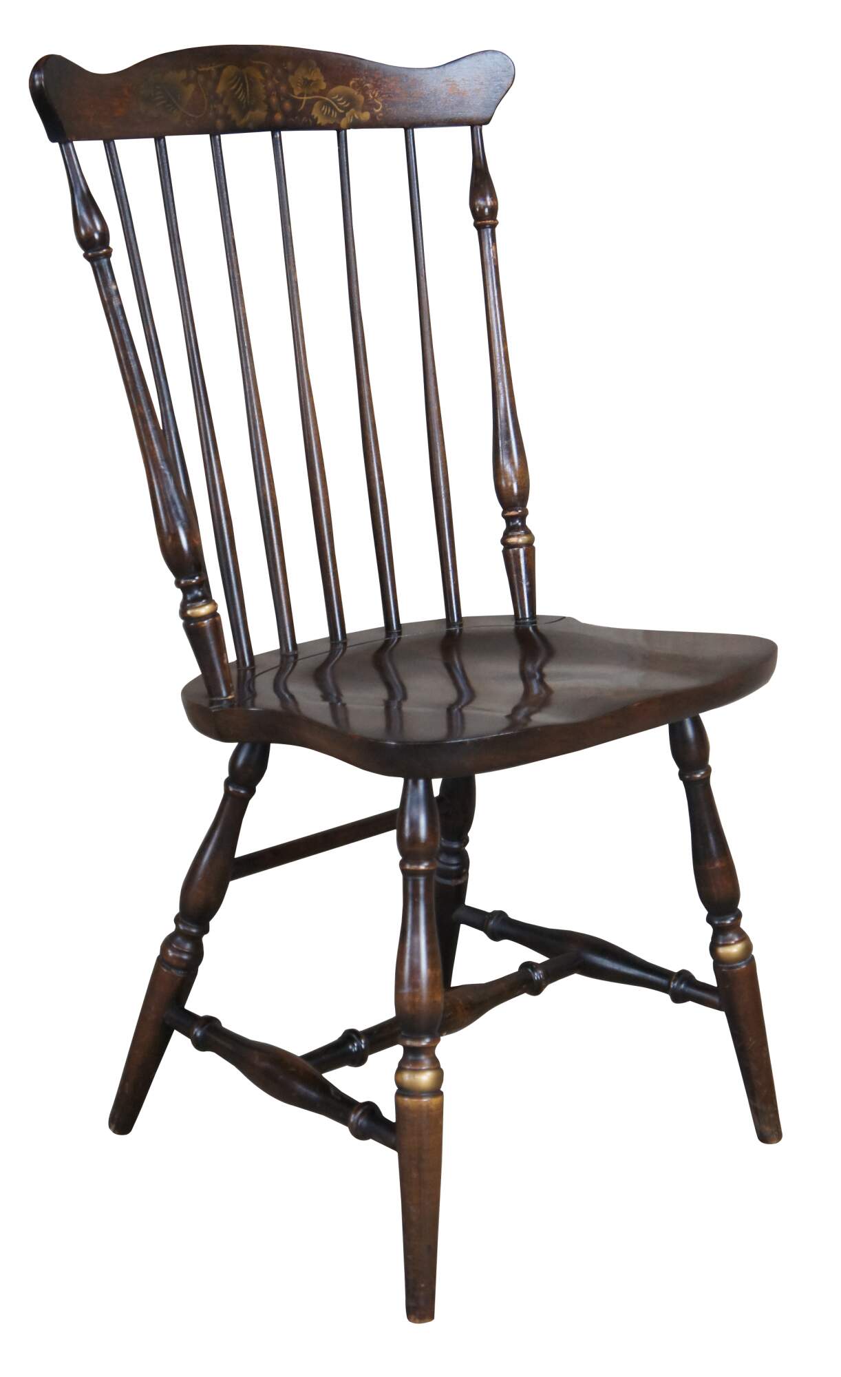 The raw assembled frames were painted black or dark green and received a first coat of clear finish. While the finish was still slightly tacky Hitchcock borrowed the newly developed British technique of “stenciling” to richly decorate the otherwise rather plain chairs. Using a variety of metal stencils, as many as five different ones on a single chair, different colors of metallic powders were applied by brush to produce the mostly floral designs seen on the ubiquitous “Hitchcock” chair of the 1820s. To further reduce the cost, Hitchcock used laborers from a nearby prison to weave cane and rush seats for his chairs.