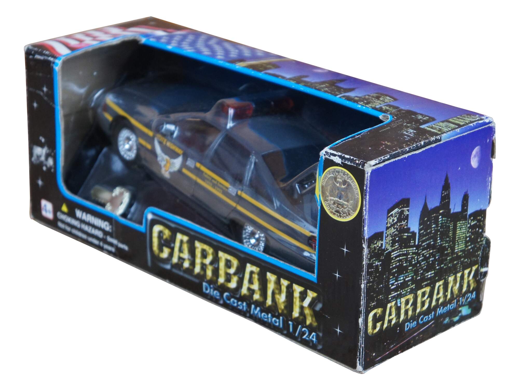 Vintage old stock new in box die cast metal state highway patrol car (Ohio Edition) fashioned into a bank with key that unlocks an opening in the bottom in 1/24 scale. Circa 1997 by Golden Wheel Die Casting FTY LTD, Hong Kong.