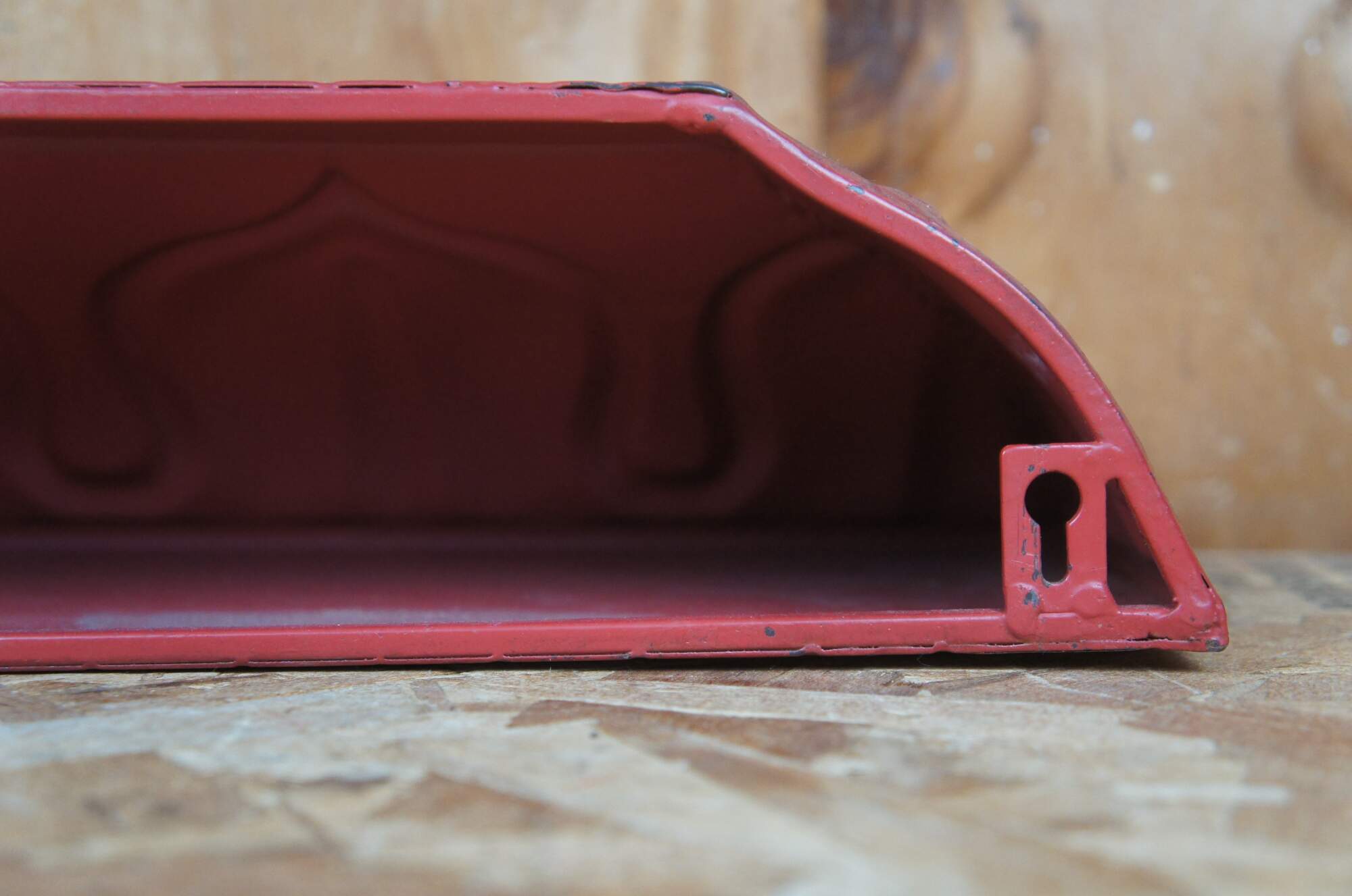 Vintage red painted floating metal wall socnce or display shelf featuring ornate pressed design