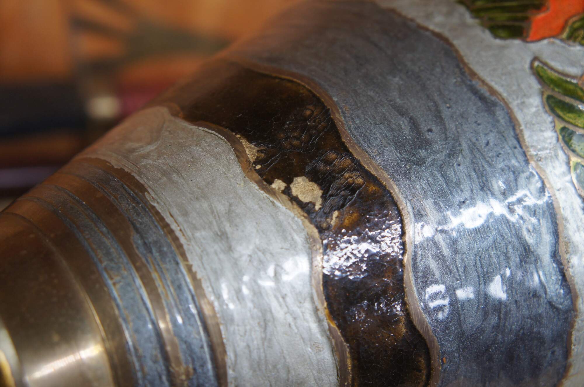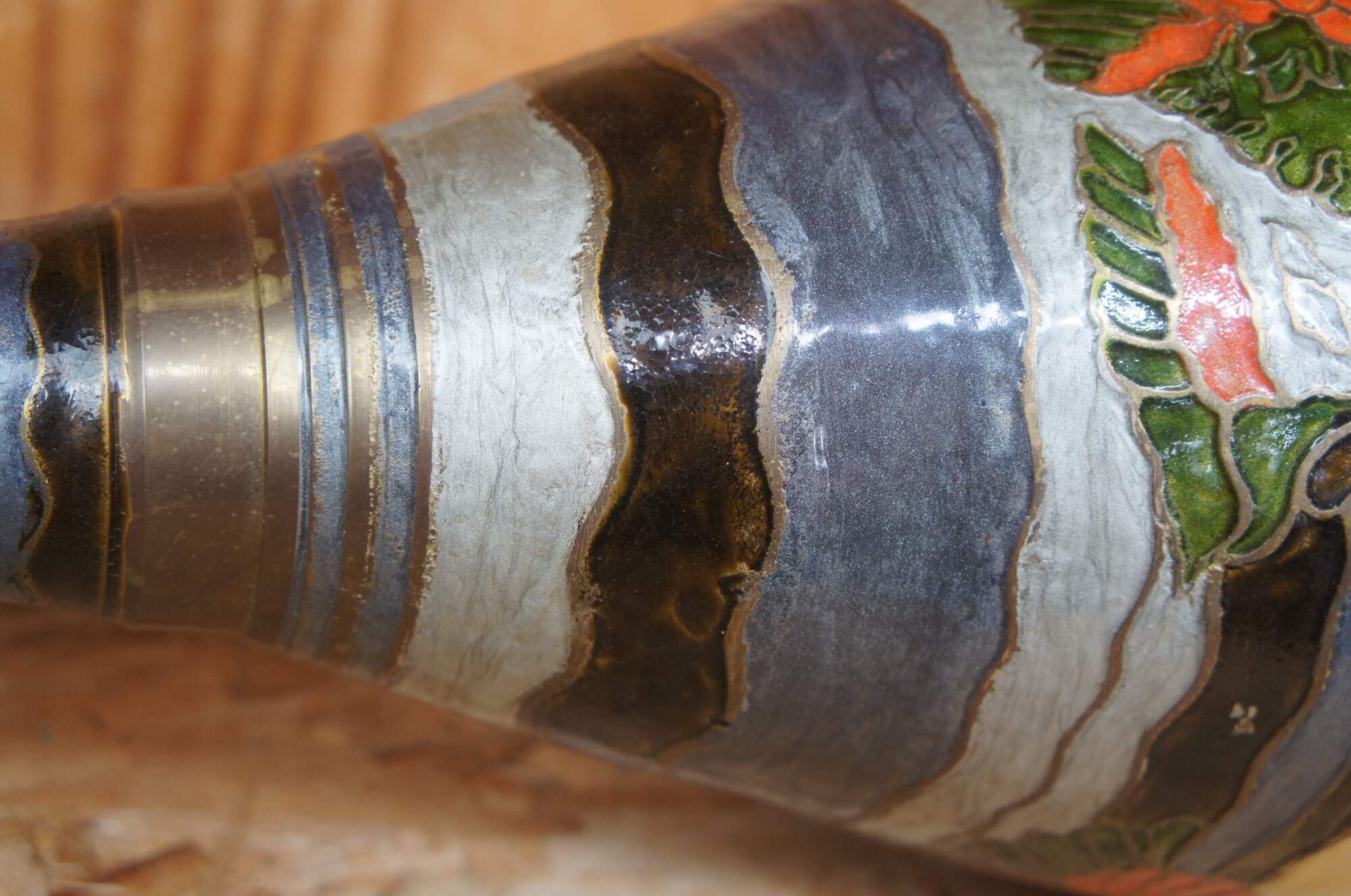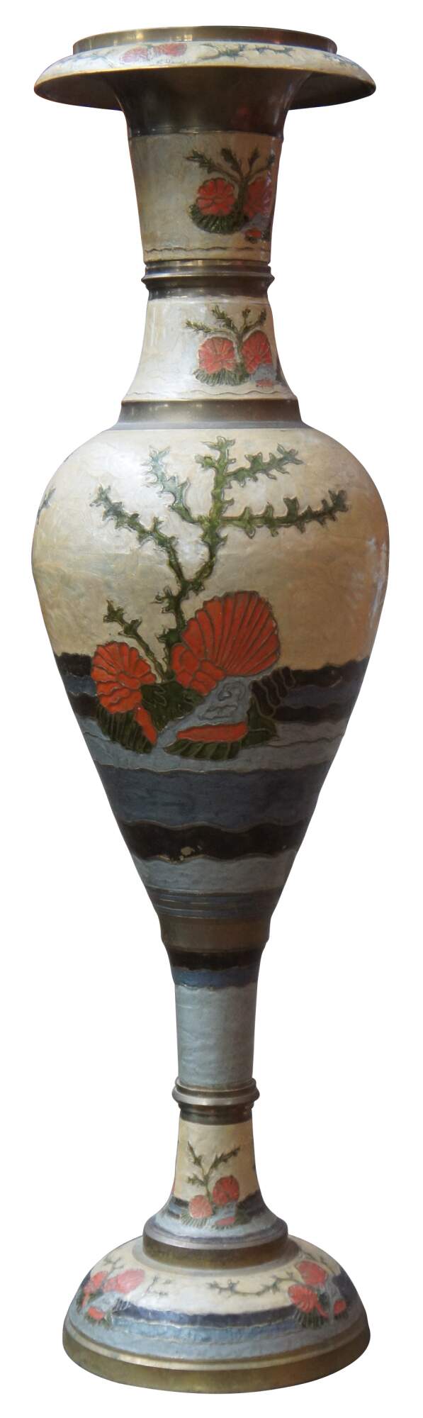 Tall vintage brass vase or urn featuring muted earth tones in enamel. Made in India.