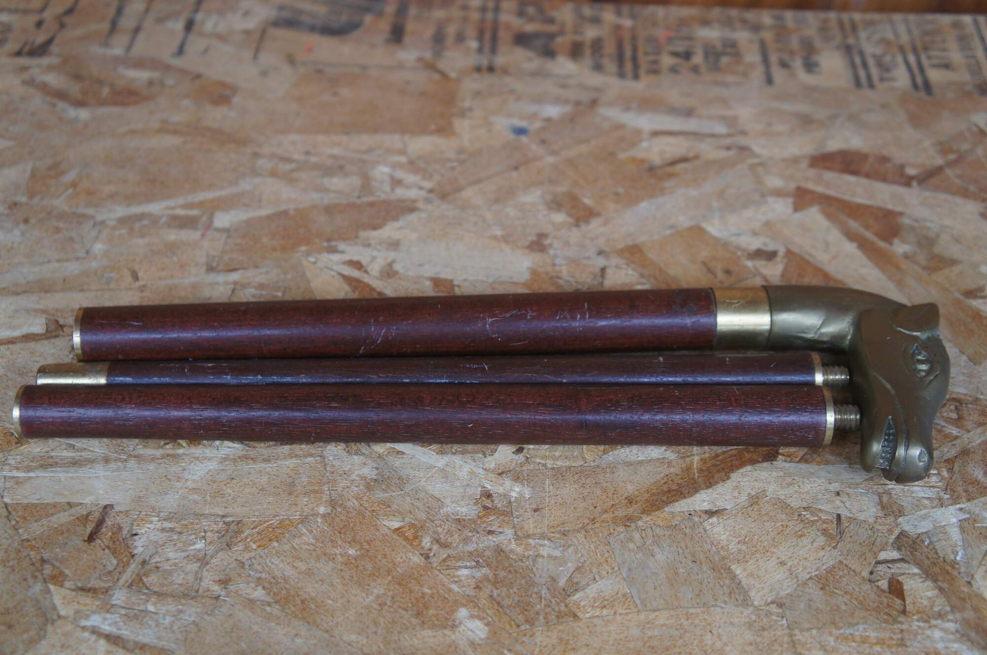 Vintage mahogany walking stick features a brass horse head and can be unscrewed into three pieces.