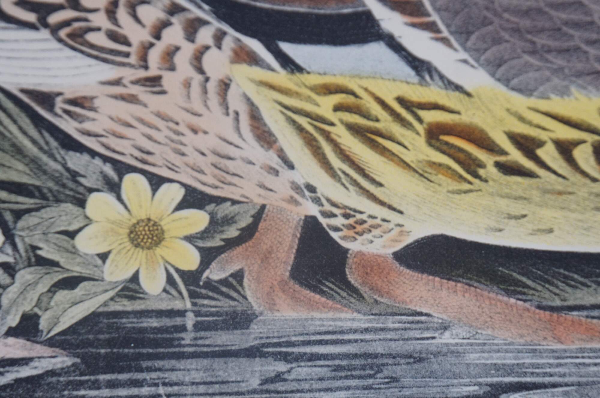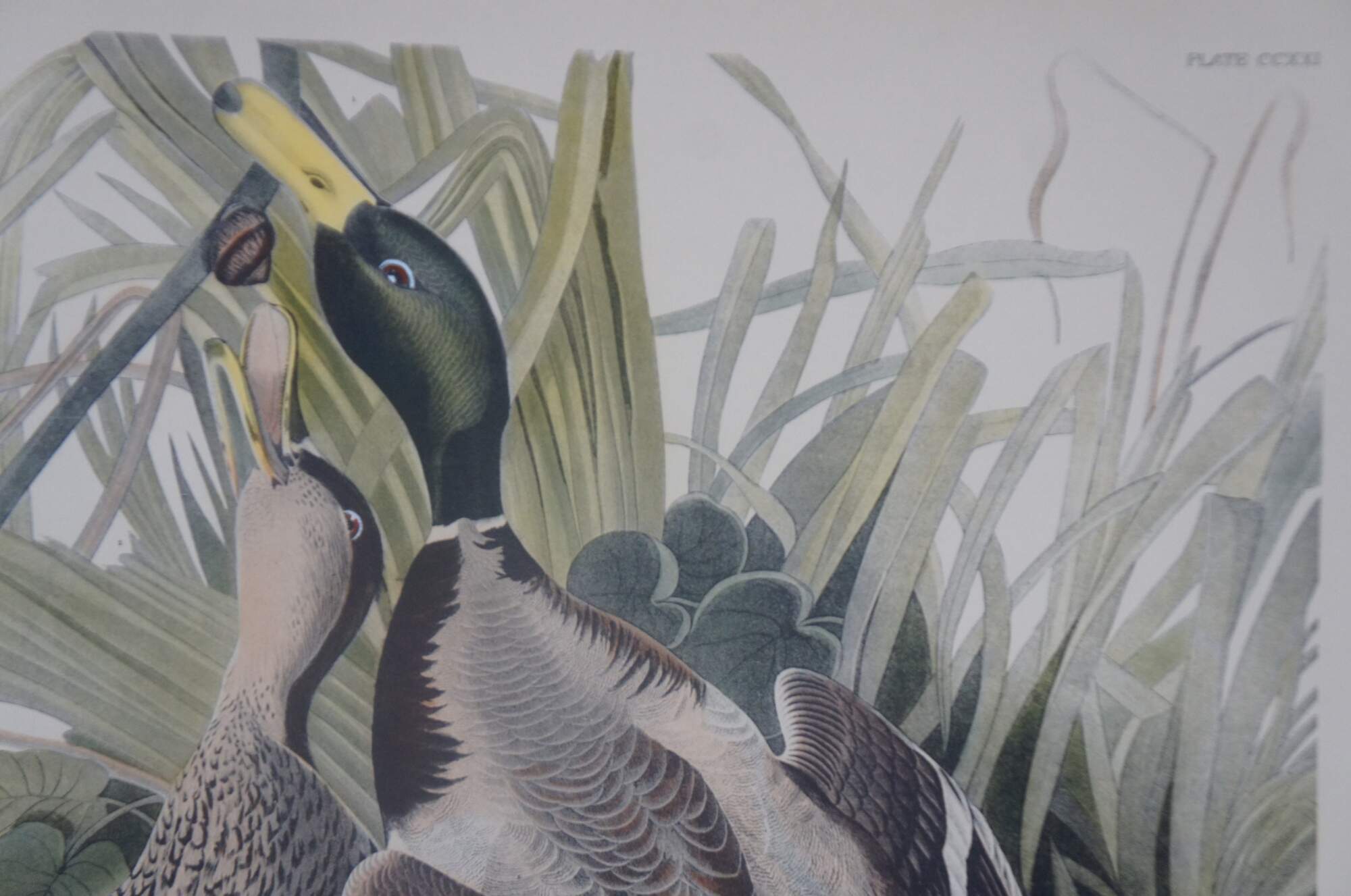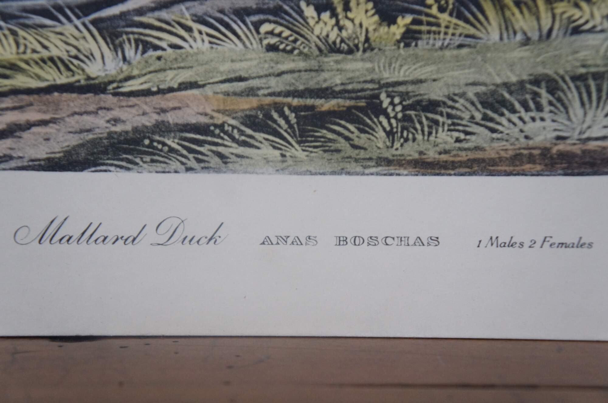 20th century Robert Havell colored engraving featuring two pairs of Mallard Ducks drawn by J.J Audubon. “Born in Reading, England, Robert Havell (1793-1878) was the son of an engraver, and was expected to follow that profession. Fulfilling his destiny, he is remembered for his aquatint engraving of all but the first 10 plates of John James Audubon's Birds of America. He first visited Audubon in 1839 in New York City and traveled and sketched the countryside in a homemade horse-drawn trailer, and together they had skills that were well met. He also did artwork in oil and watercolor in Hudson River style with Luminism. However, he preferred to think of himself as an engraver.