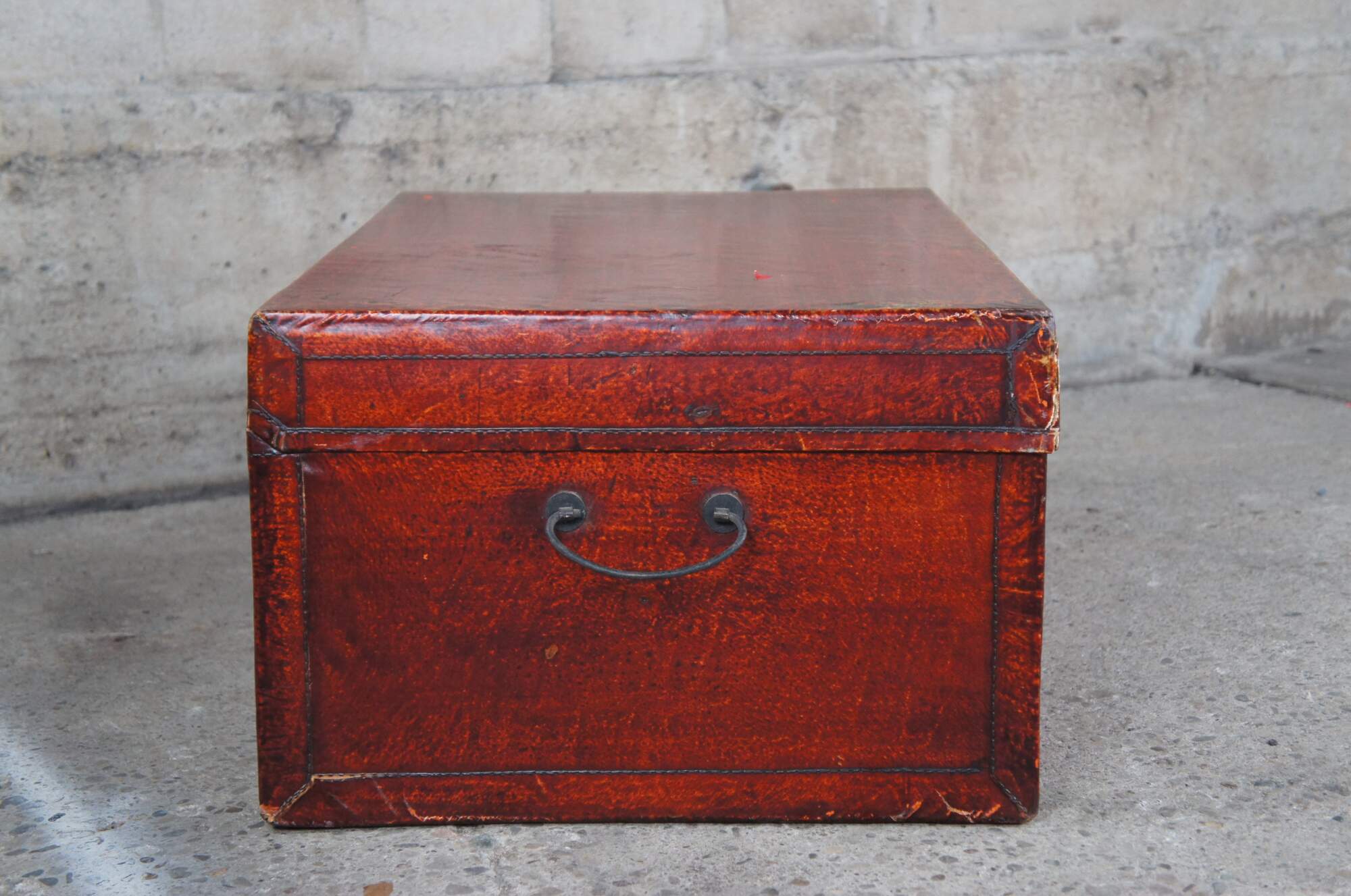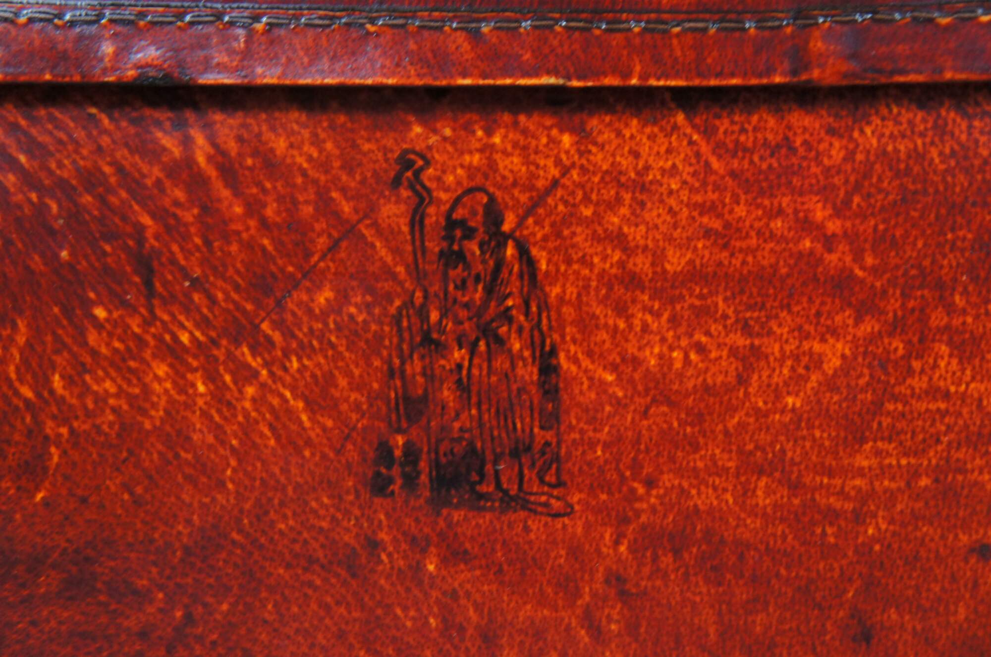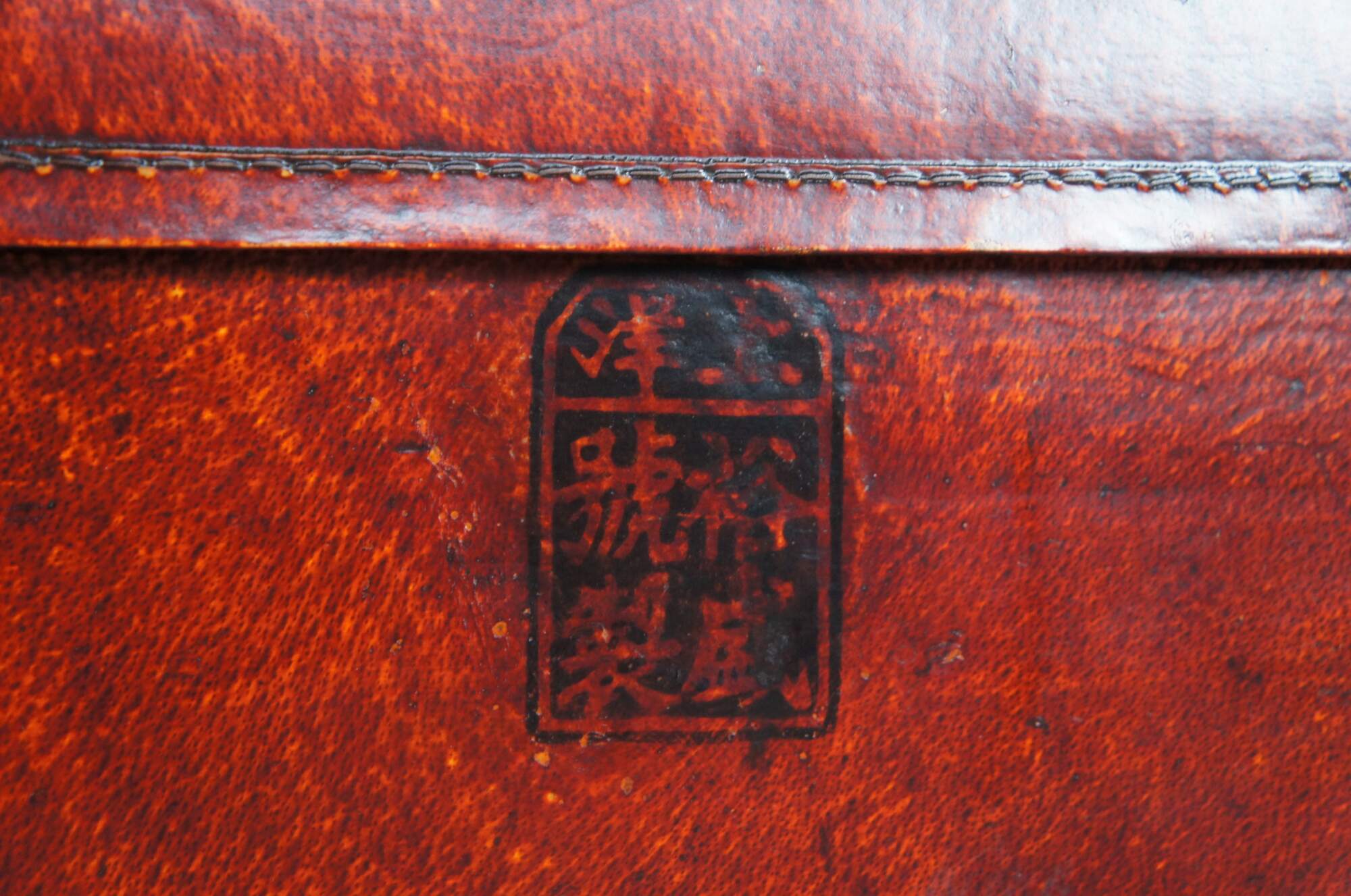 Vintage red leather storage trunk. Rectangular form with ming inspired brass clasp along the front and handles along the side. Features a black stamp to the right of the clasp and fu Sanxing God of Porsperity figure stamped to the left.