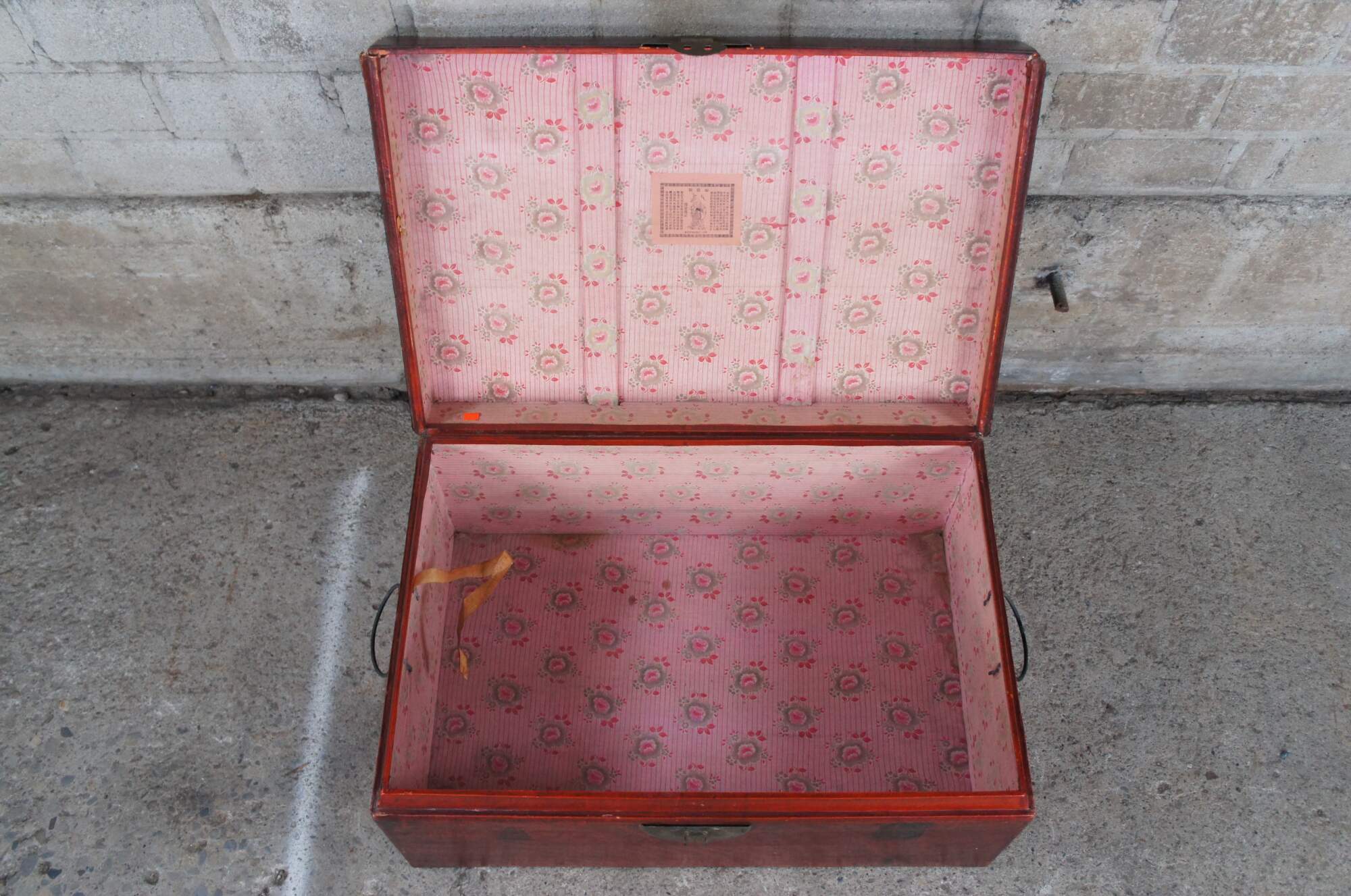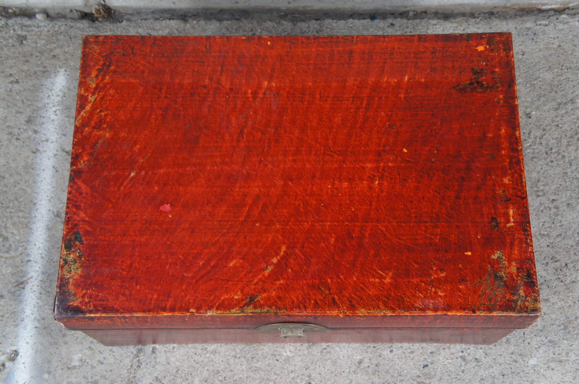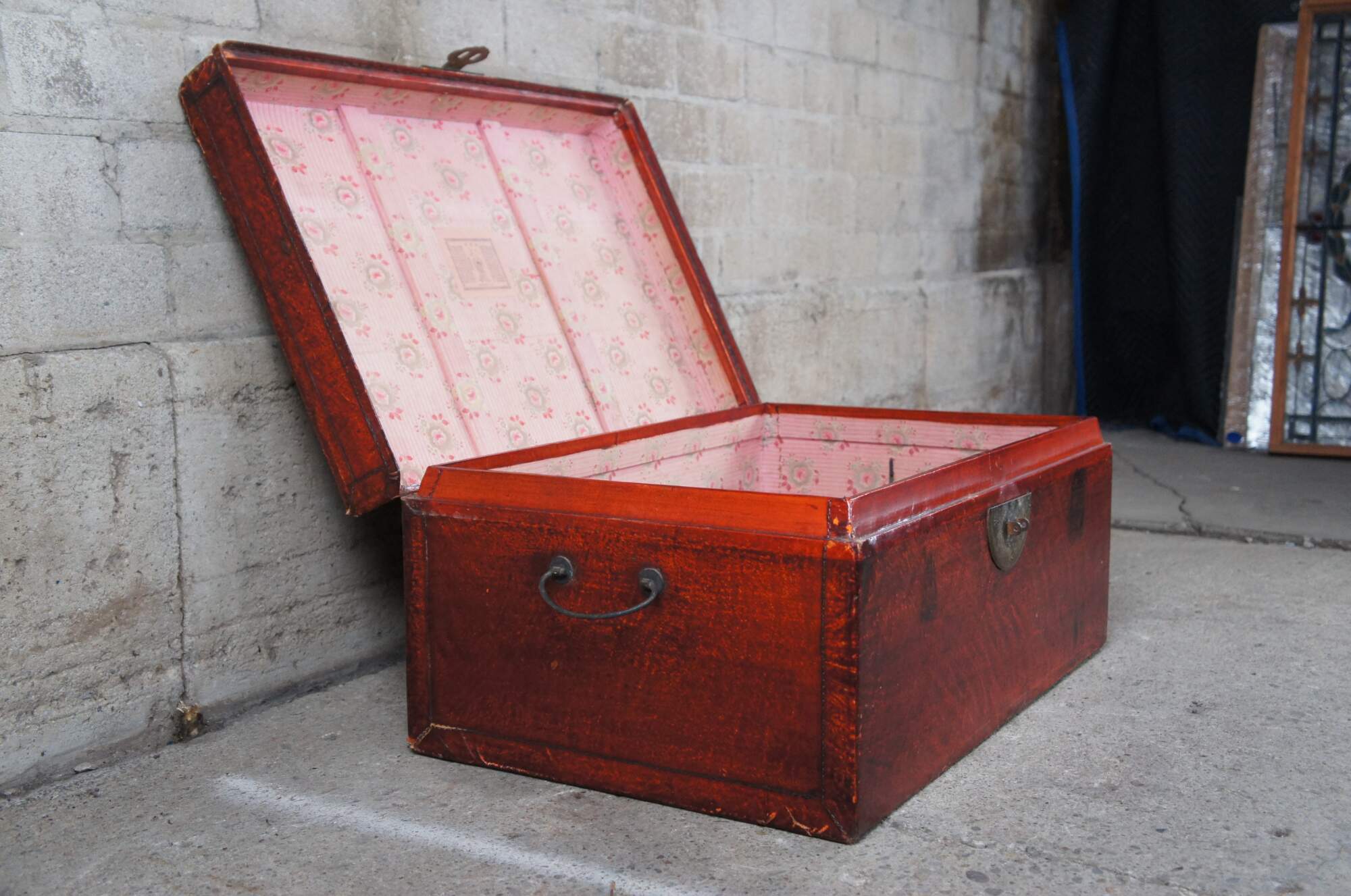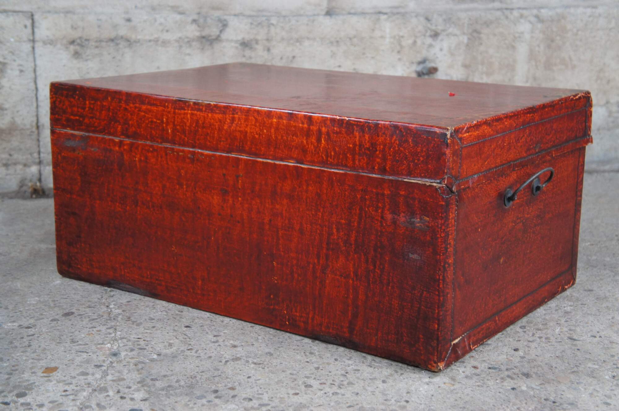 Vintage red leather storage trunk. Rectangular form with ming inspired brass clasp along the front and handles along the side. Features a black stamp to the right of the clasp and fu Sanxing God of Porsperity figure stamped to the left.