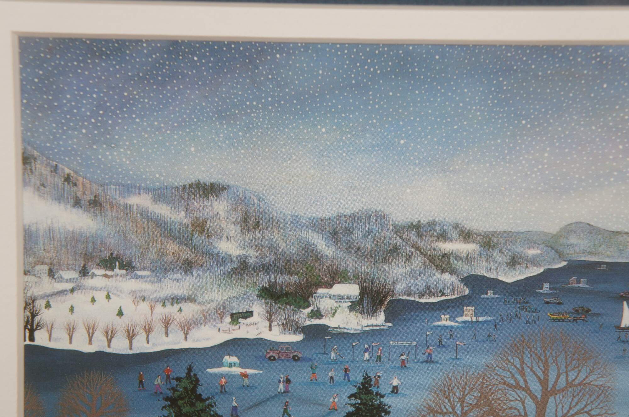 Framed mixed media on Masonite titled ‘Winter Carnival, Cooperstown, New York’ by Janet Munro. Featuring a frozen lake in Cooperstown New York (Attributed to Blackbird Bay..) with snow, sleighs, skiing, fishing, and other carnival activities.
