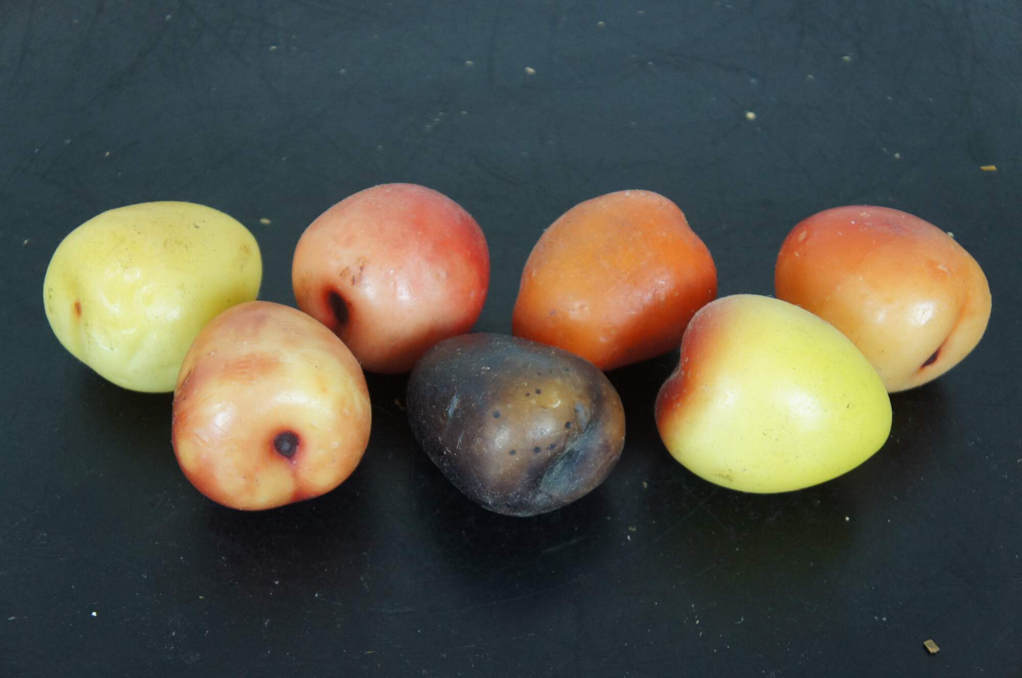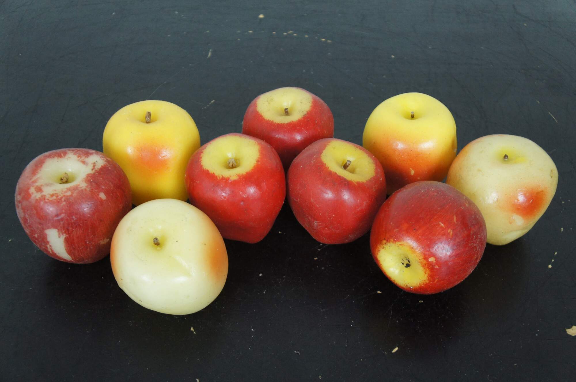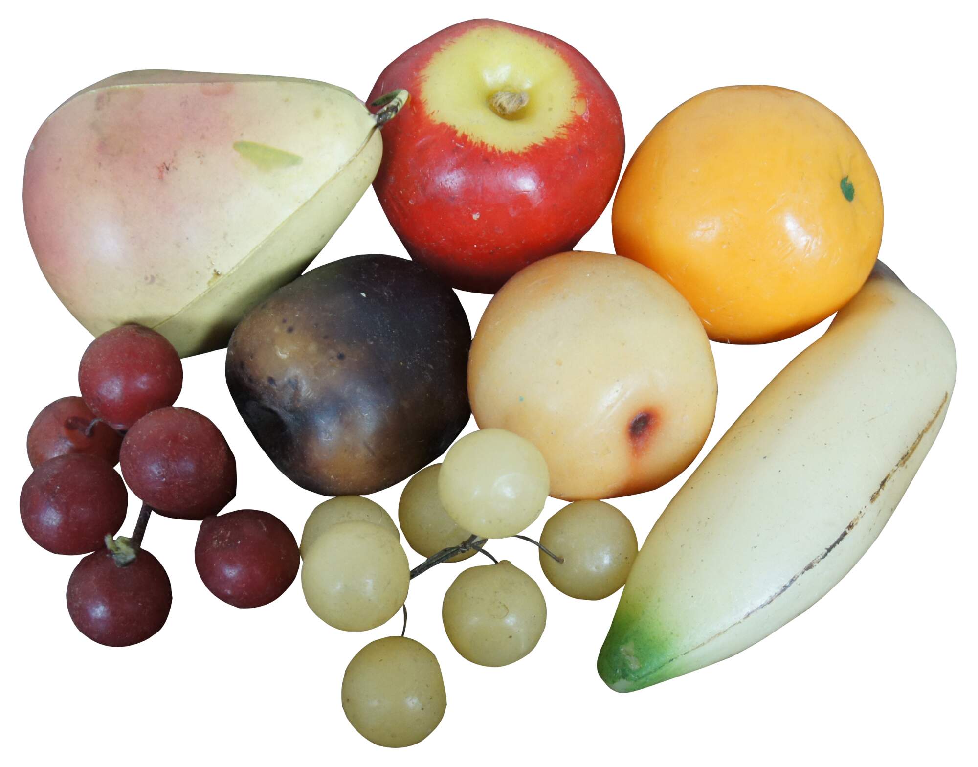 Lot of 40 pieces of wax fruit featuring apples, pears, peaches, oranges, bananas and grapes. One pear is plastic covered polystyrene.