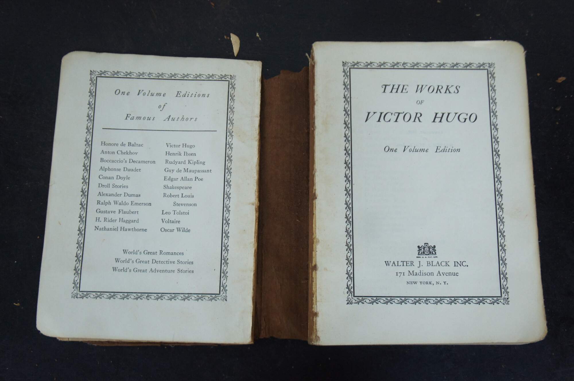 Antique leather cover copies of “The Works of Victor Hugo” and “The Works of Leo Tolstoi” in one volume editions, published by Walter J. Black 1928.