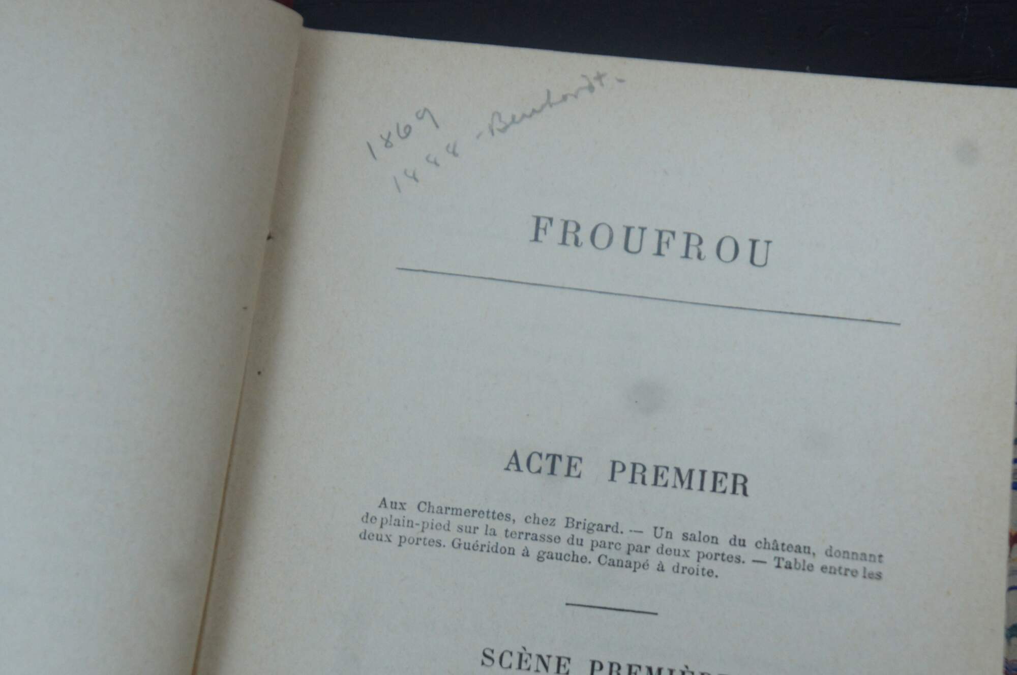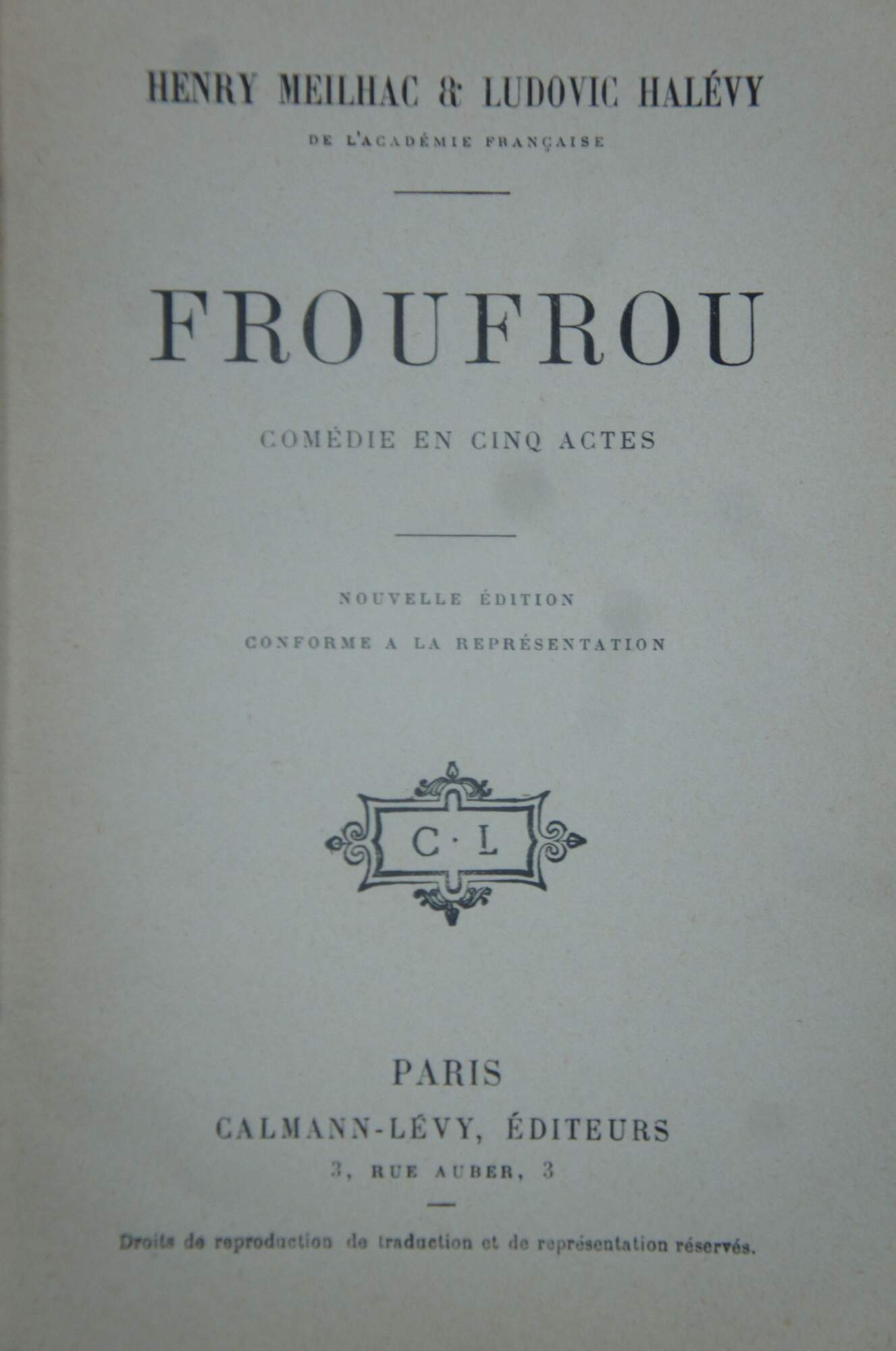 Antique late 19th century French language hard cover copy of “Froufrou: Comedie en Cinq Actes” (Froufrou: A Comedy in Five Acts) by Henry Meilhac & Ludovic Halevy, published by Calmann-Levy.