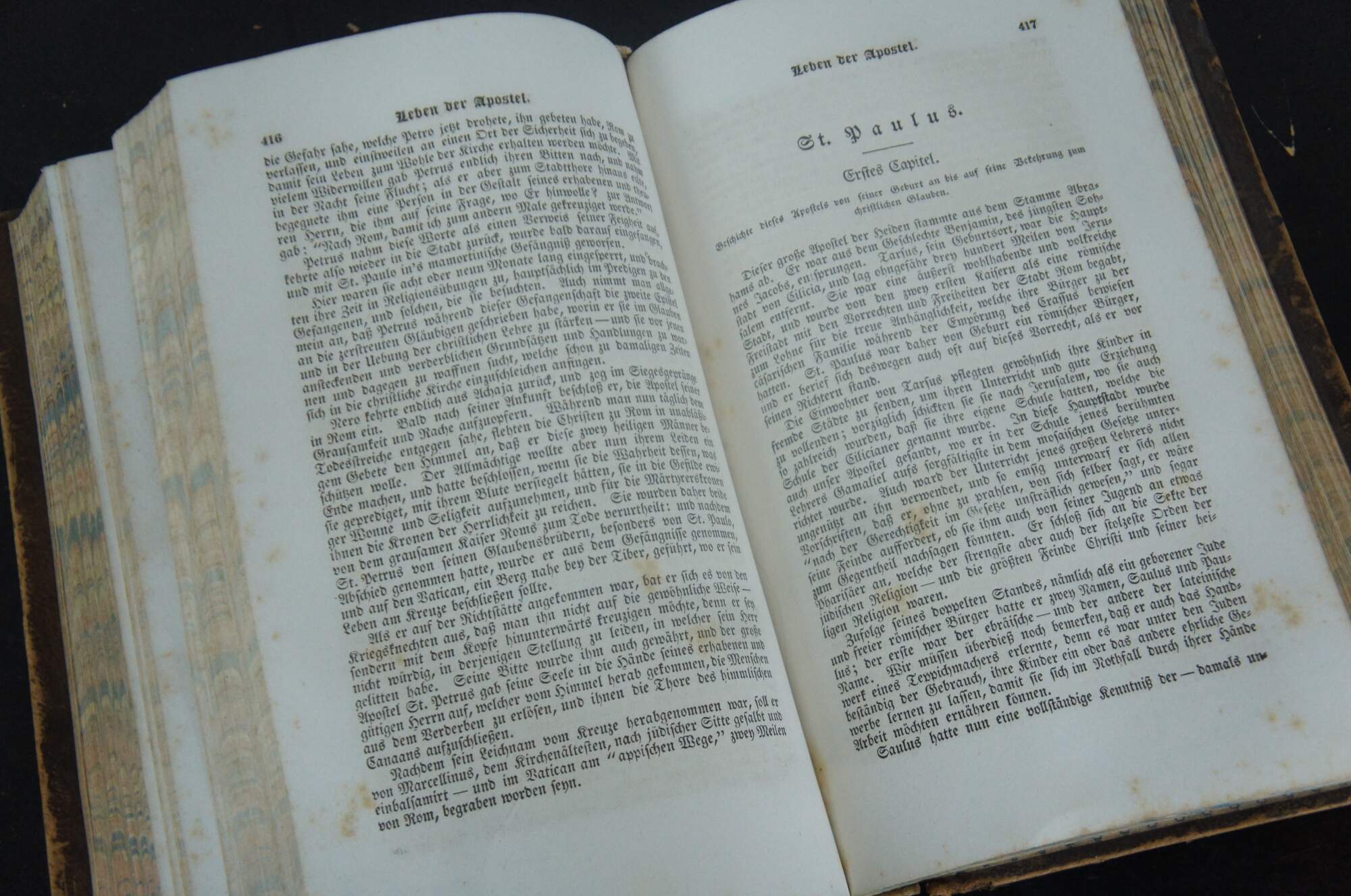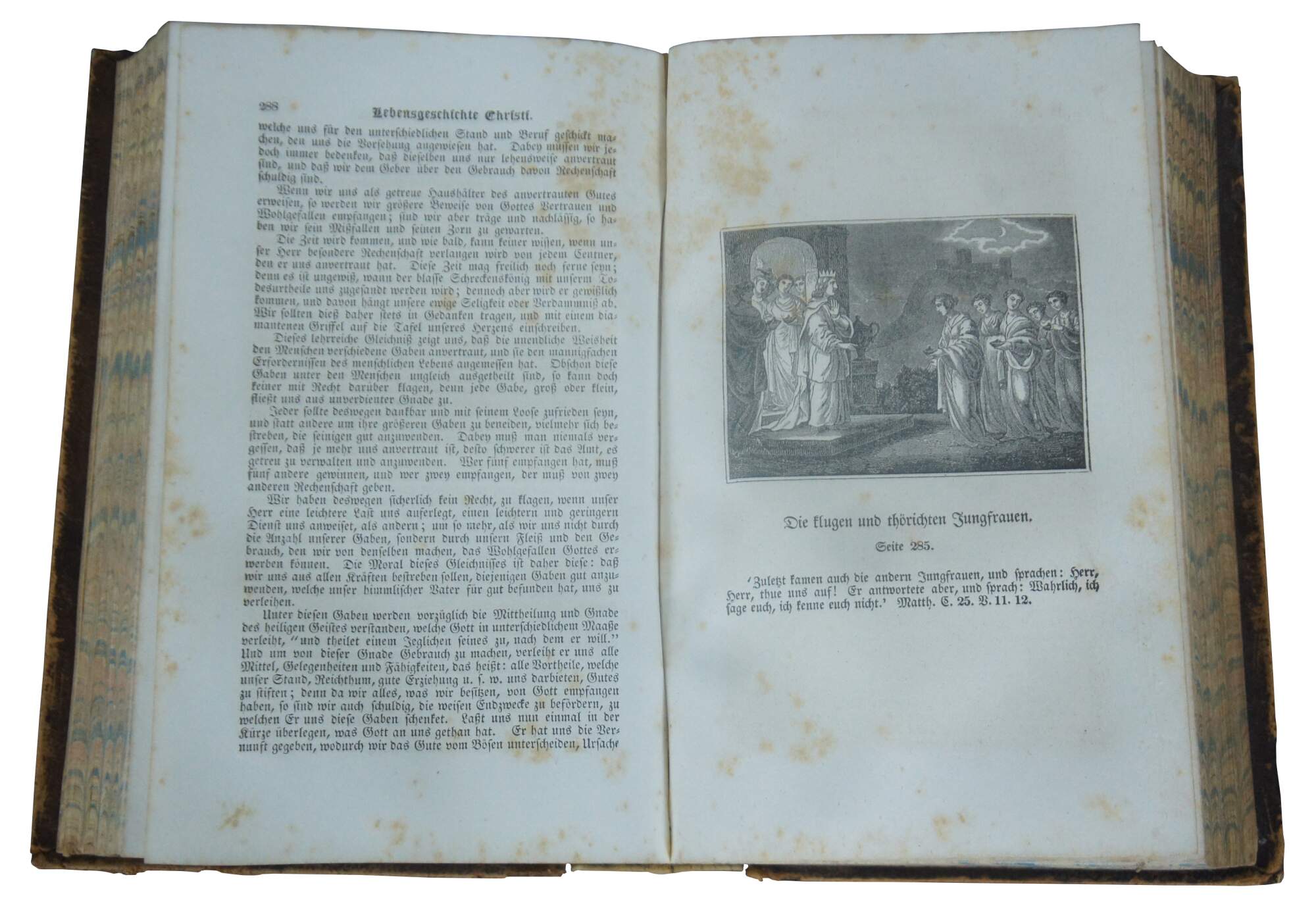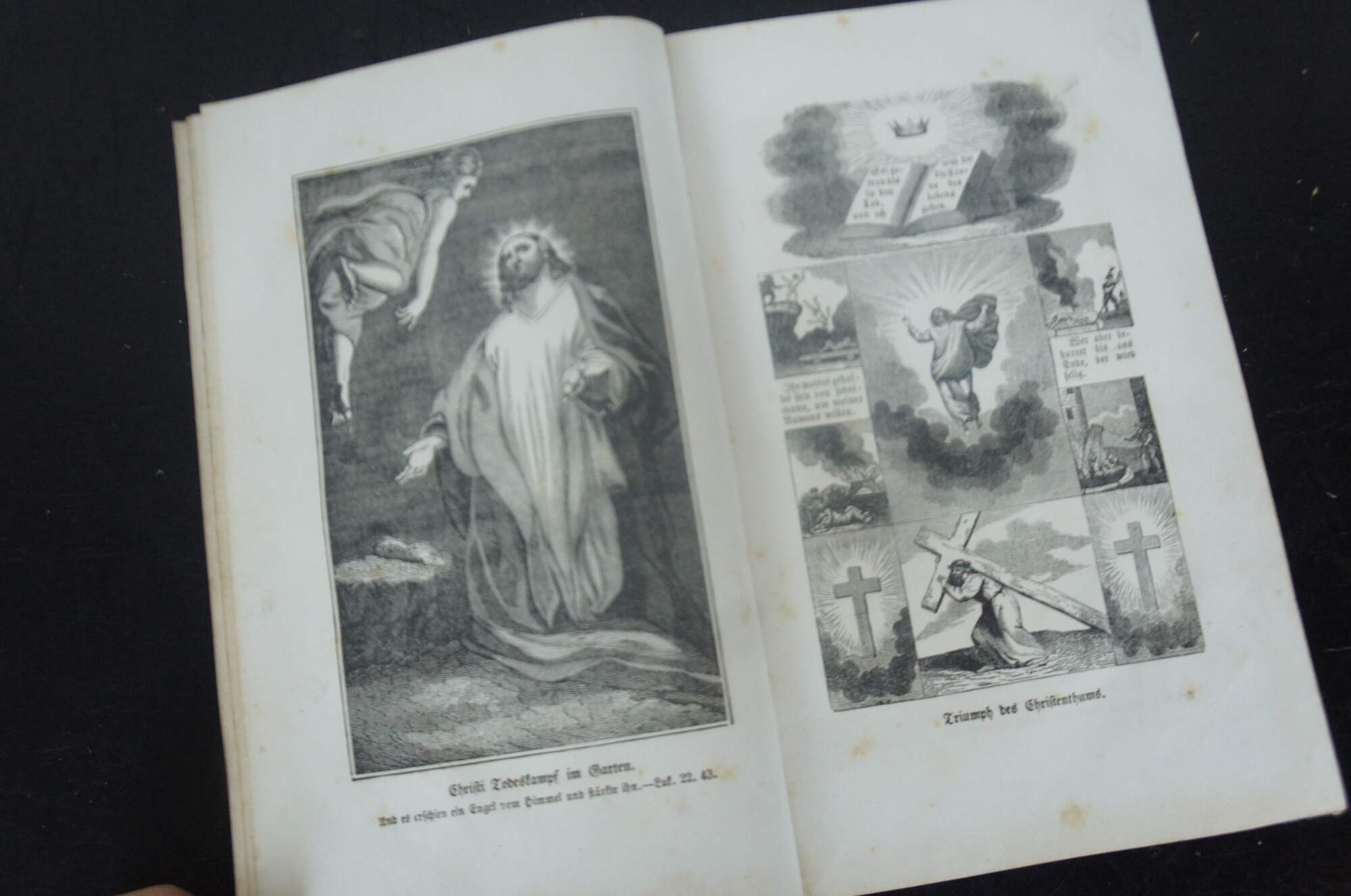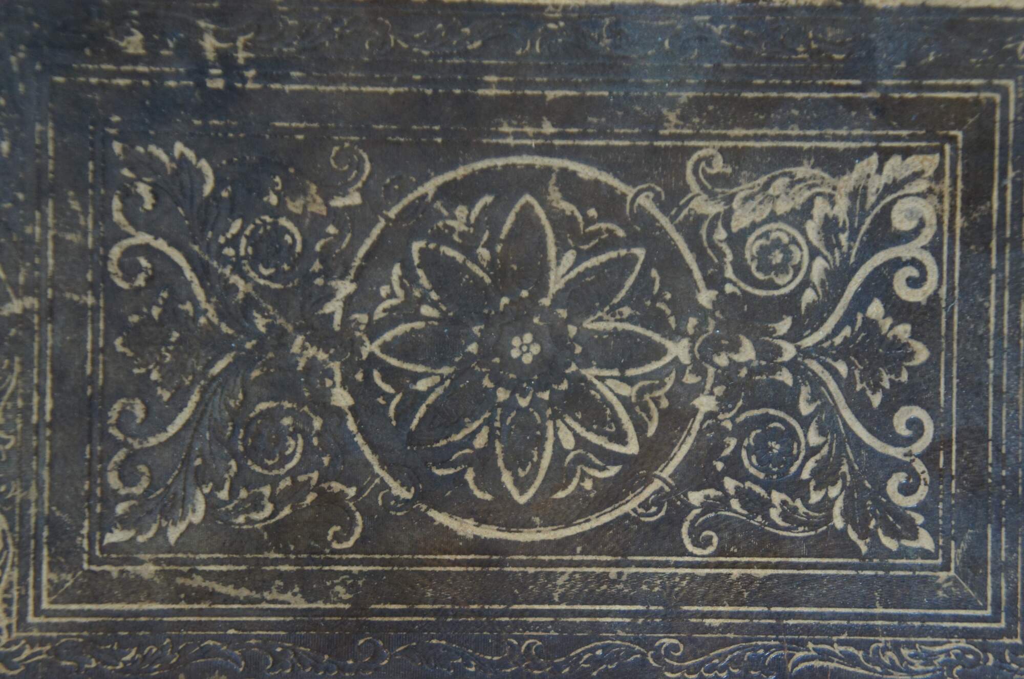 Antique embossed leather hard cover copy of “Lebensgeschichte unferes Herrn und Heilandes Jesu Christi; Enthaltend eine volltandige und genaue Geschichte von der Zeit an, da Er unfere Natur angenommen, bis auf feine Kreuzigung, Uuferfthung un Himmelfahrt – nebft - dem Leben, Thaten und Leiden seiner heiligen Evangelisten, Upostel und Junger, und anderer Martnrer der ersten Zeiten, sammt einer turzen Geschichte der Juden.” (Biography of Our Lord and Savior Jesus Christ; Containing a complete and accurate history from the time He assumed our nature, except for his Crucifixion, Ressurection and Ascension – in addition – of life, deeds and suffering of his holy evangelists, apostles and disciples, and other martyrs of the early ages, together with a brief history of the Jews) Written by Johann Fleetwood, D.D. Published by Hartford Publishers, 1851.