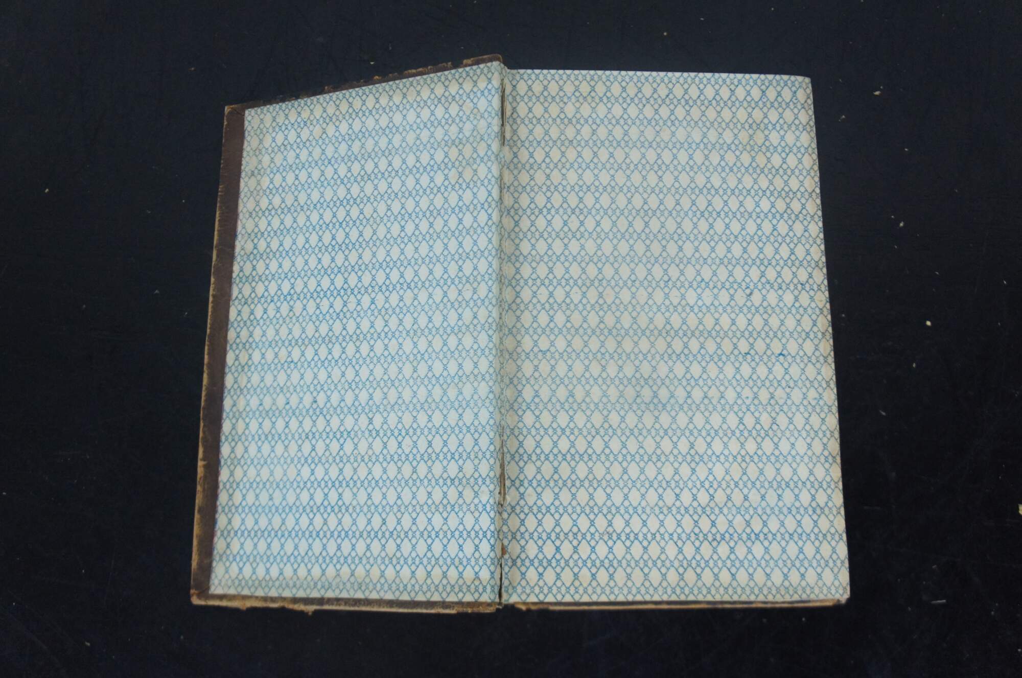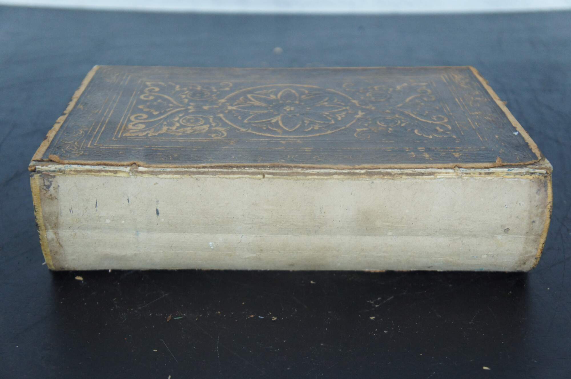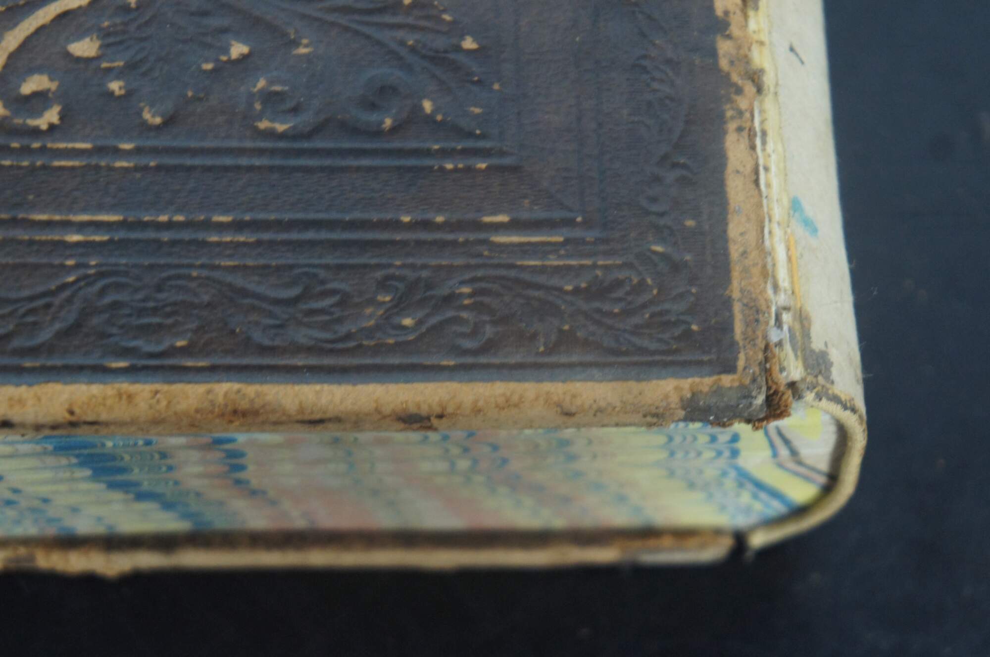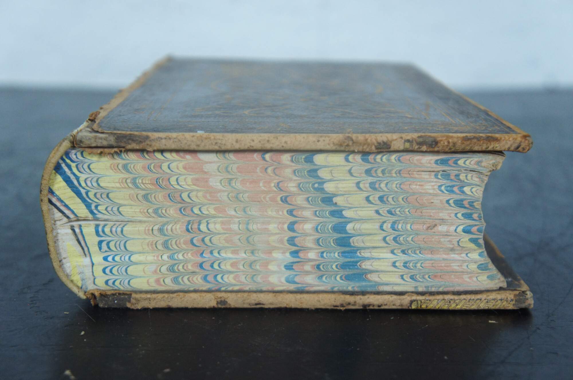Good Antique Condition – Covers attached but leather on spine missing, moderate wear to leather covers, dioxin g to pages, slight discoloration to page edges