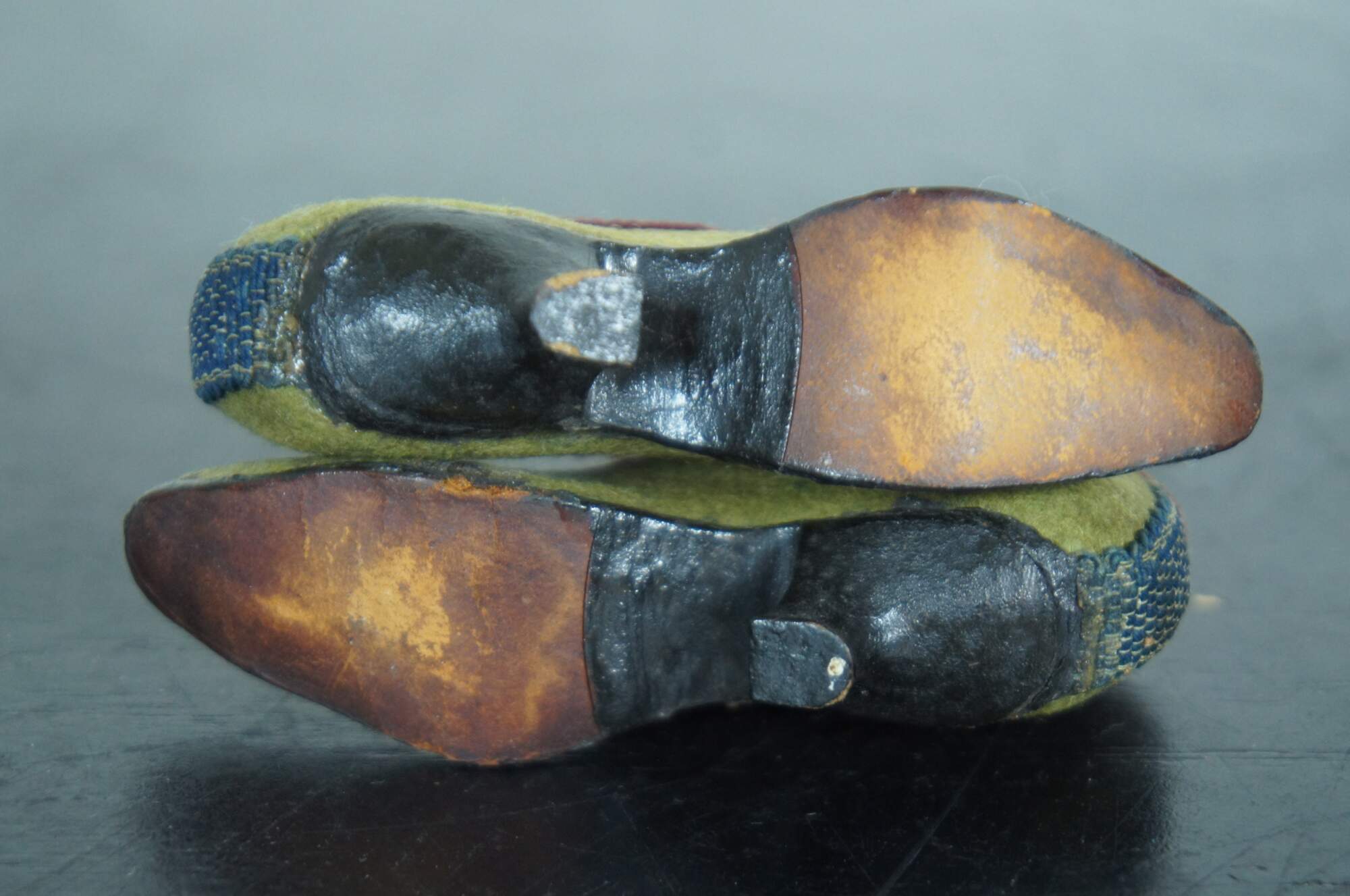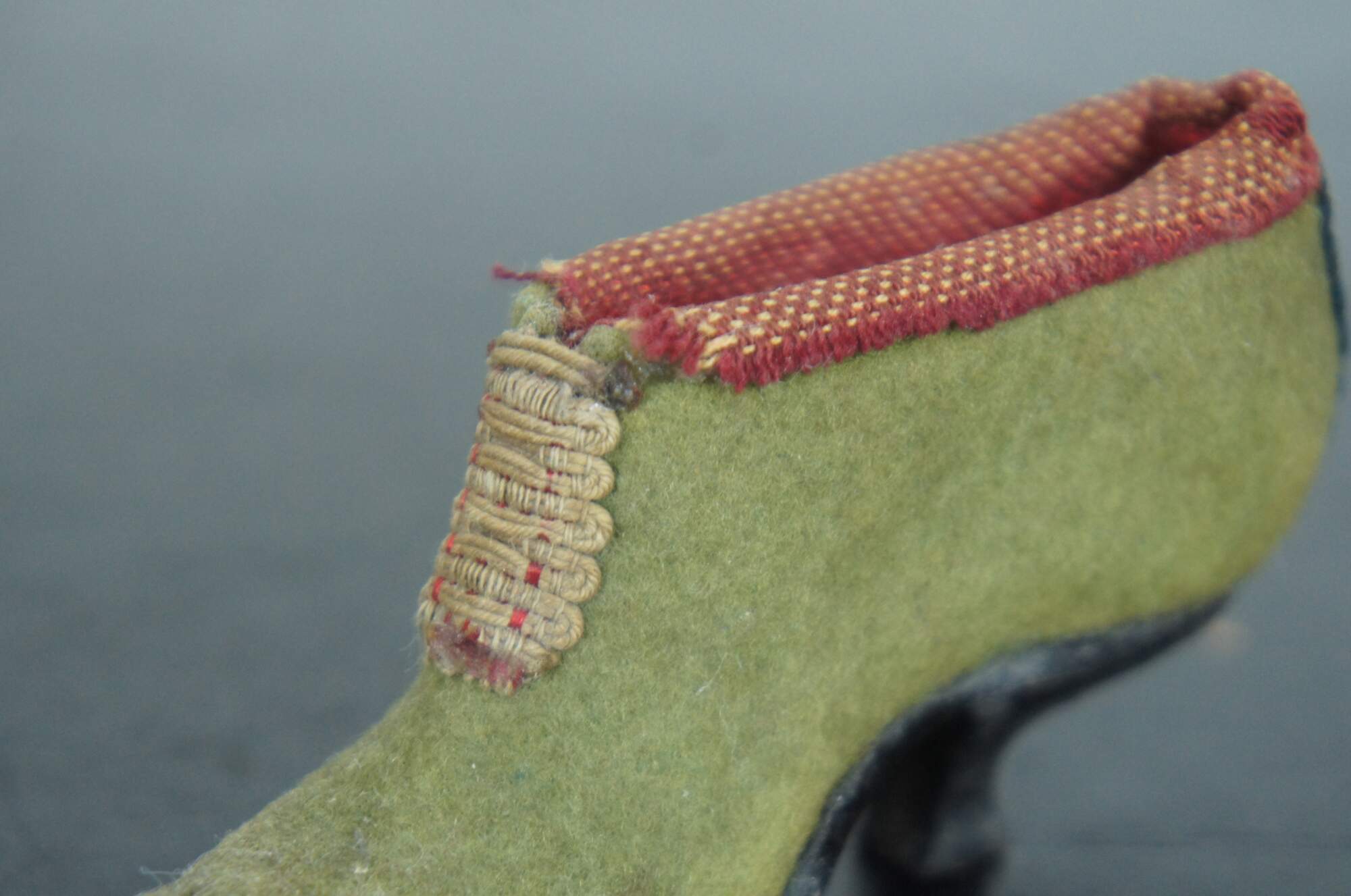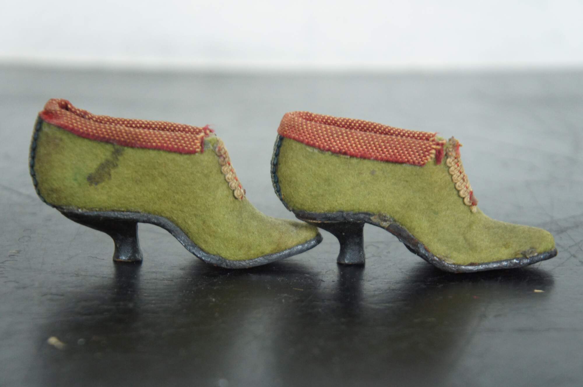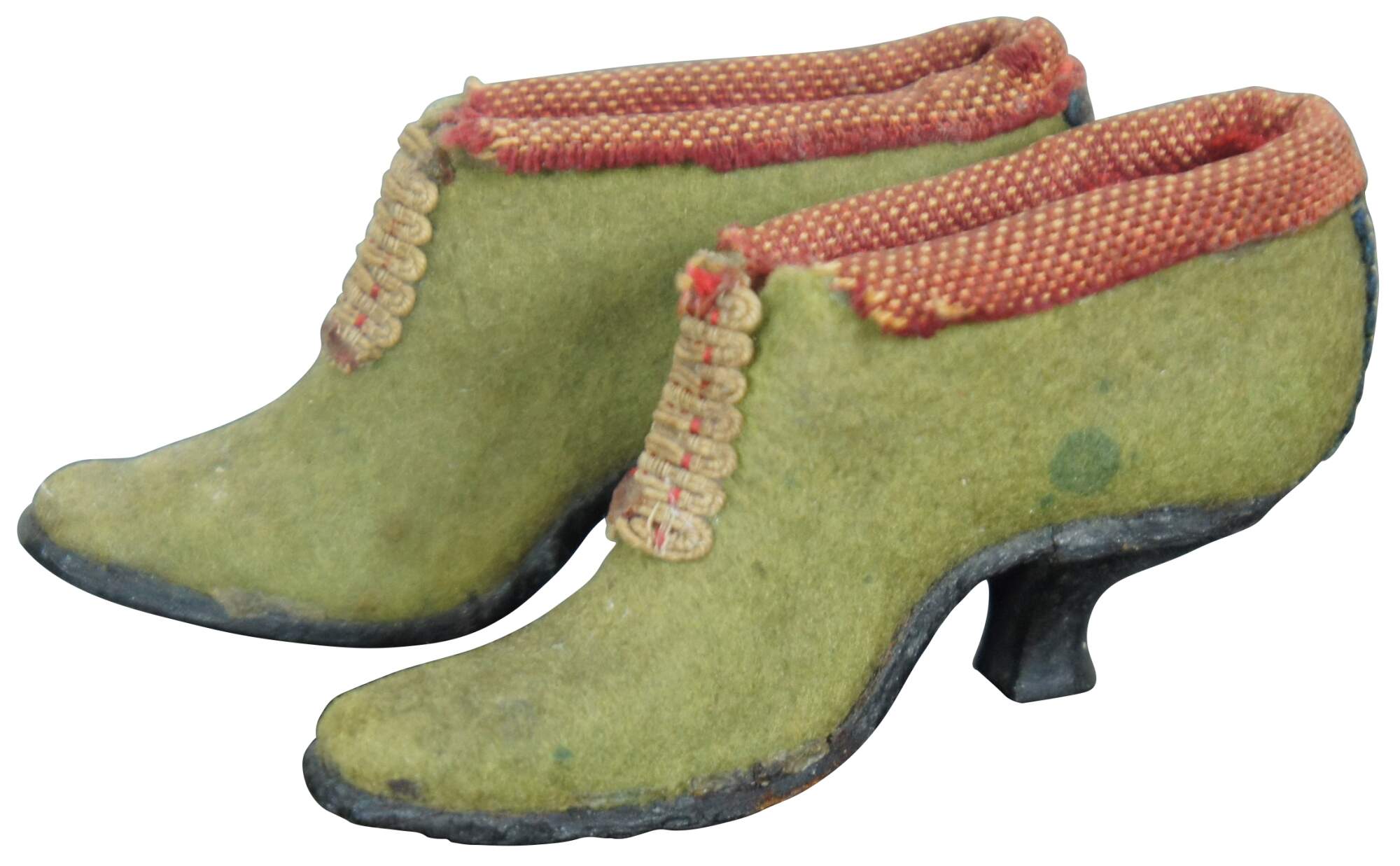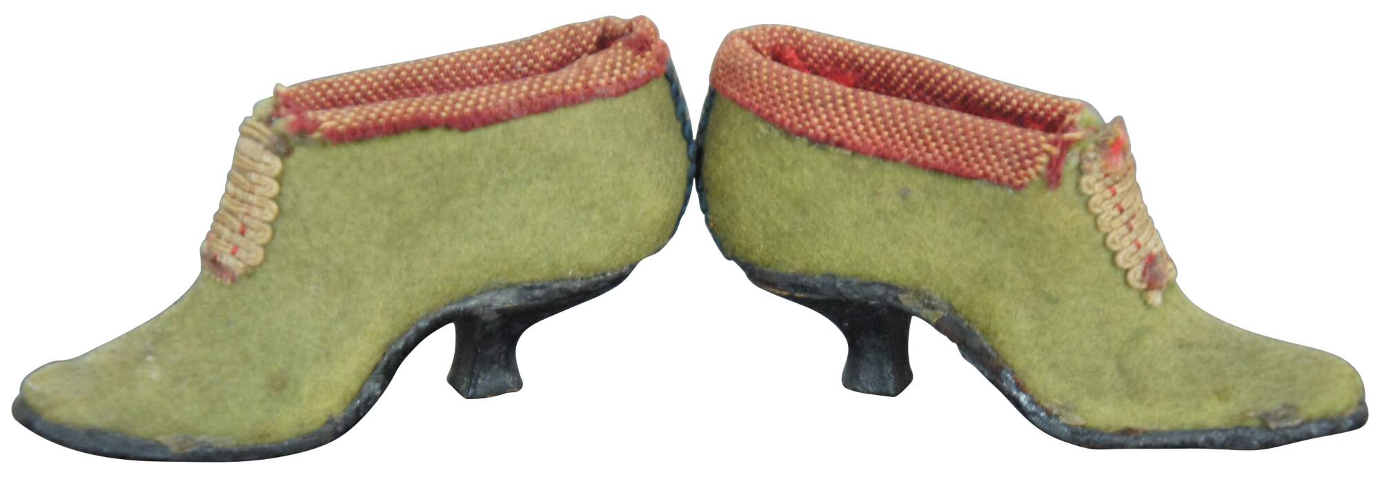 Pair of antique Victorian miniature folk art cobbler doll sized evening shoe pincushions made of light green felt with red cloth trim and stitched braid “buckles" with leather soles.