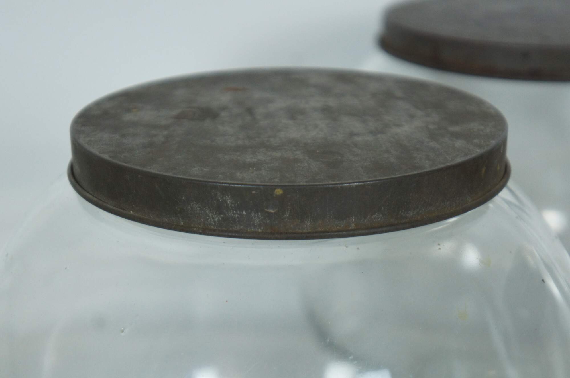 Set of three rare antique 1920’s clear glass fish bowl shaped candy containers with metal lids and three vintage West German scoops.