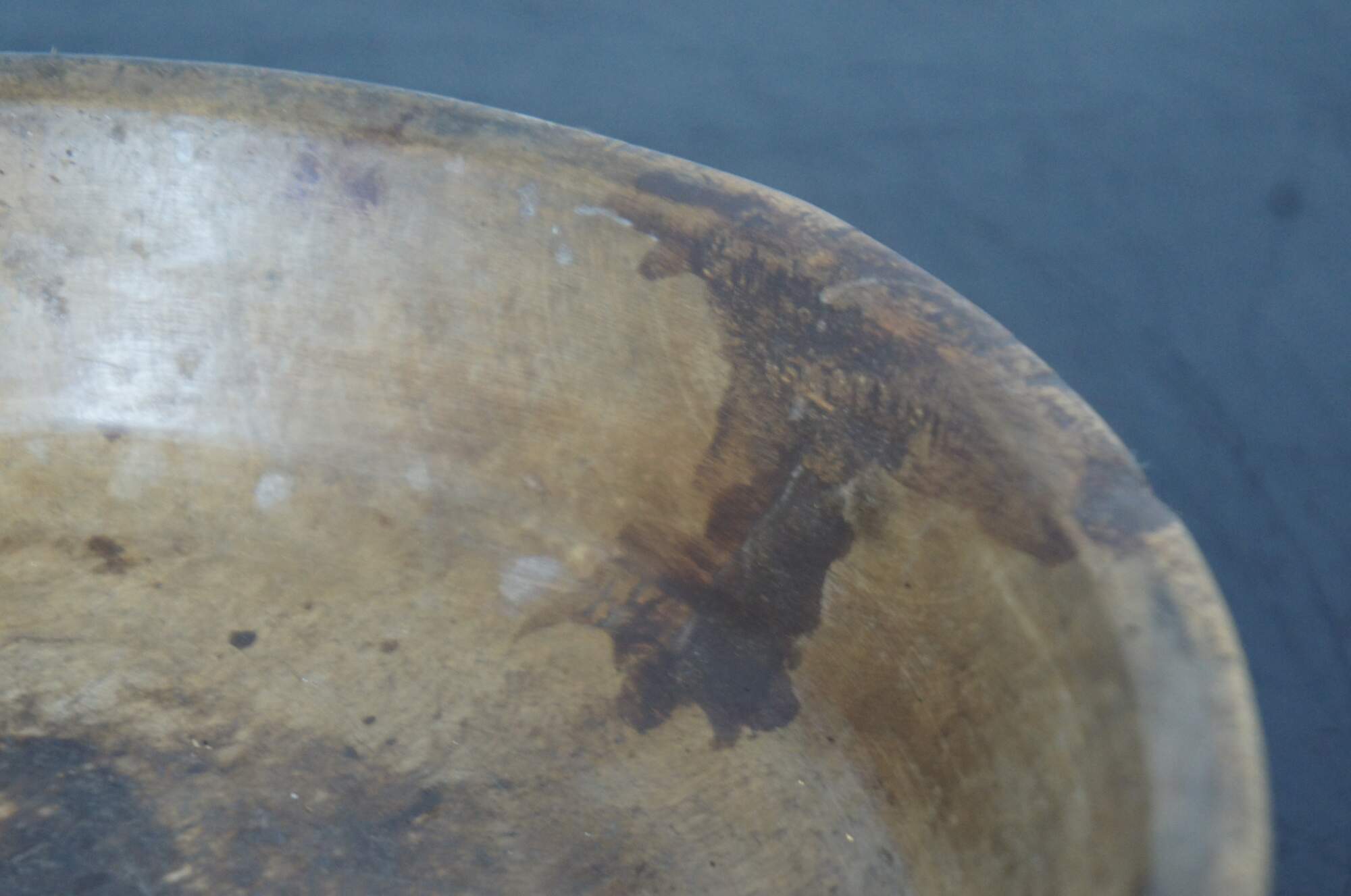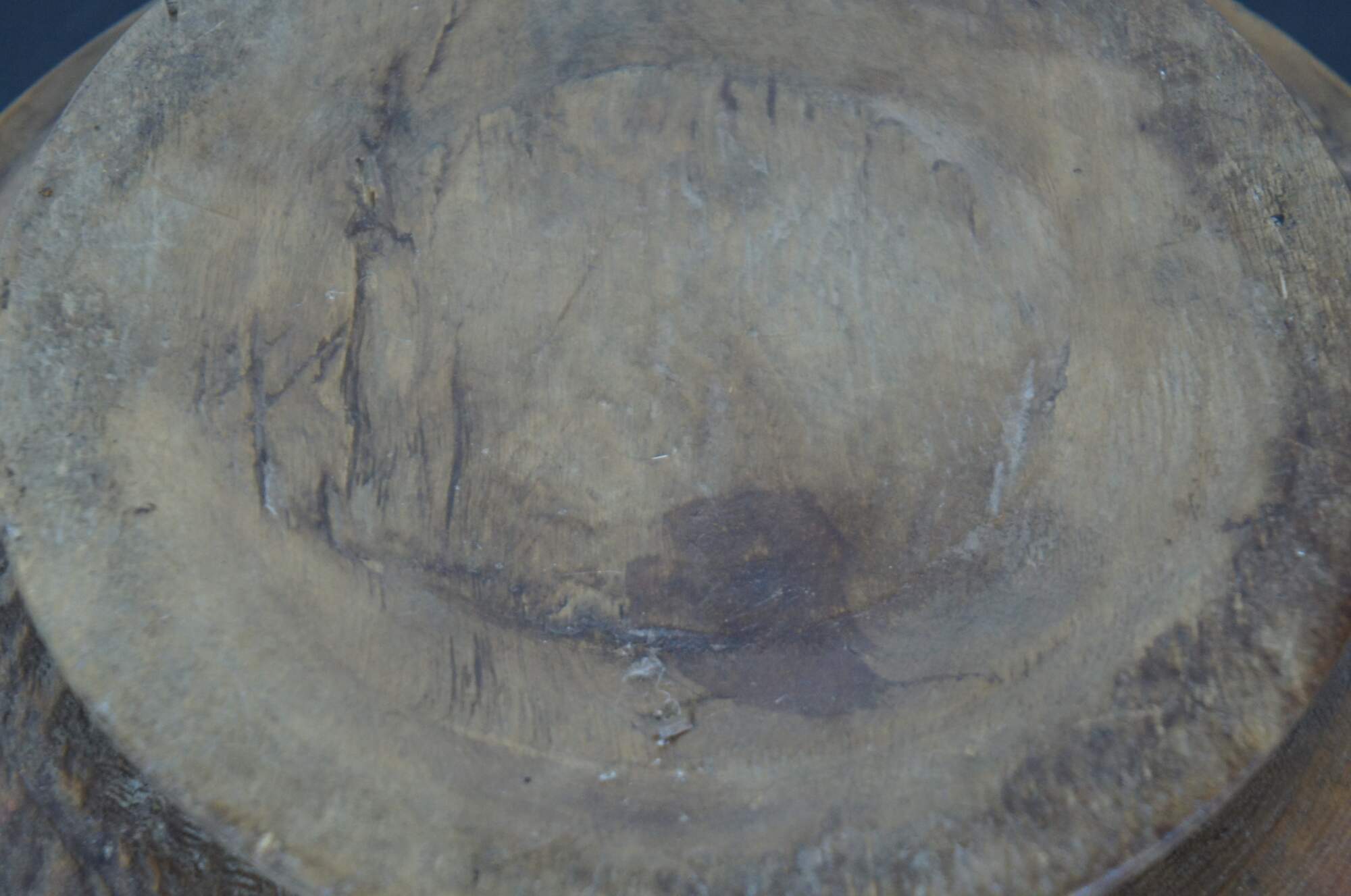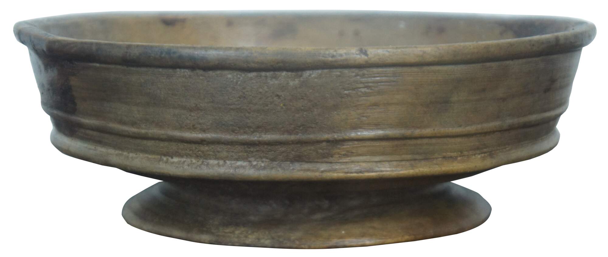 Antique primitive turned wood footed dough bowl or centerpiece with simple decorative ridges.