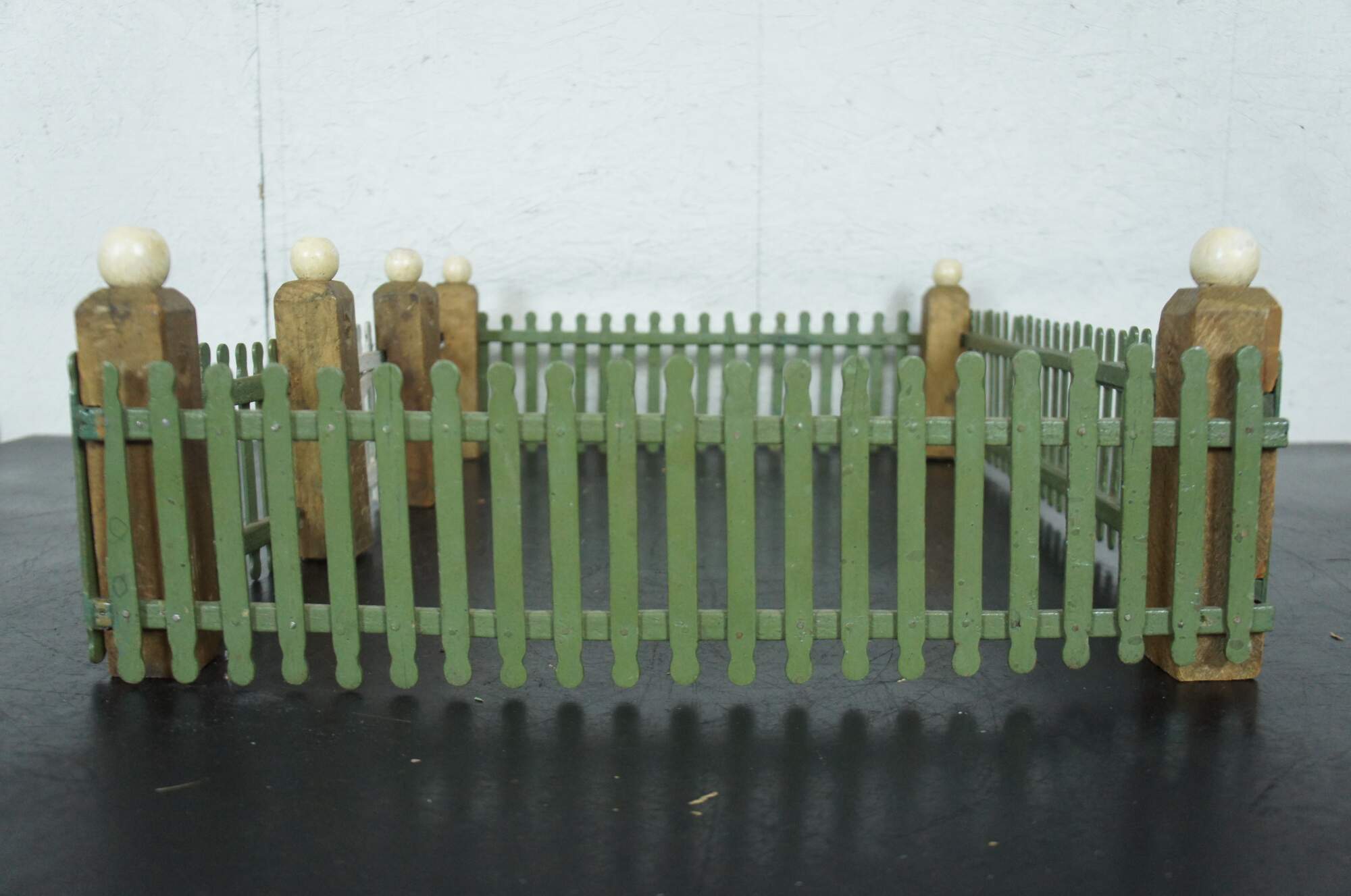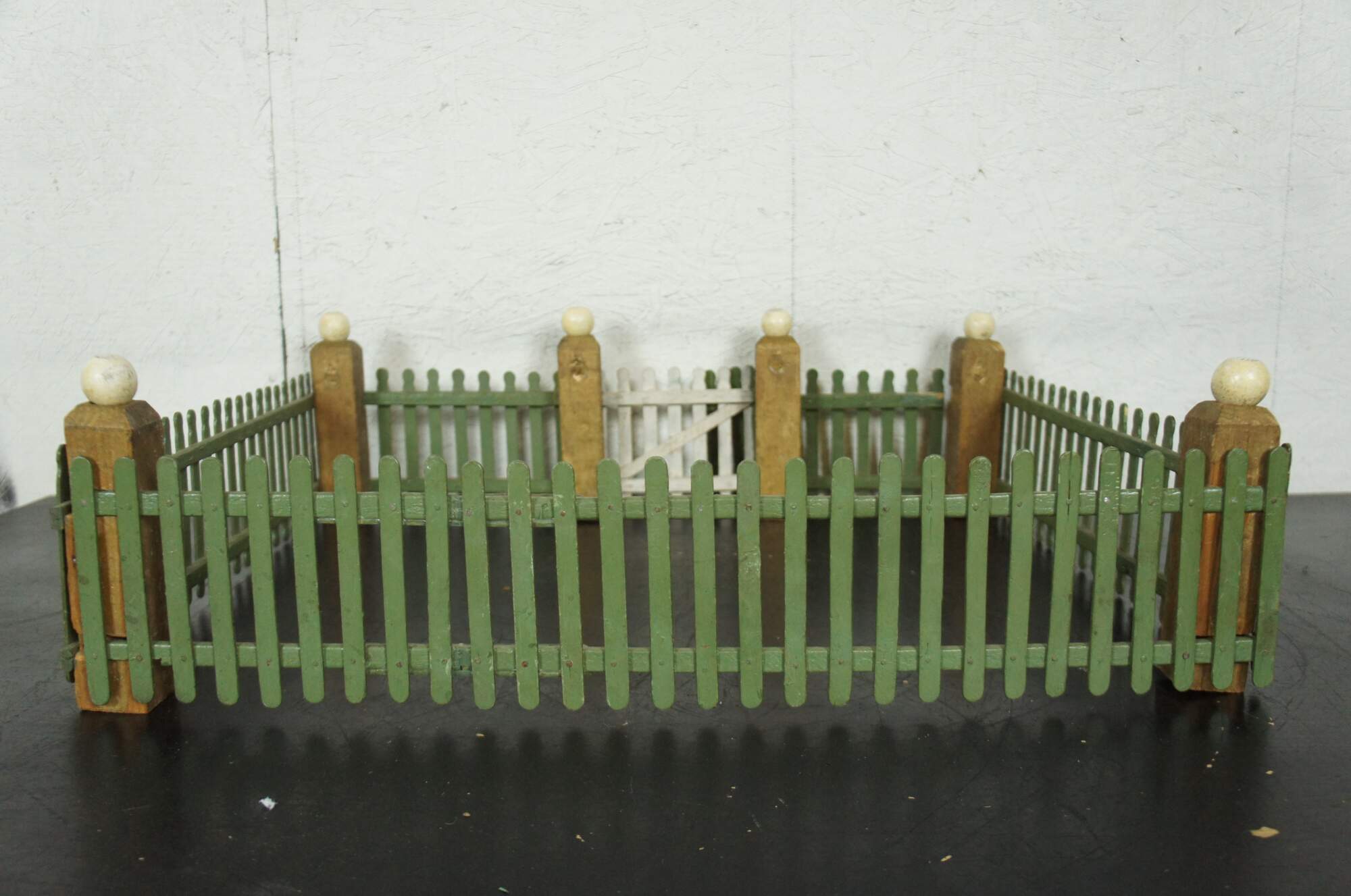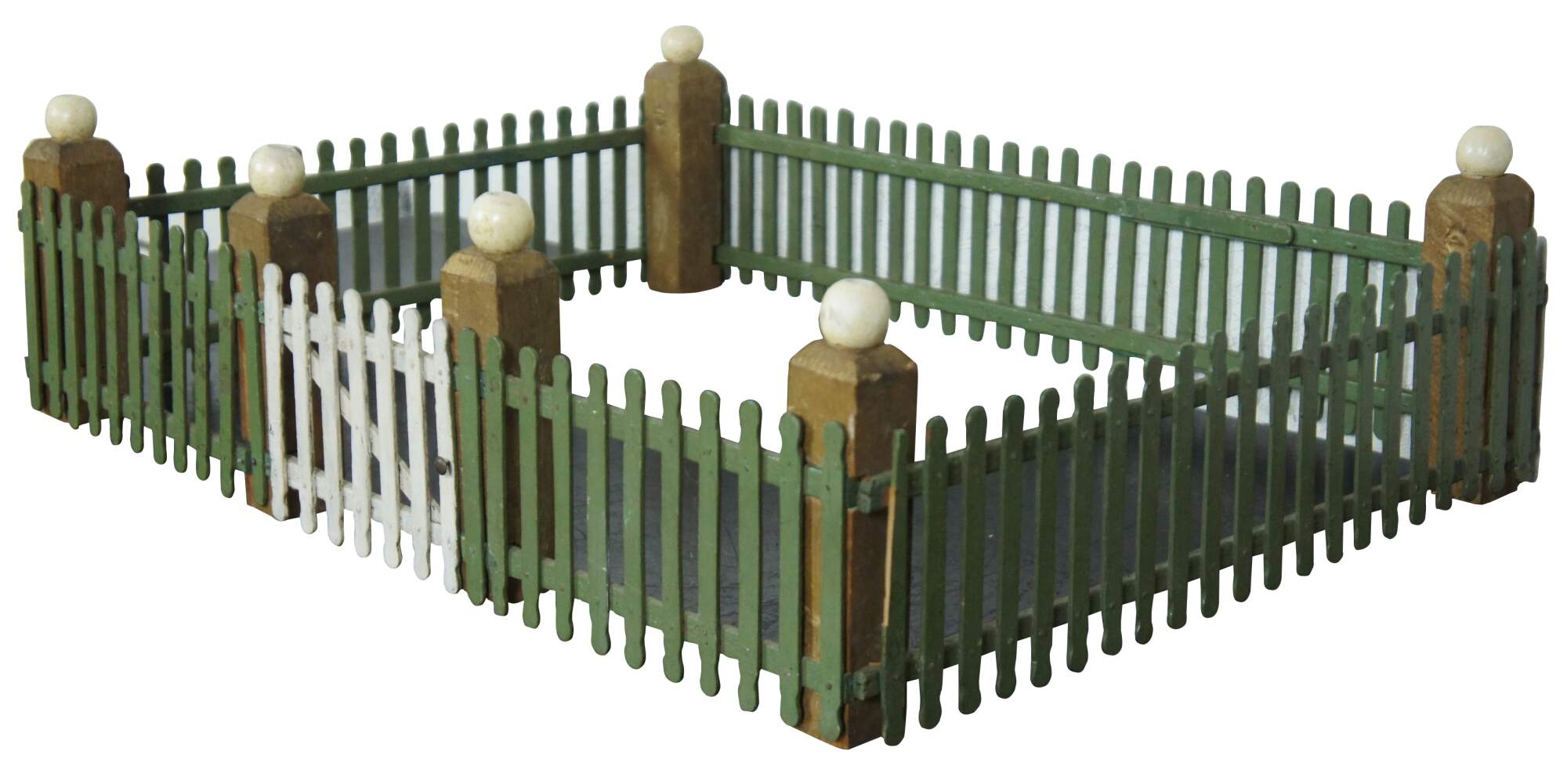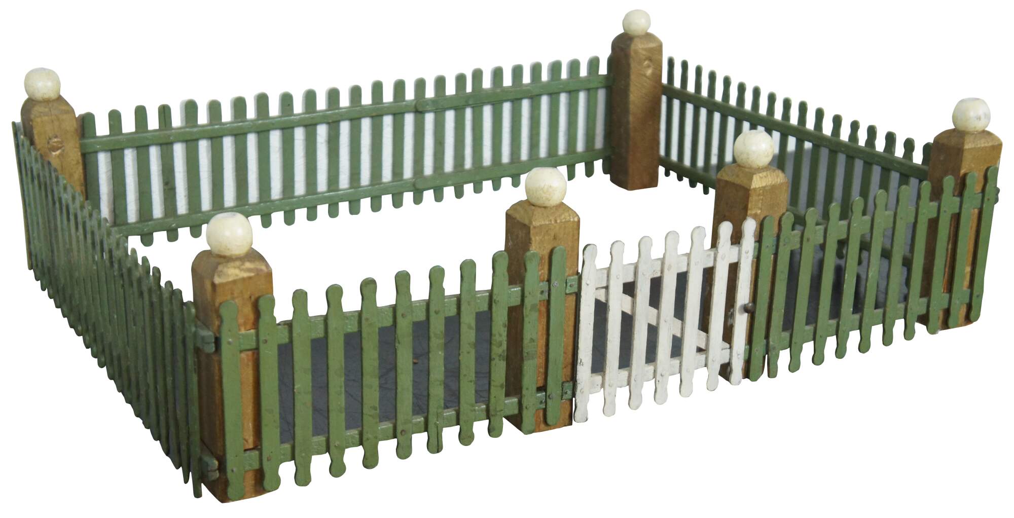Vintage hand made popsicle stick picket fence for use in decoration of a village around a Christmas tree. Painted in green with a non-functional white gate and gold corner posts topped with white globes.