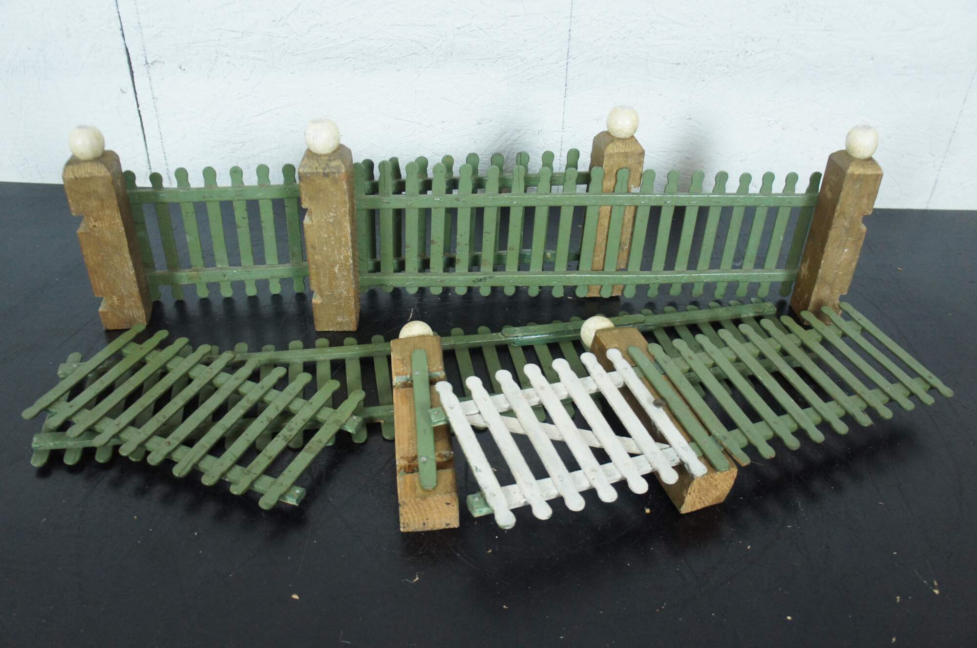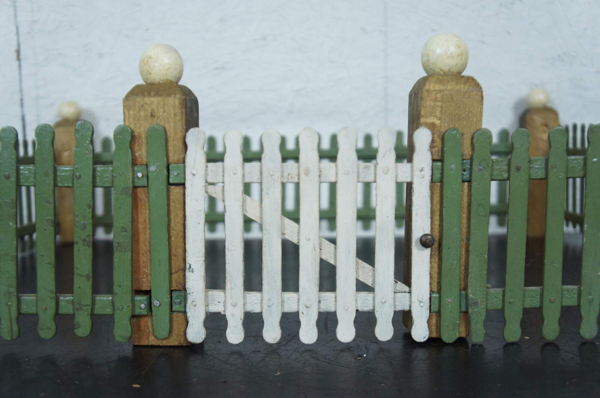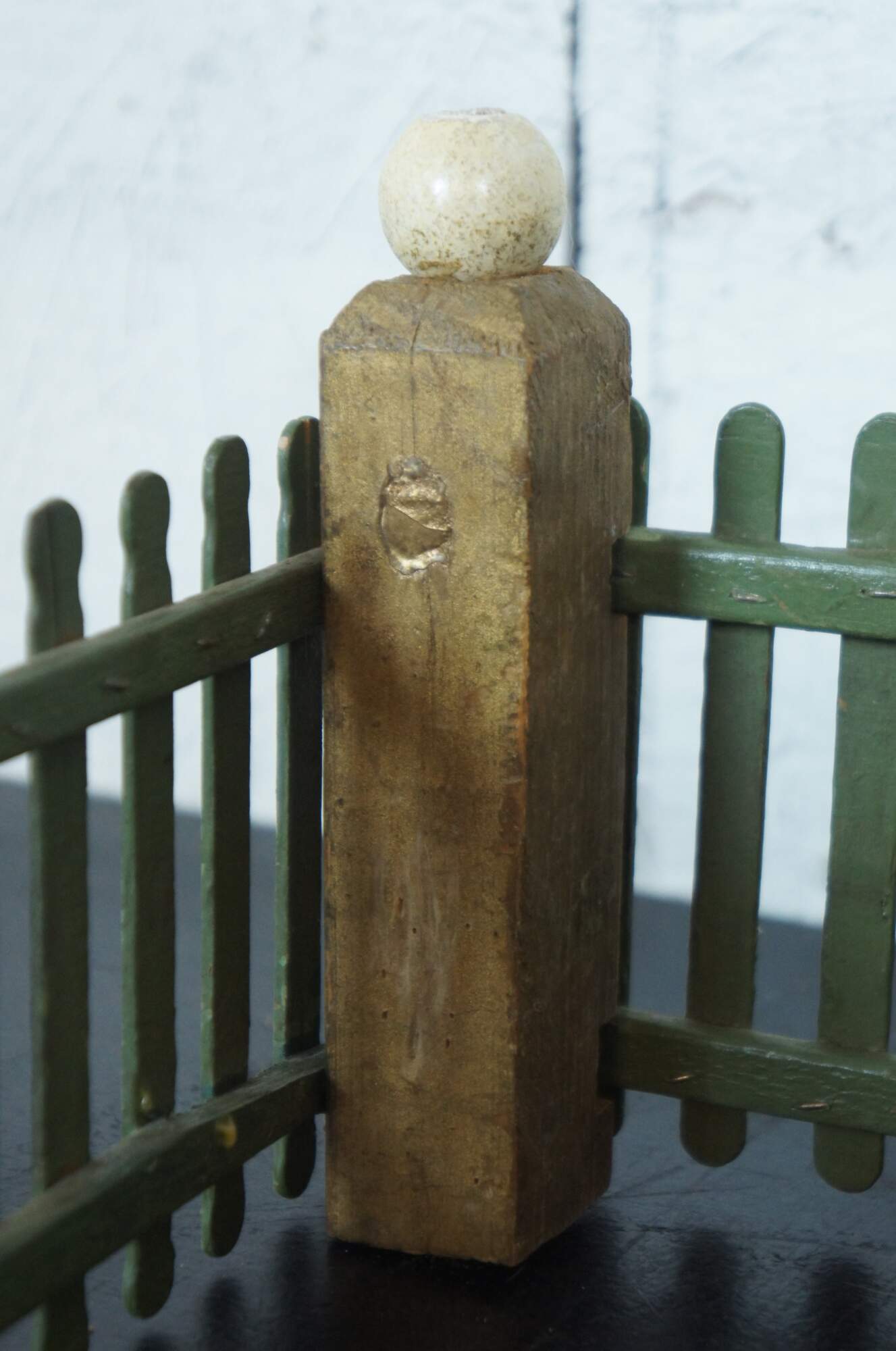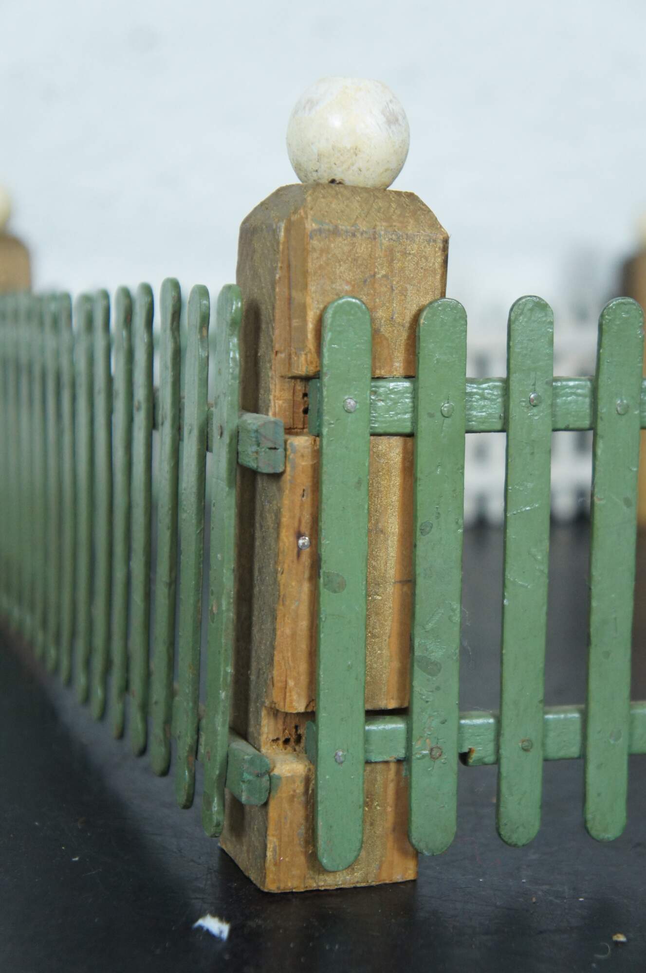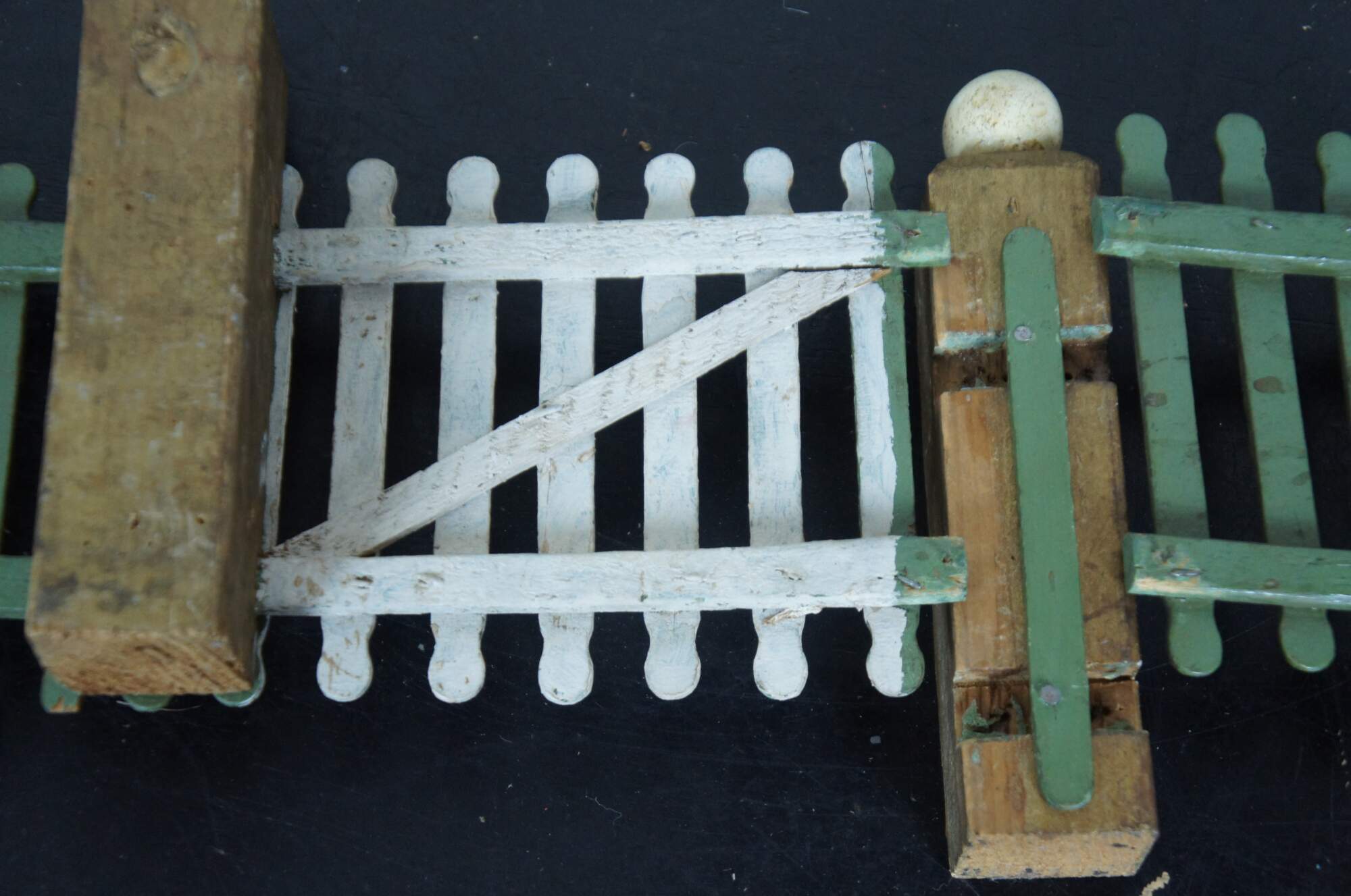 Vintage hand made popsicle stick picket fence for use in decoration of a village around a Christmas tree. Painted in green with a non-functional white gate and gold corner posts topped with white globes.