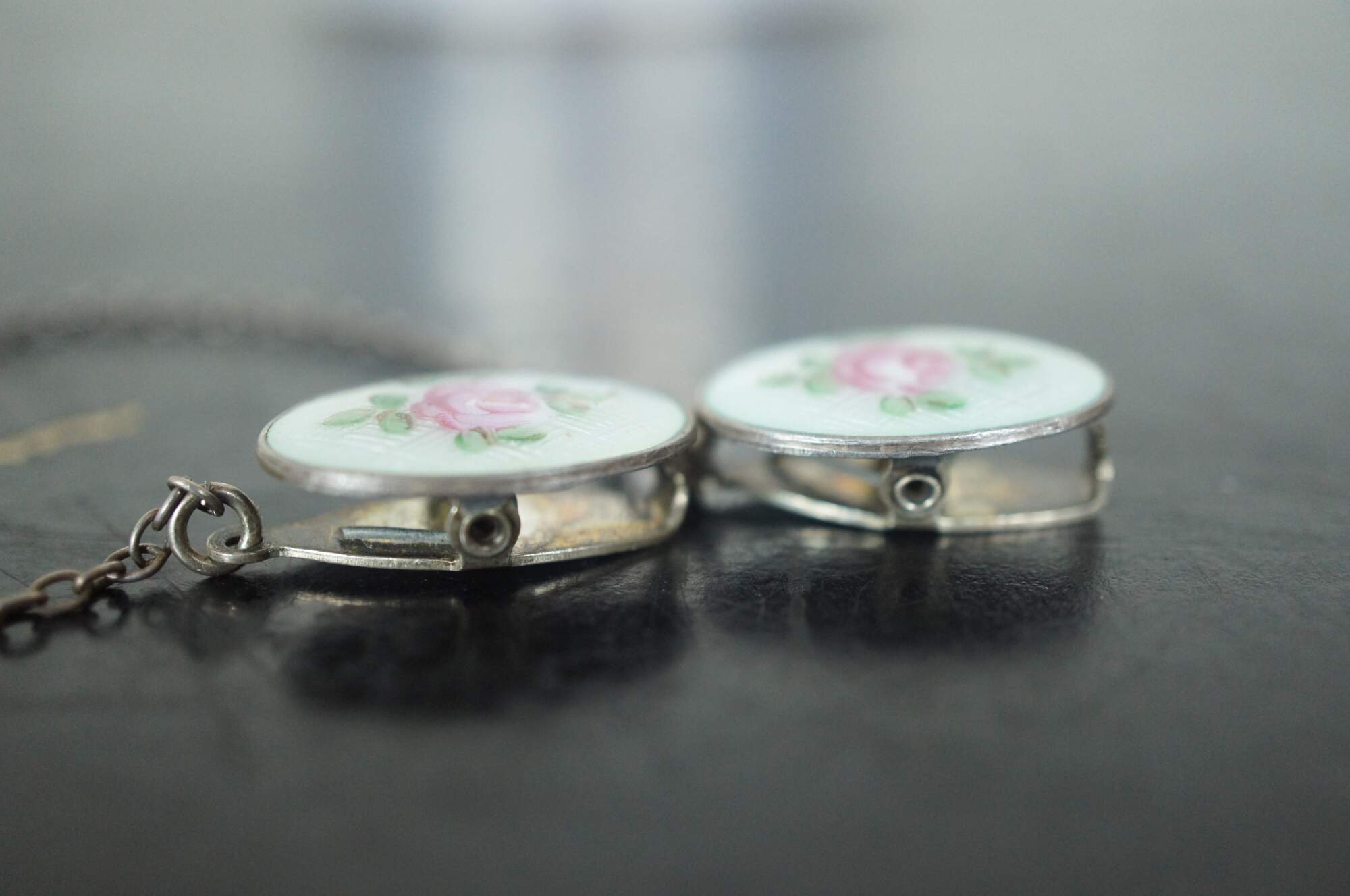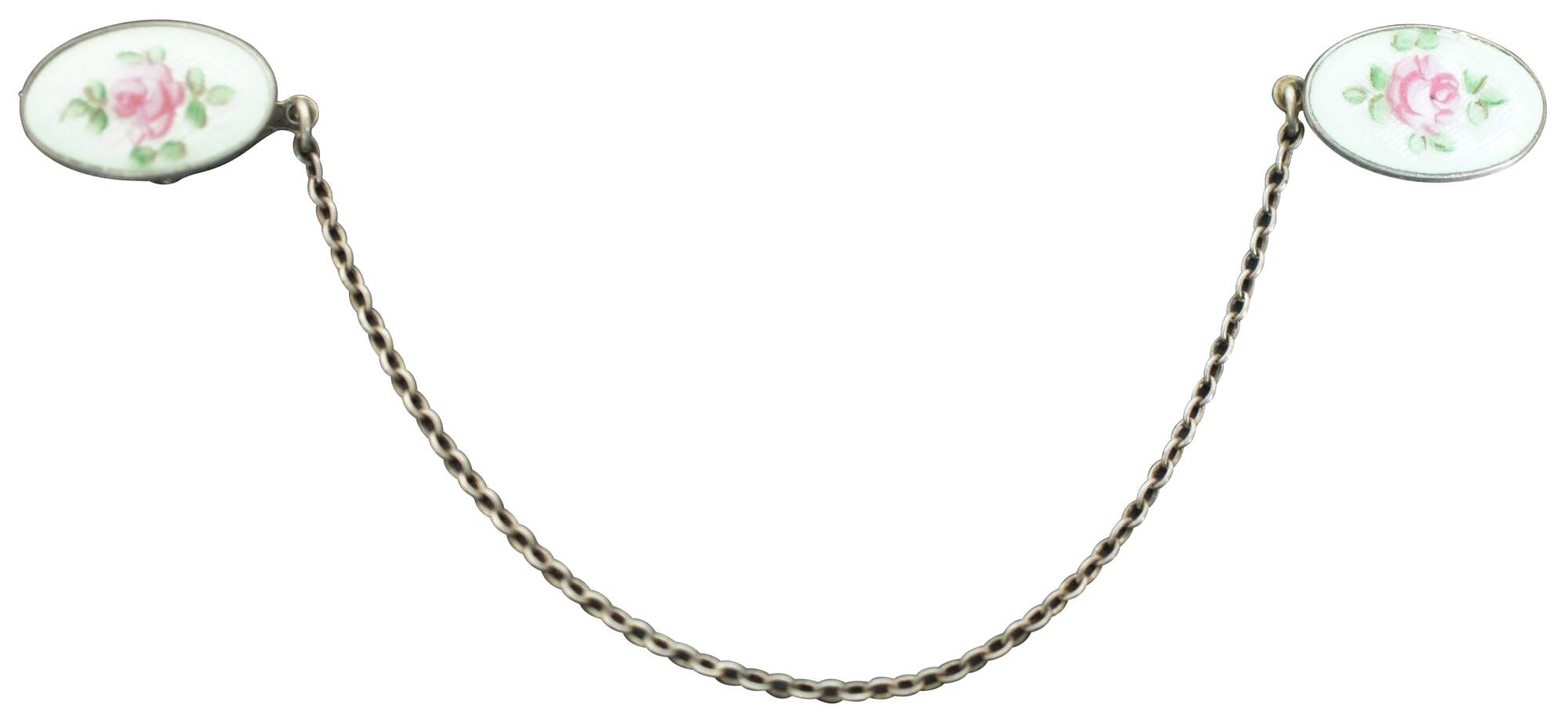 Vintage Webster sterling silver and guilloche enamel sweater clip, oval medallions featuring pink roses with green leaves on a white ground.“Webster Company of North Attleboro, MA - founded in 1869 by George K. Webster. A subsidiary of Reed & Barton from 1950.”