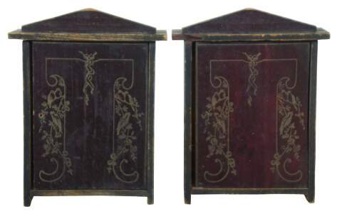 Pair of antique miniature dollhouse sized matching wardrobes with triangular pediments and doors painted in gold with scroll work, vines and birds.