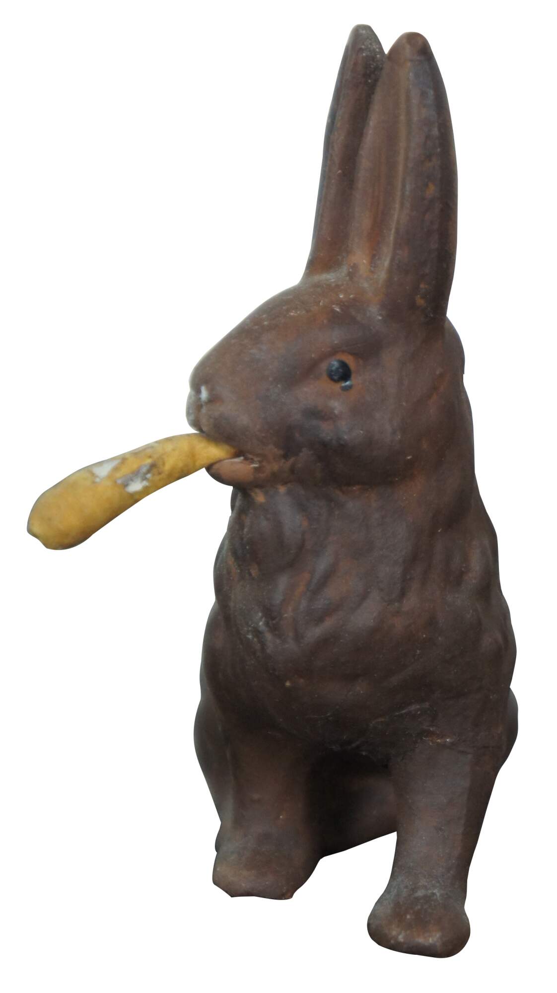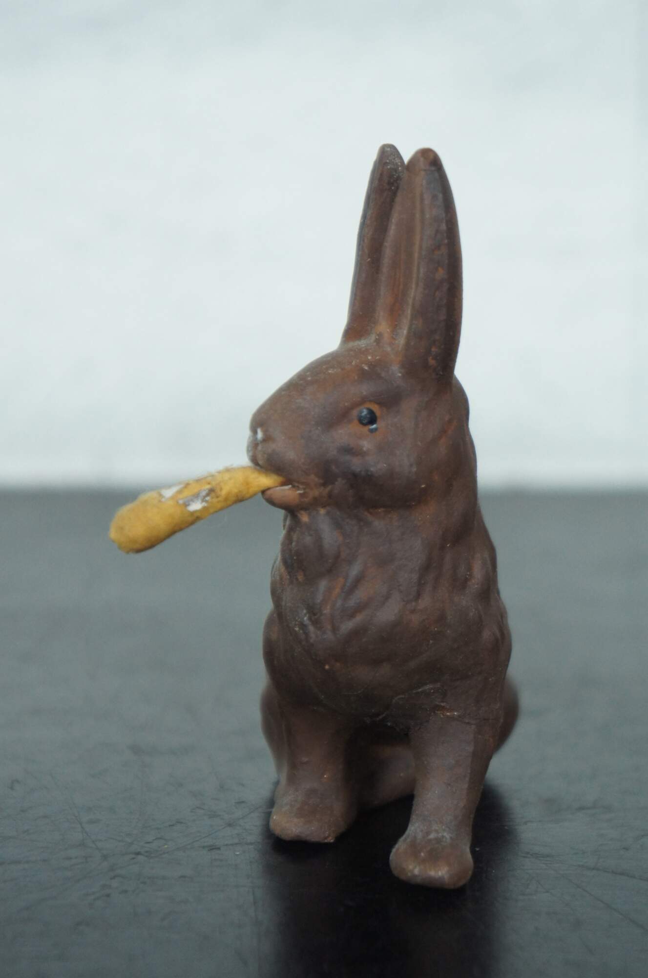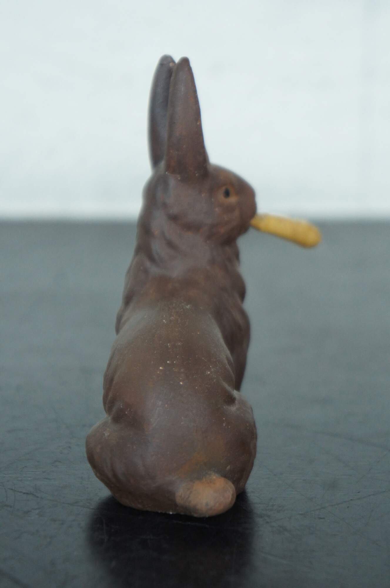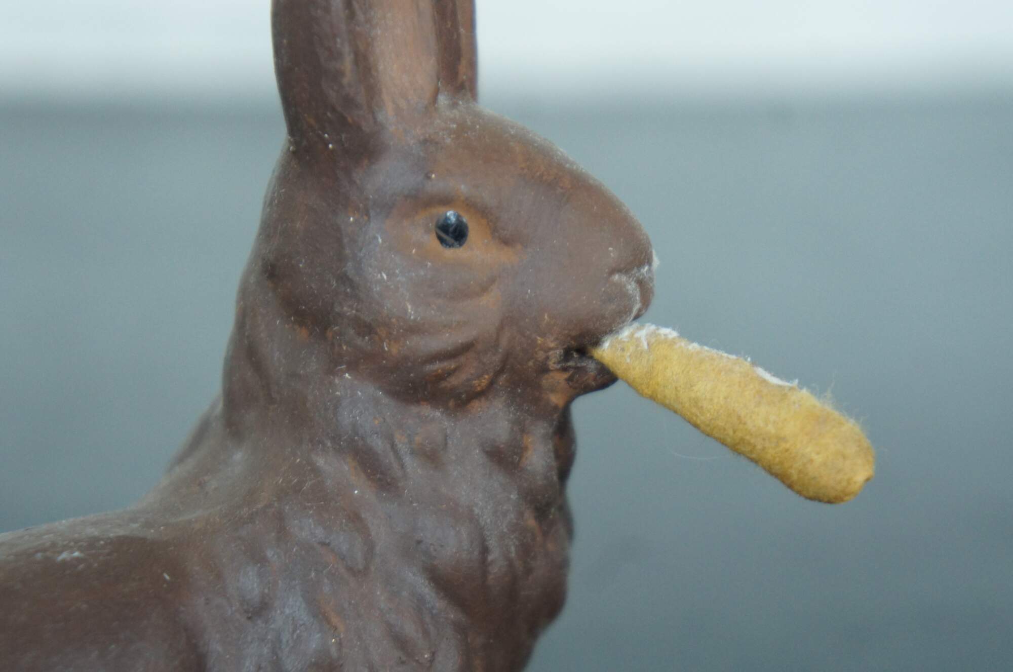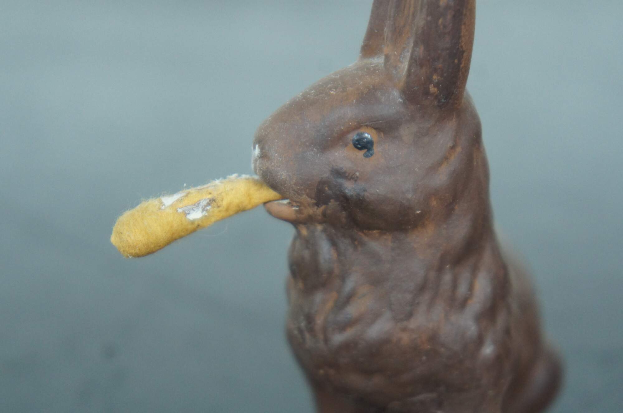 Antique composition / paper mache candy container in the shape of a dark brown seated rabbit with a wool covered carrot in its mouth.