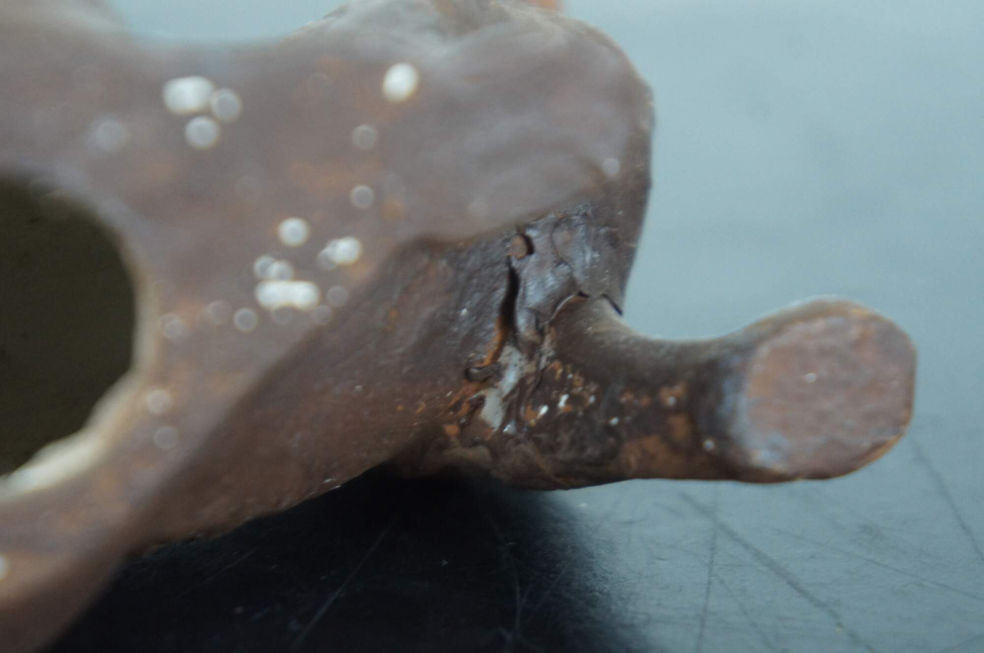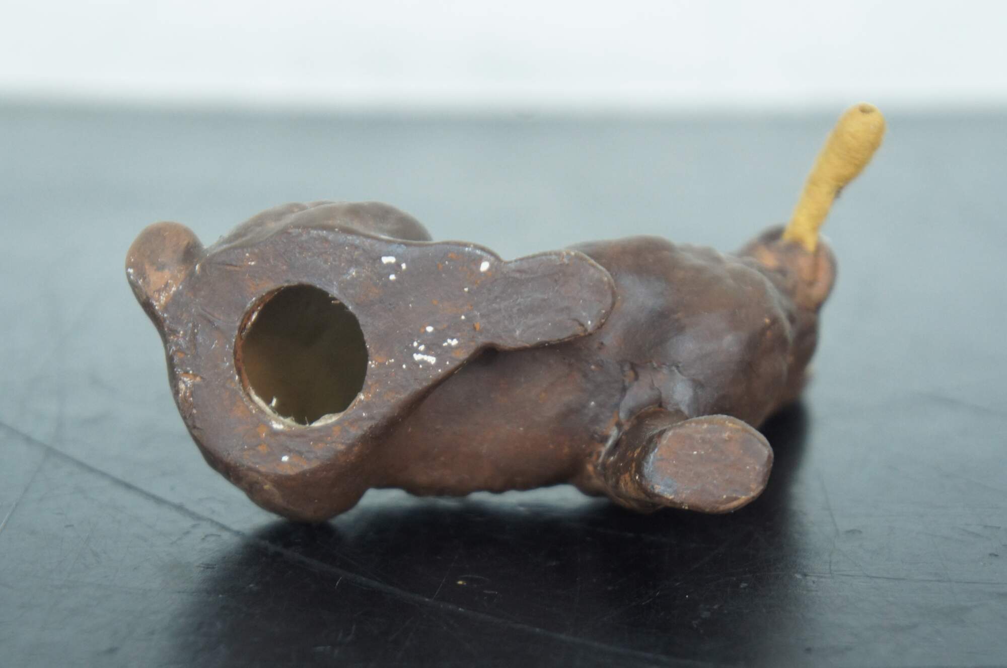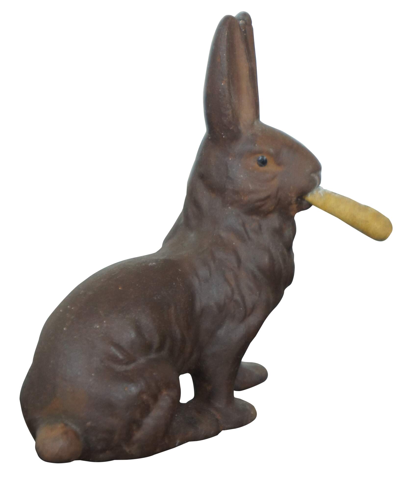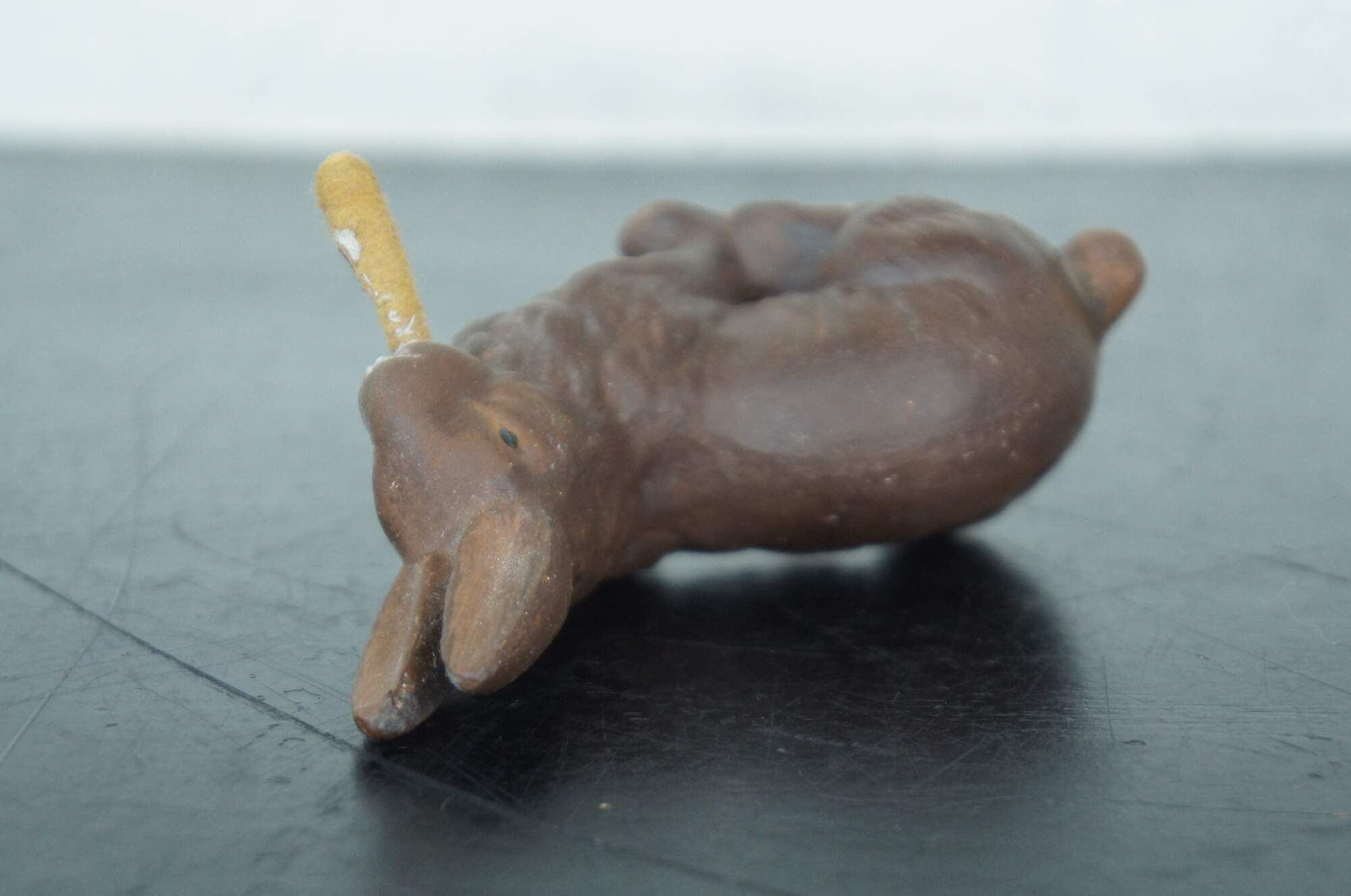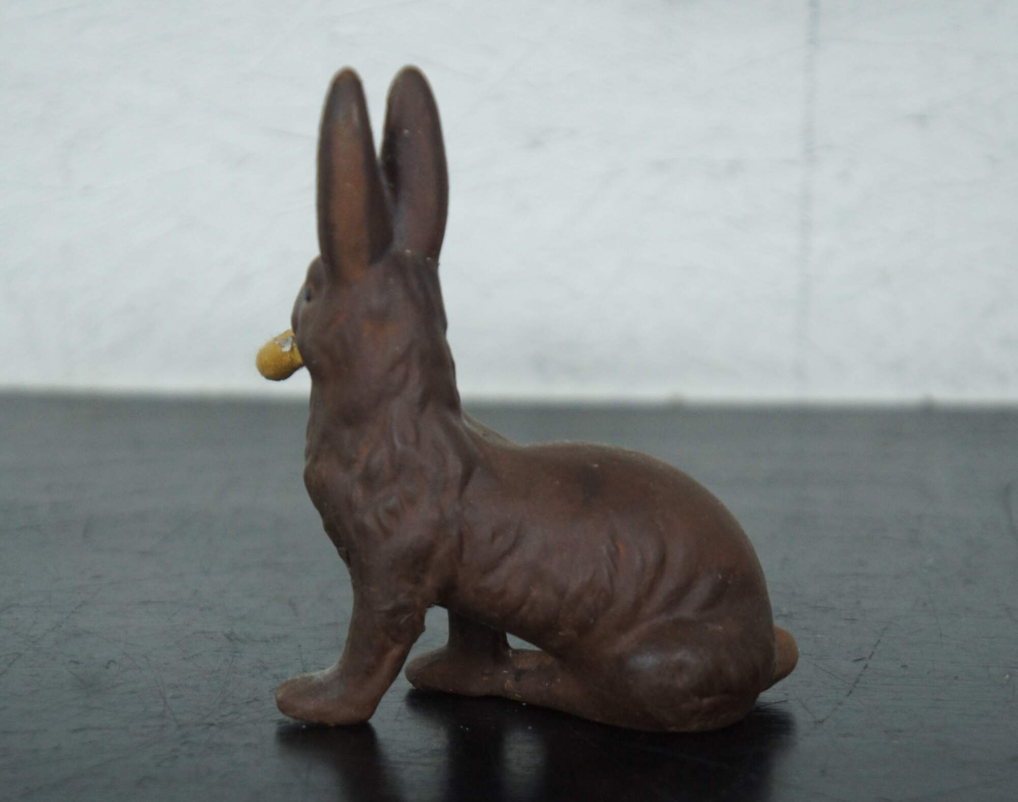 Antique composition / paper mache candy container in the shape of a dark brown seated rabbit with a wool covered carrot in its mouth.