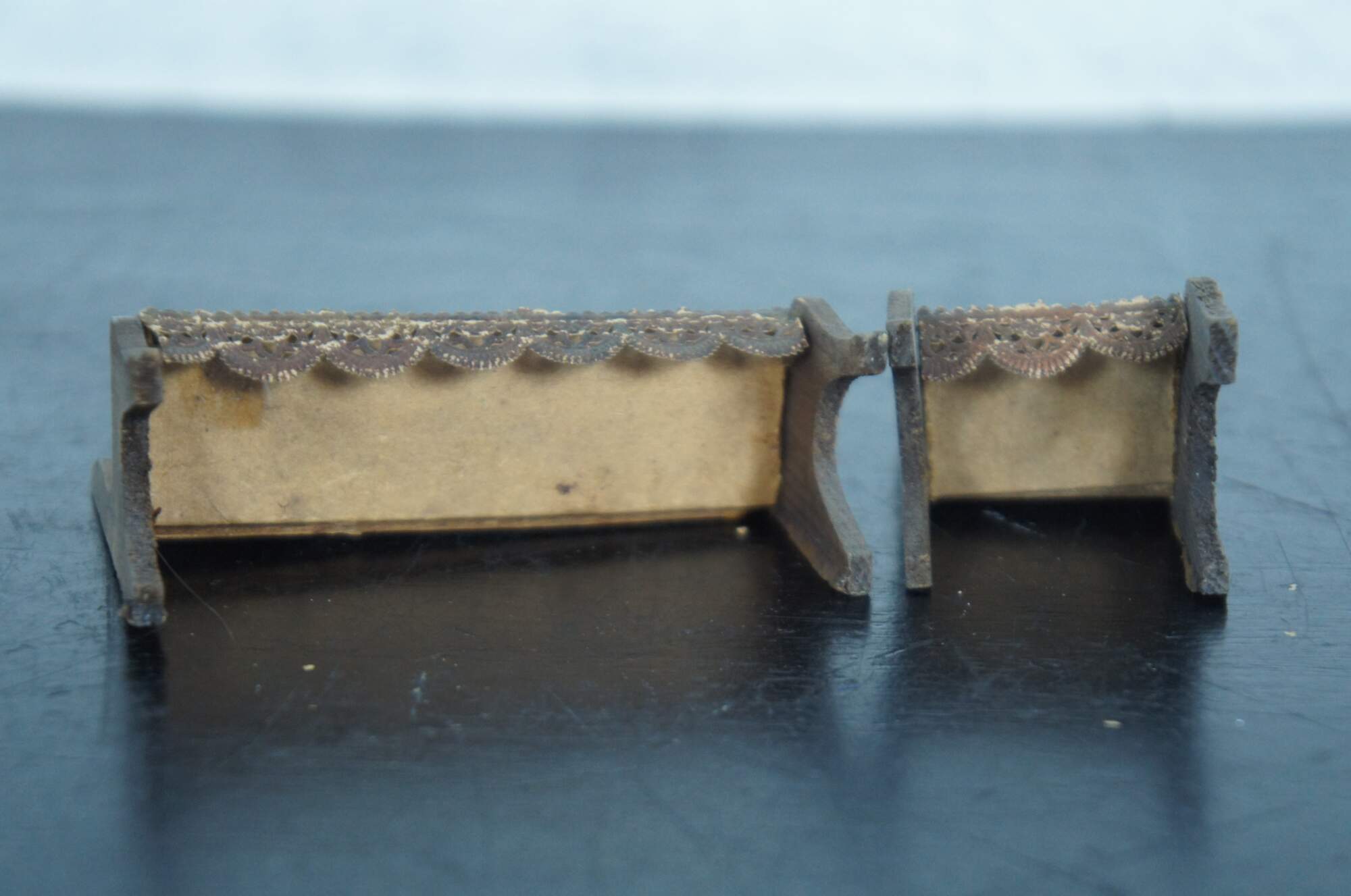Set of three doll house sized pieces of furniture – one reticulated / pierced settee, one intact chair, and one chair missing a combination arm/leg – decorated with floral lithograph printed paper.