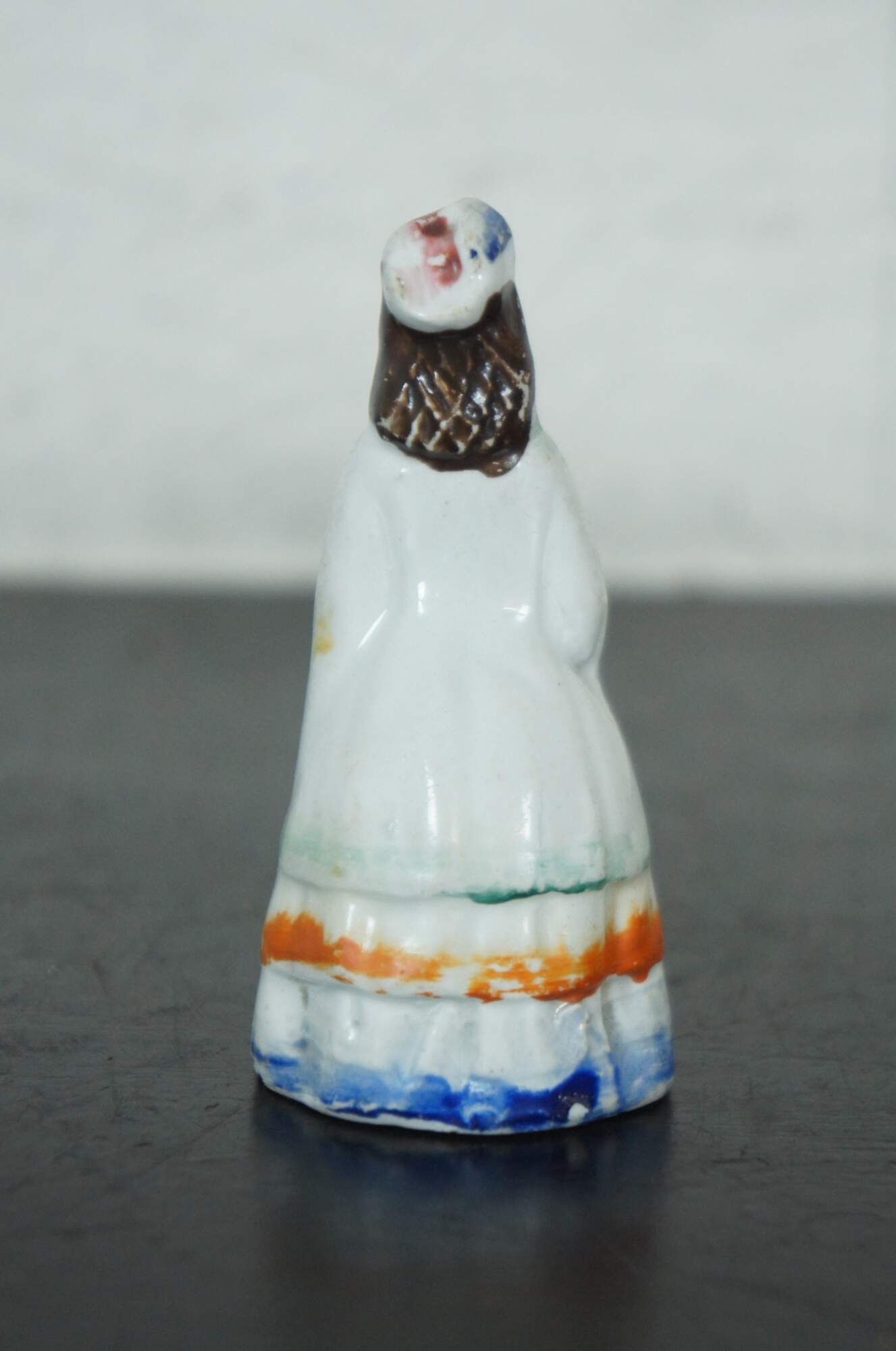 Antique Staffordshire porcelain figurine in the shape of a woman in circa 1860s dress.“Fairings, which are small porcelain groups of gaily colored animal and human china figures, were given away as prizes or purchased at English fairs. Fairings were a popular fair souvenir during the middle of the Victorian era through 1915. Commemorative buildings and people, along with popular music and songs, inspired some of the fairings. Because beds were featured so prominently in many fairings, fairings often were referred to as “bedpieces.” Small trinket boxes were common souvenir items sold at fairs or seaside resorts. Staffordshire or other English potters did not make fairings. They were imported from Germany. Production of fairings ceased in 1914, resulting from tension associated with the coming of World War I.”
