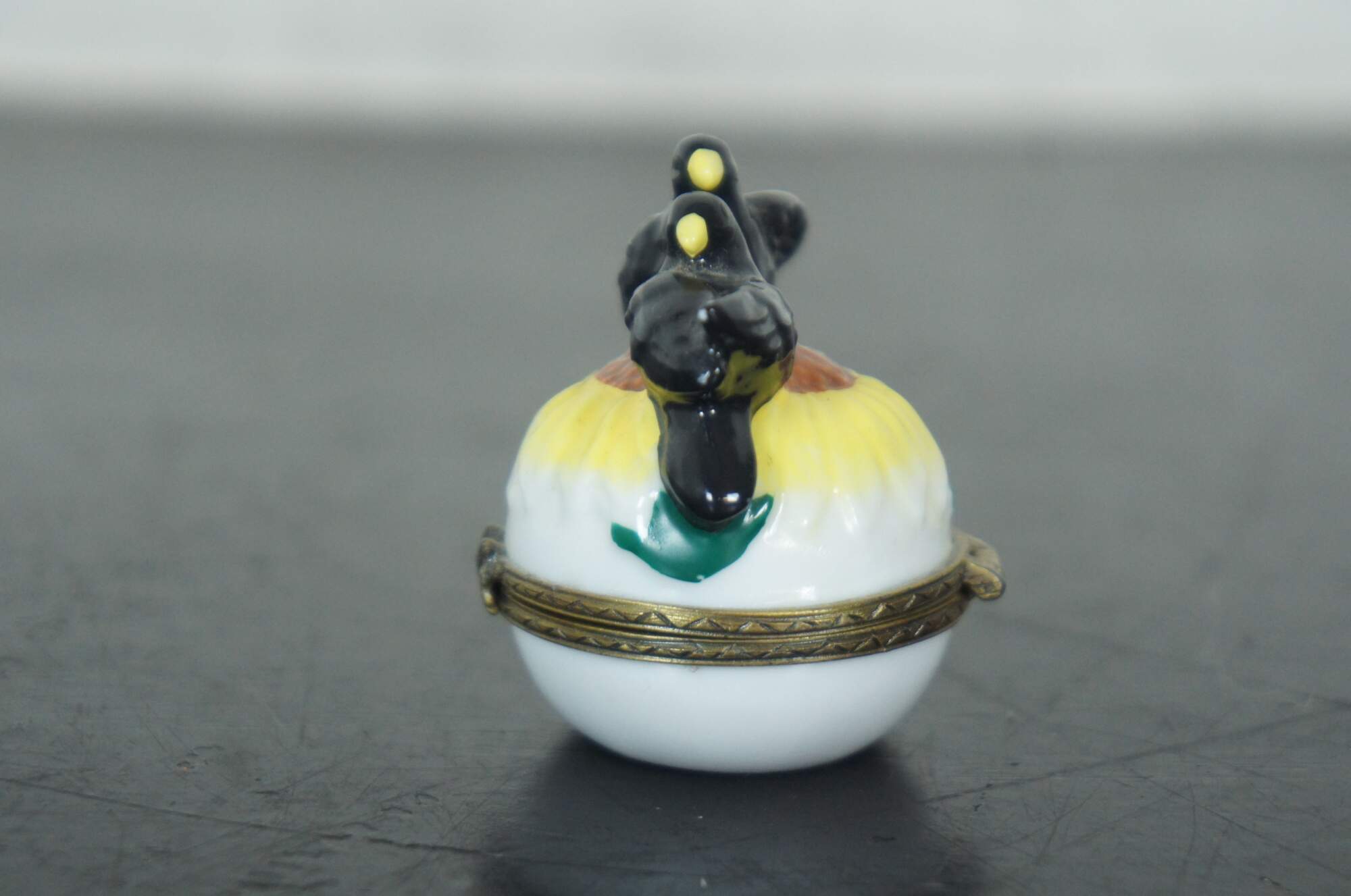 Vintage round porcelain limoges trinket box topped with a sunflowers and two blackbirds / crows / ravens.