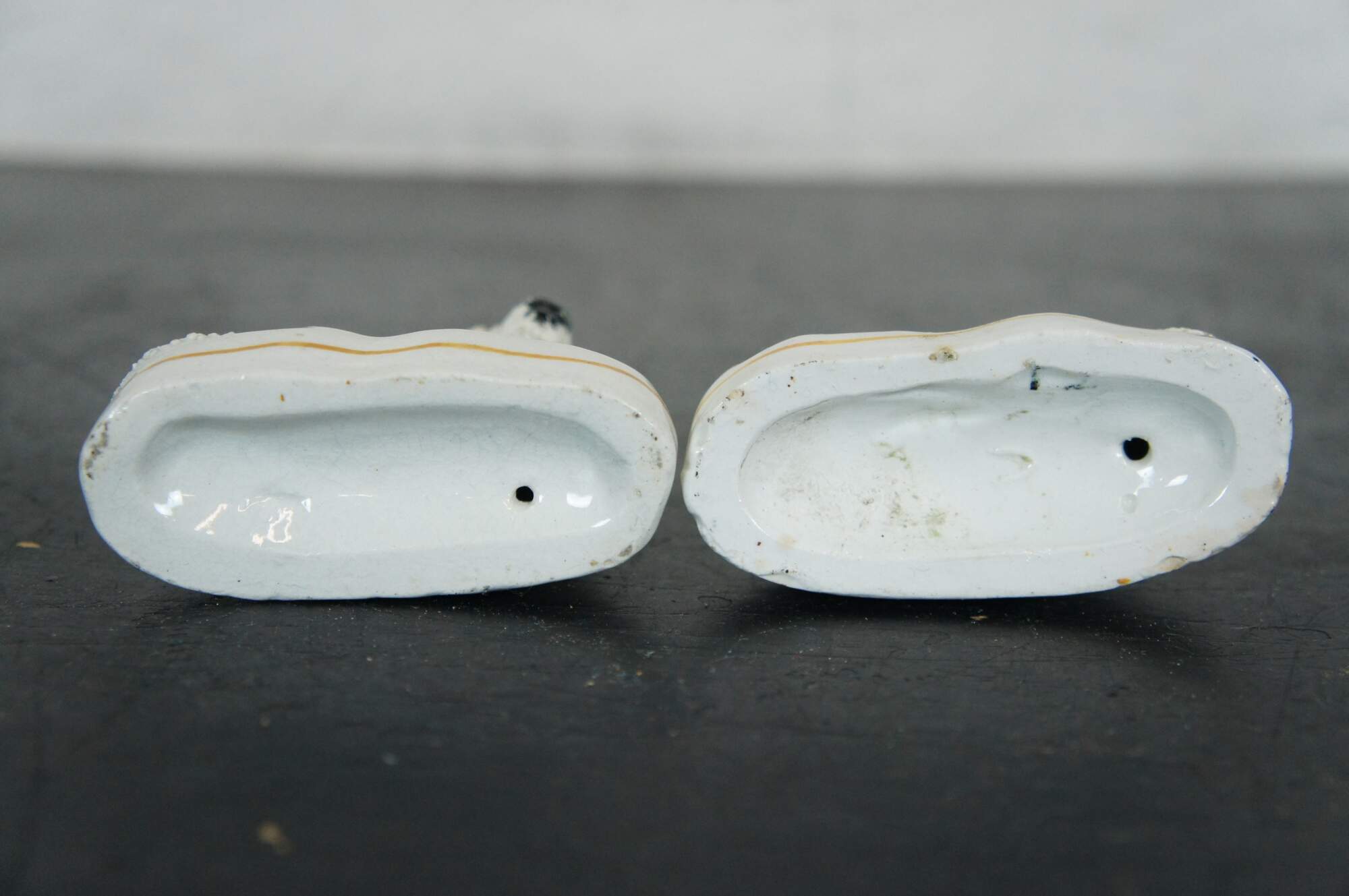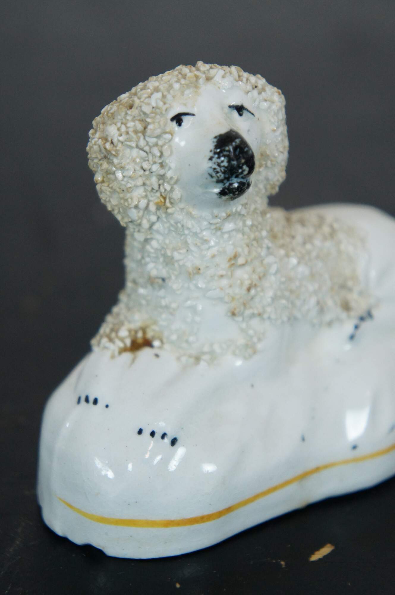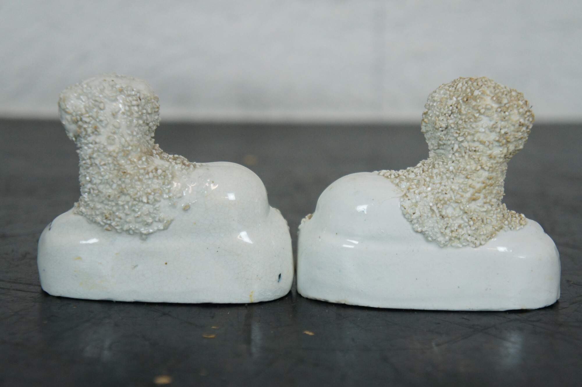 Pair of antique miniature 19th century Staffordshire porcelain figurines in the shape of reclining Lambs with black noses and confetti fur. Great for display or even use as a bookend.