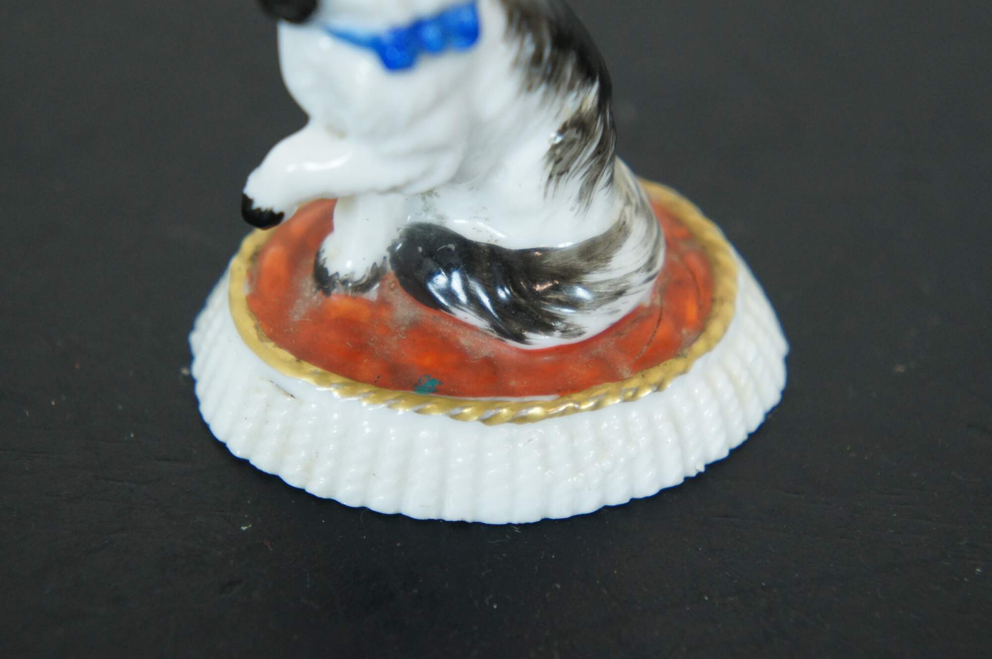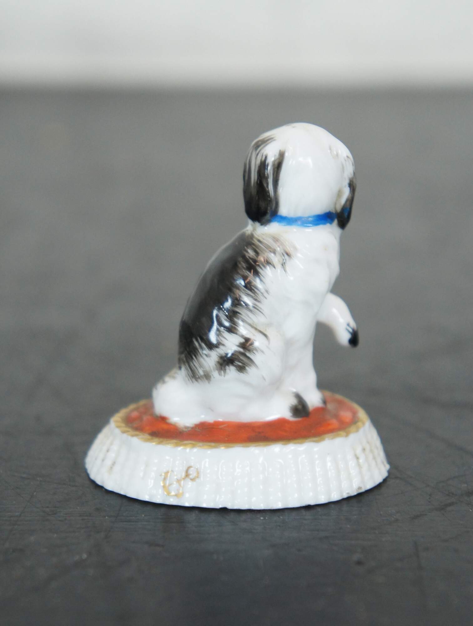Antique 1885 - 1920s century miniature porcelain figurine in the shape of a black and white spaniel with a blue bow, seated on a red and white fringed cushion. Marked with a Samson golden anchor. This mark was used on German Chelsea Reproductions