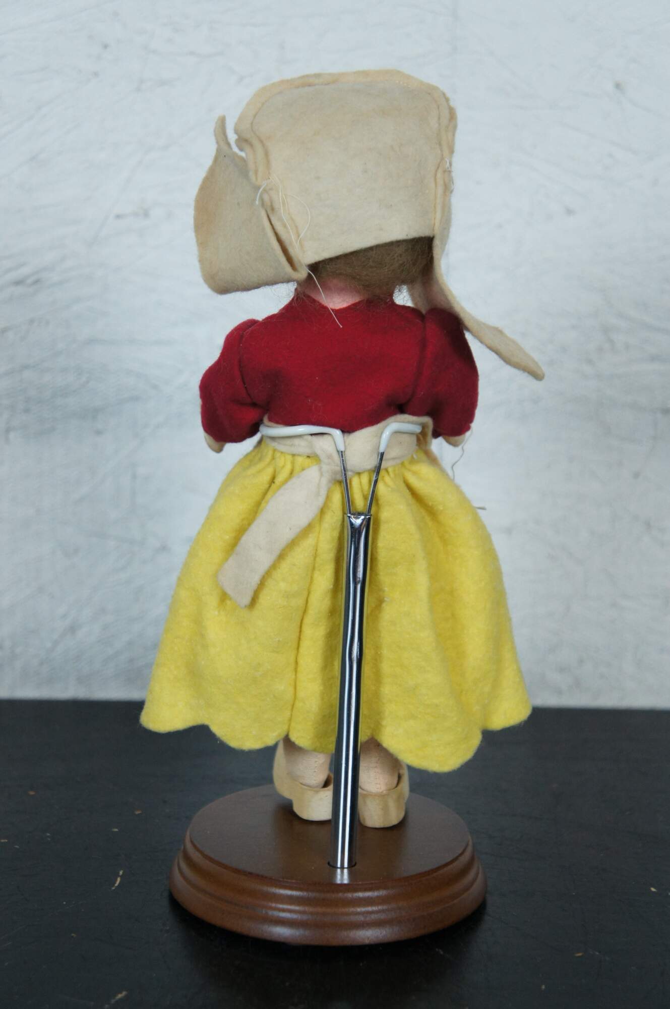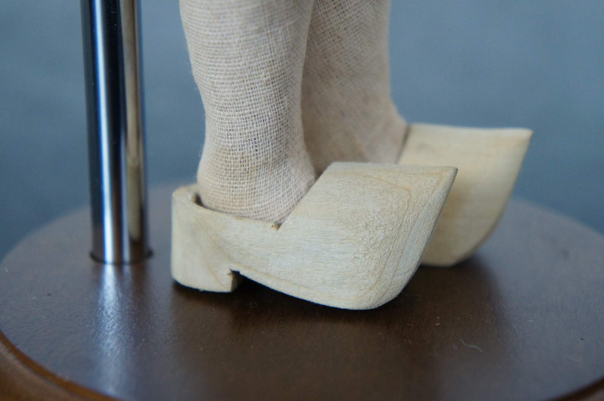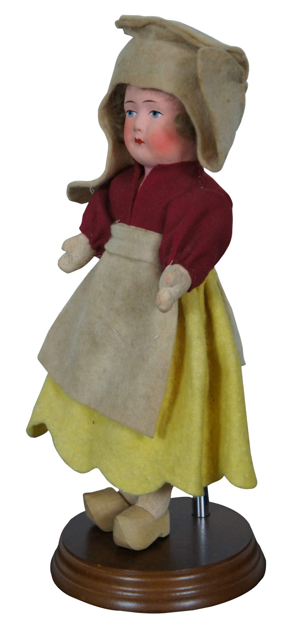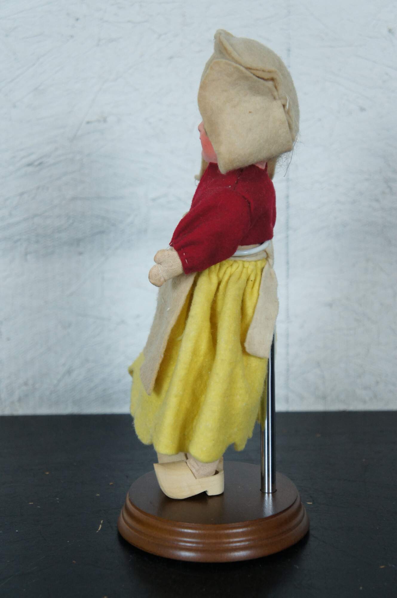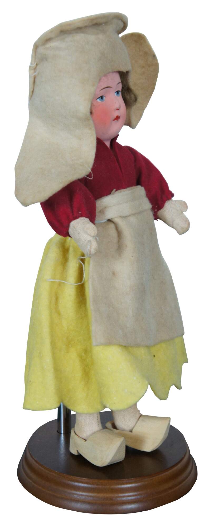 Mid to late century cloth doll with hand painted celluloid head, dressed in a yellow and red felt folk outfit and wooden Dutch shoes. Includes Bard’s wood and chrome display stand.