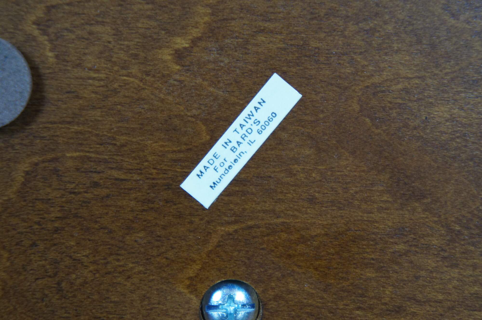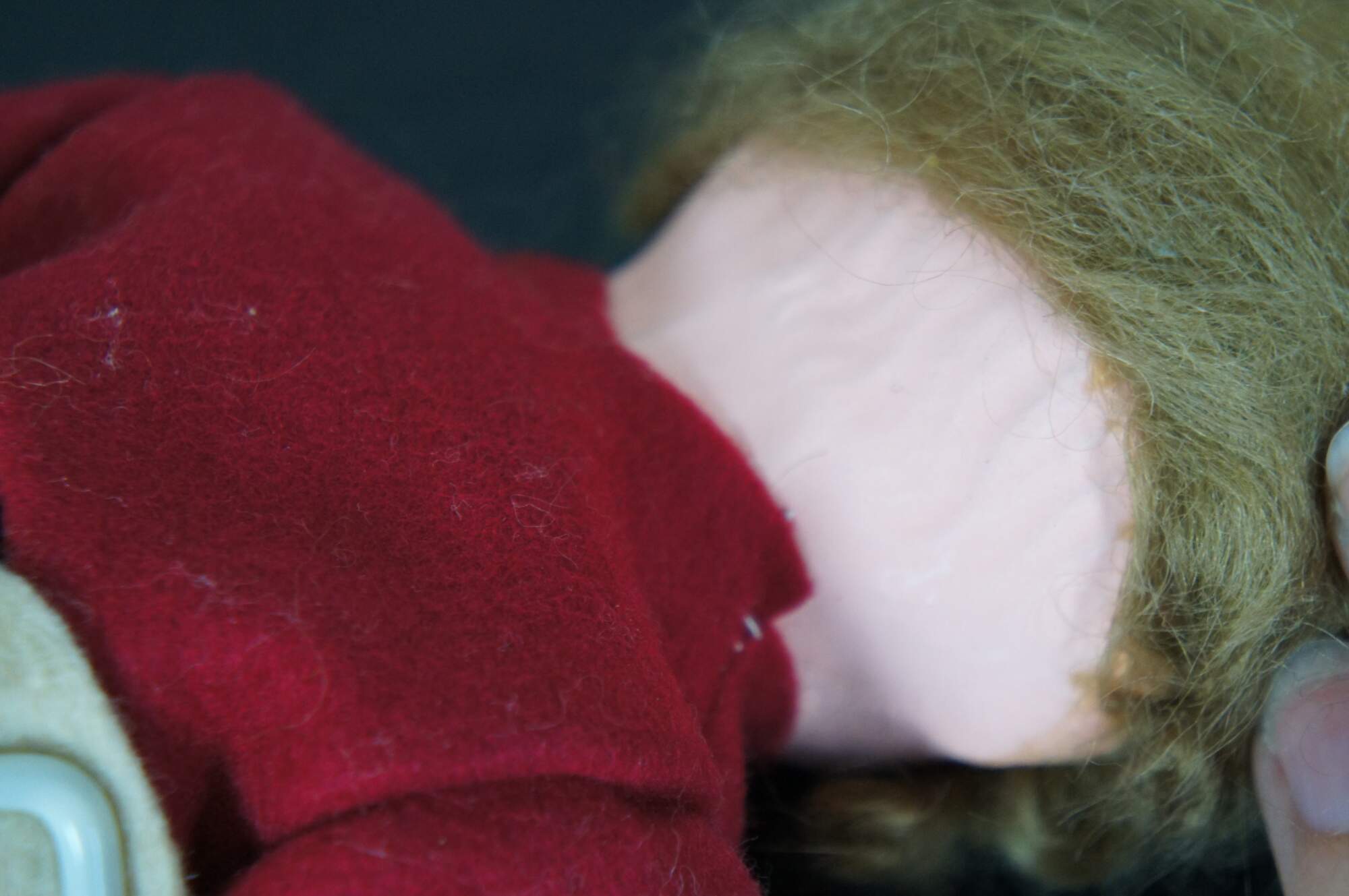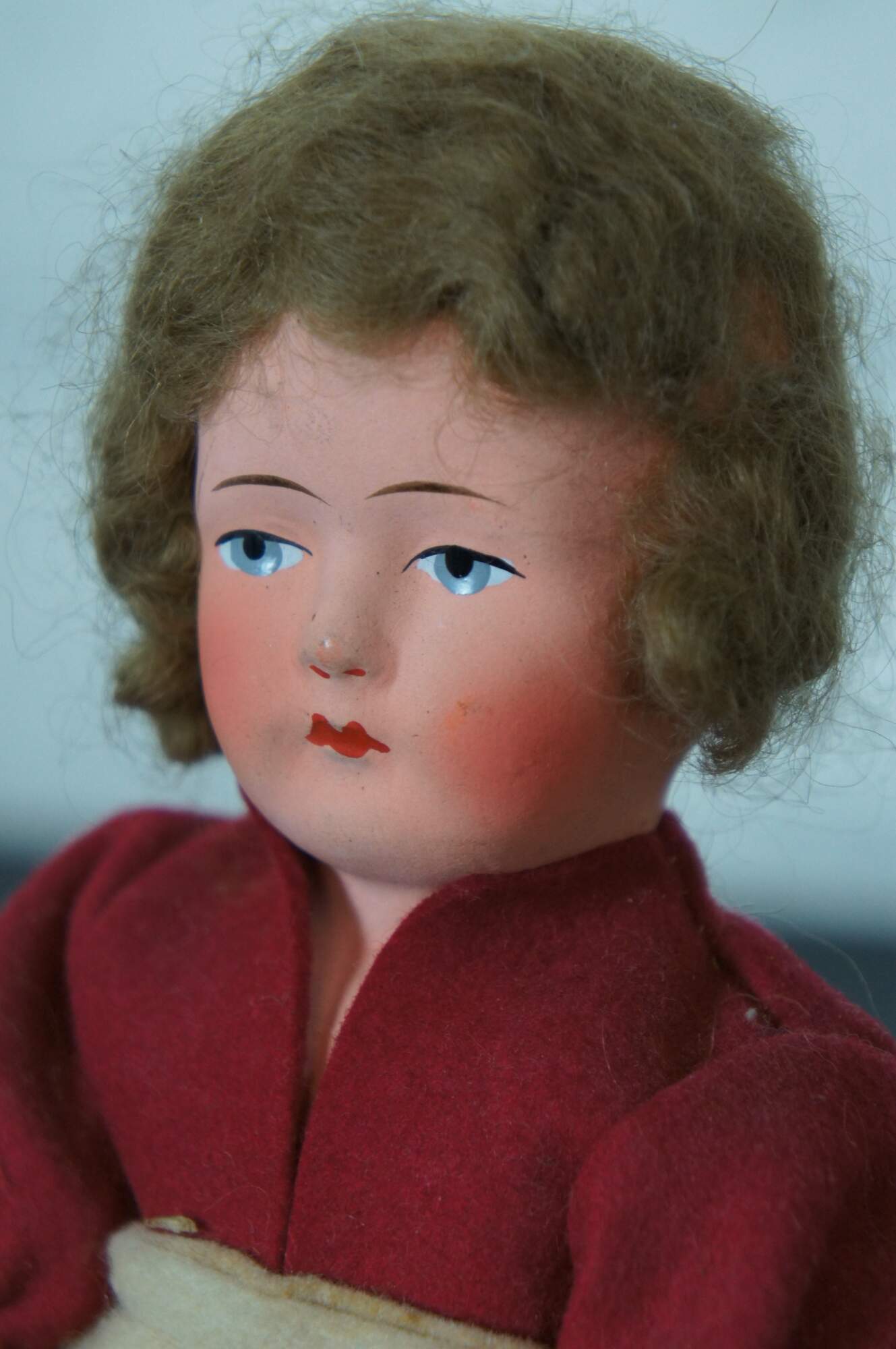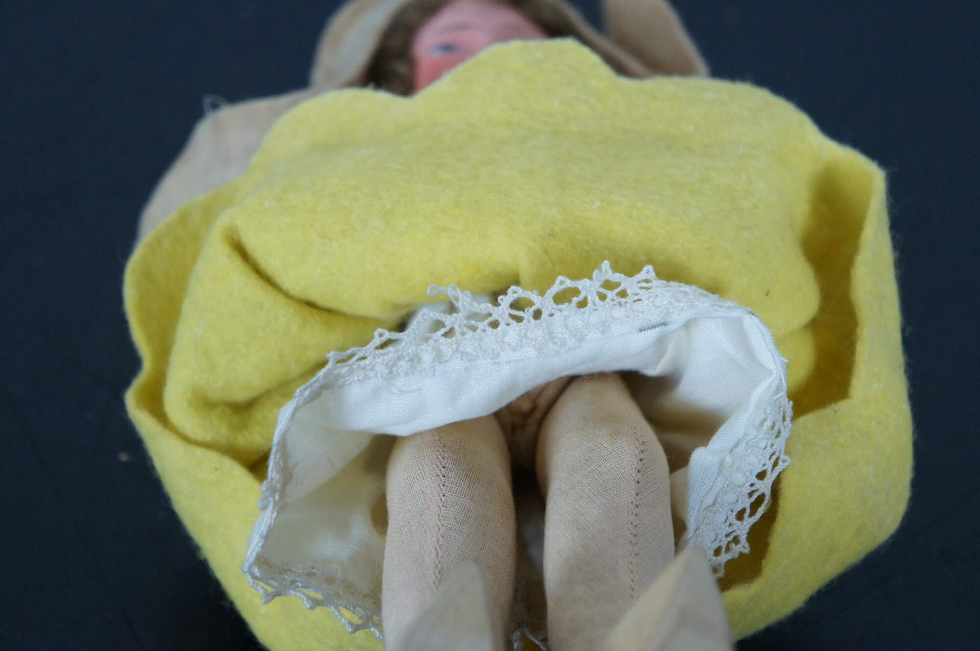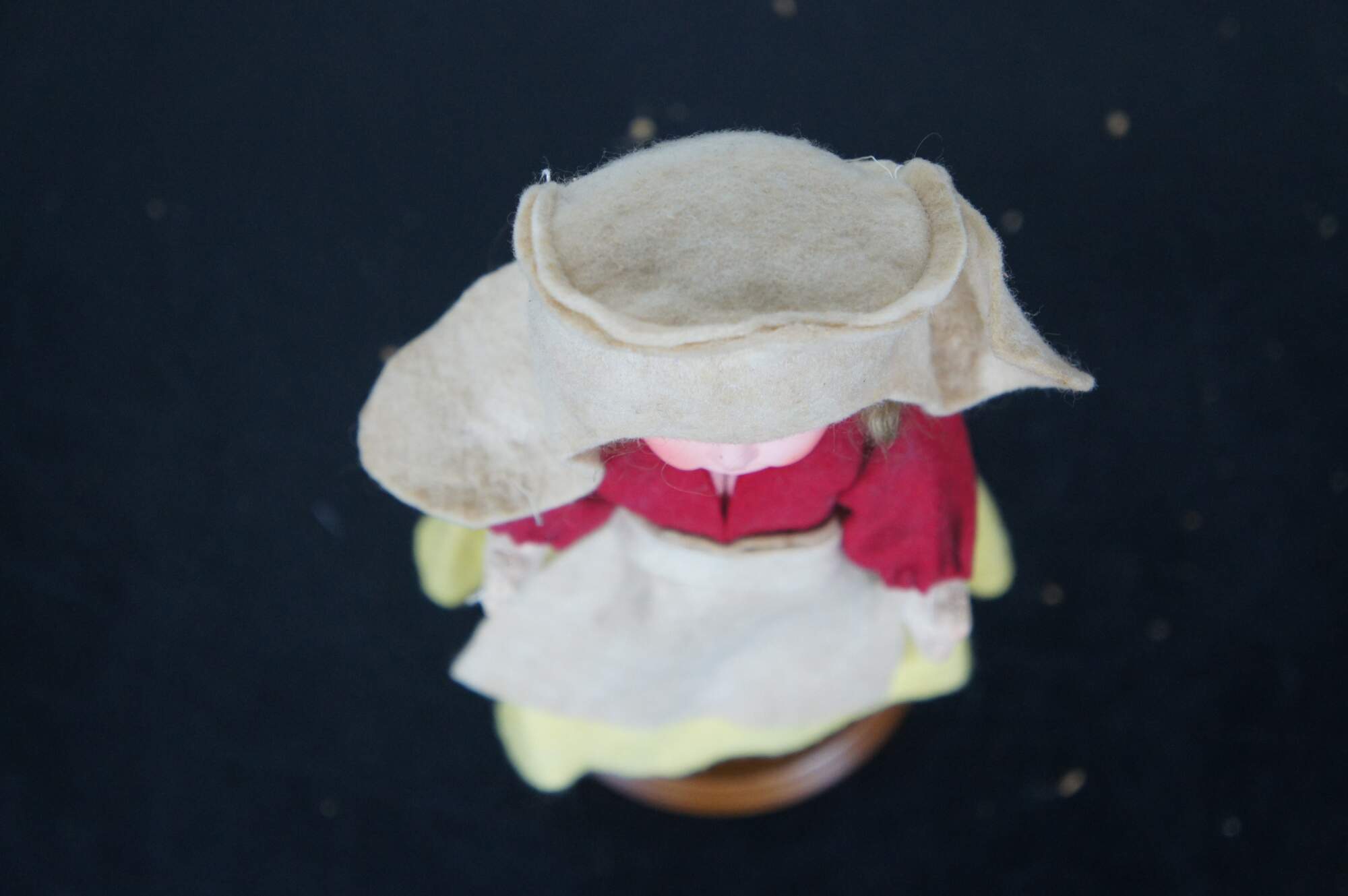 Mid to late century cloth doll with hand painted celluloid head, dressed in a yellow and red felt folk outfit and wooden Dutch shoes. Includes Bard’s wood and chrome display stand.