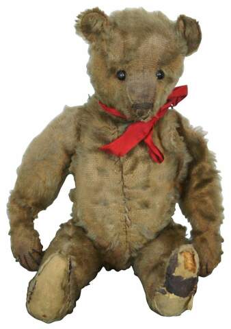 Fair Condition – Pretty heavy wear throughout to fur/leather paw pads, arm missing stuffing, stained nose, couple holes, repaired front seam