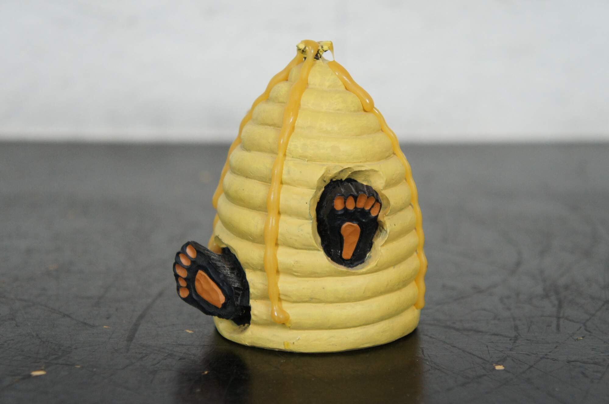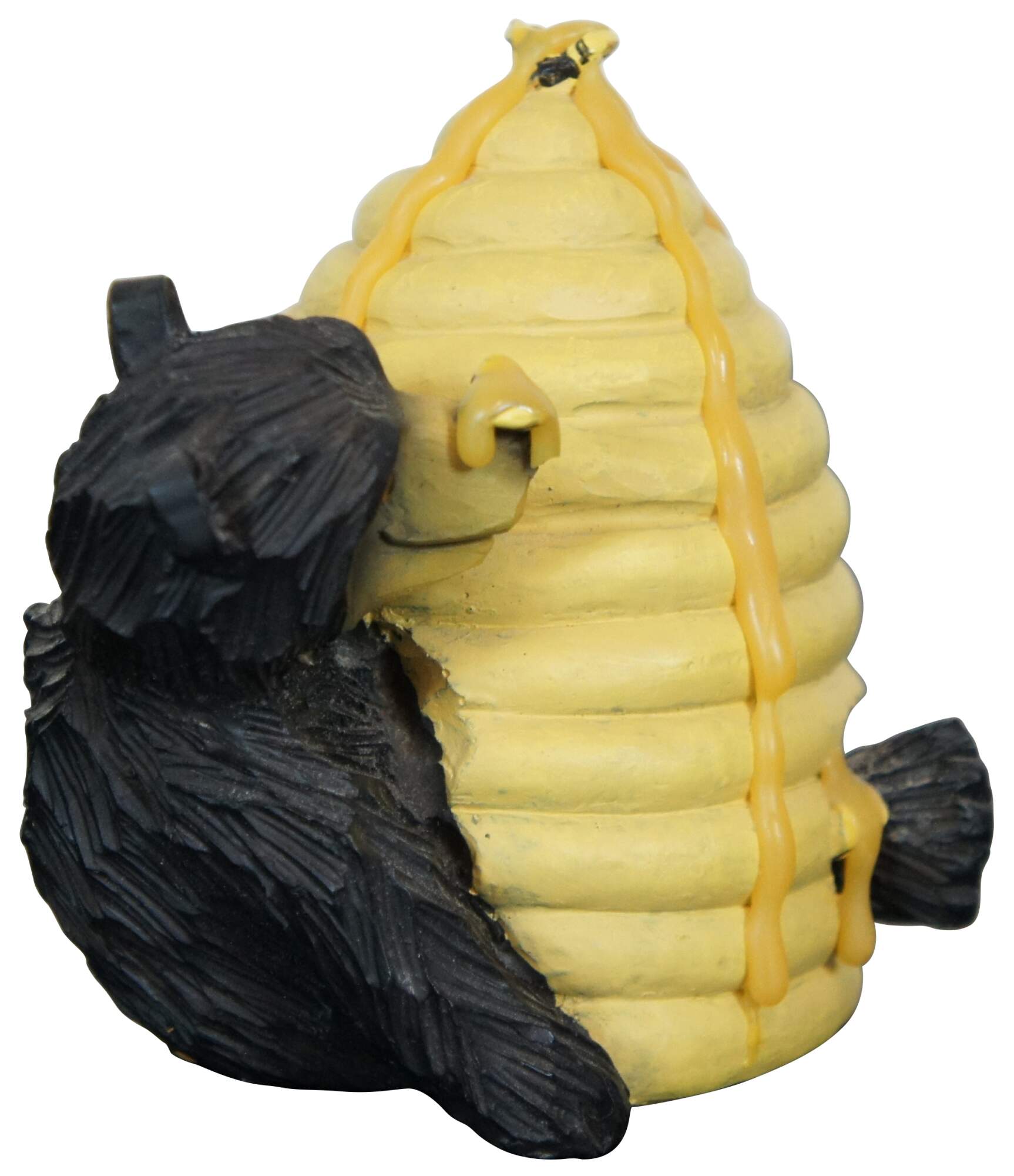 Whimsical vintage resin figurine in the shape of a black bear stuck seated in a bee hive dripping honey.