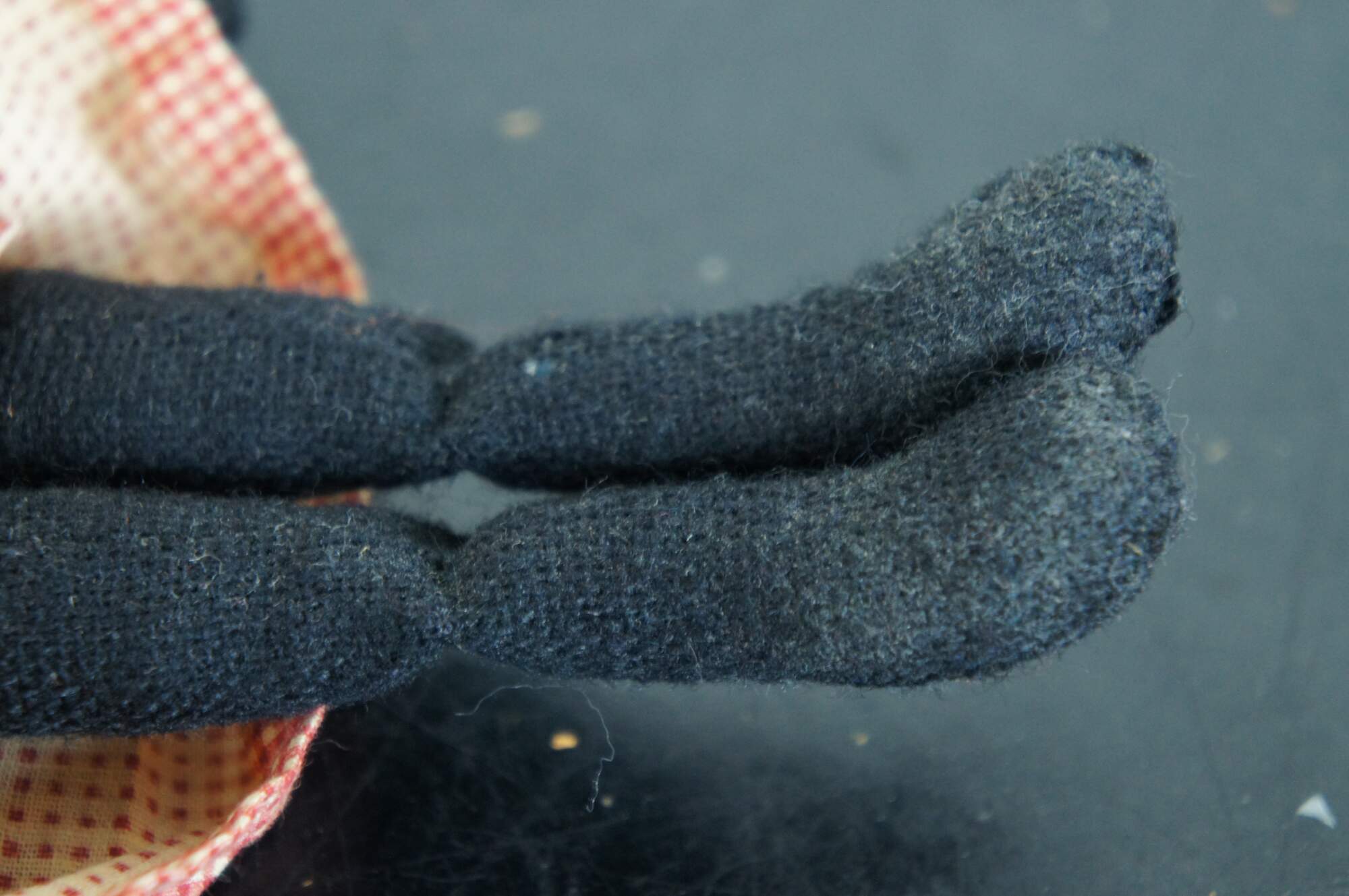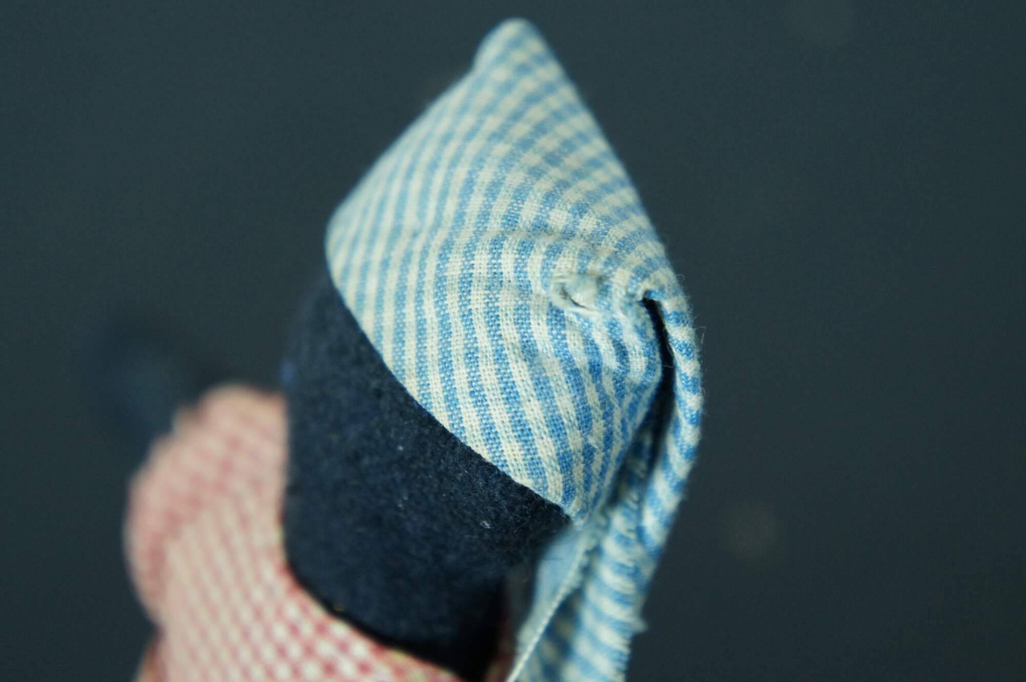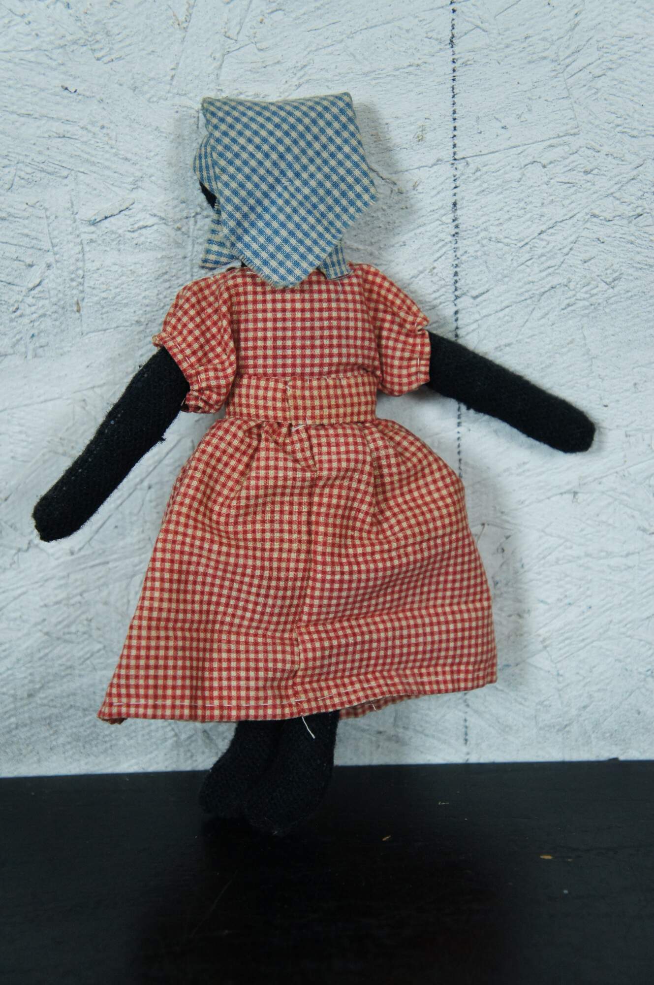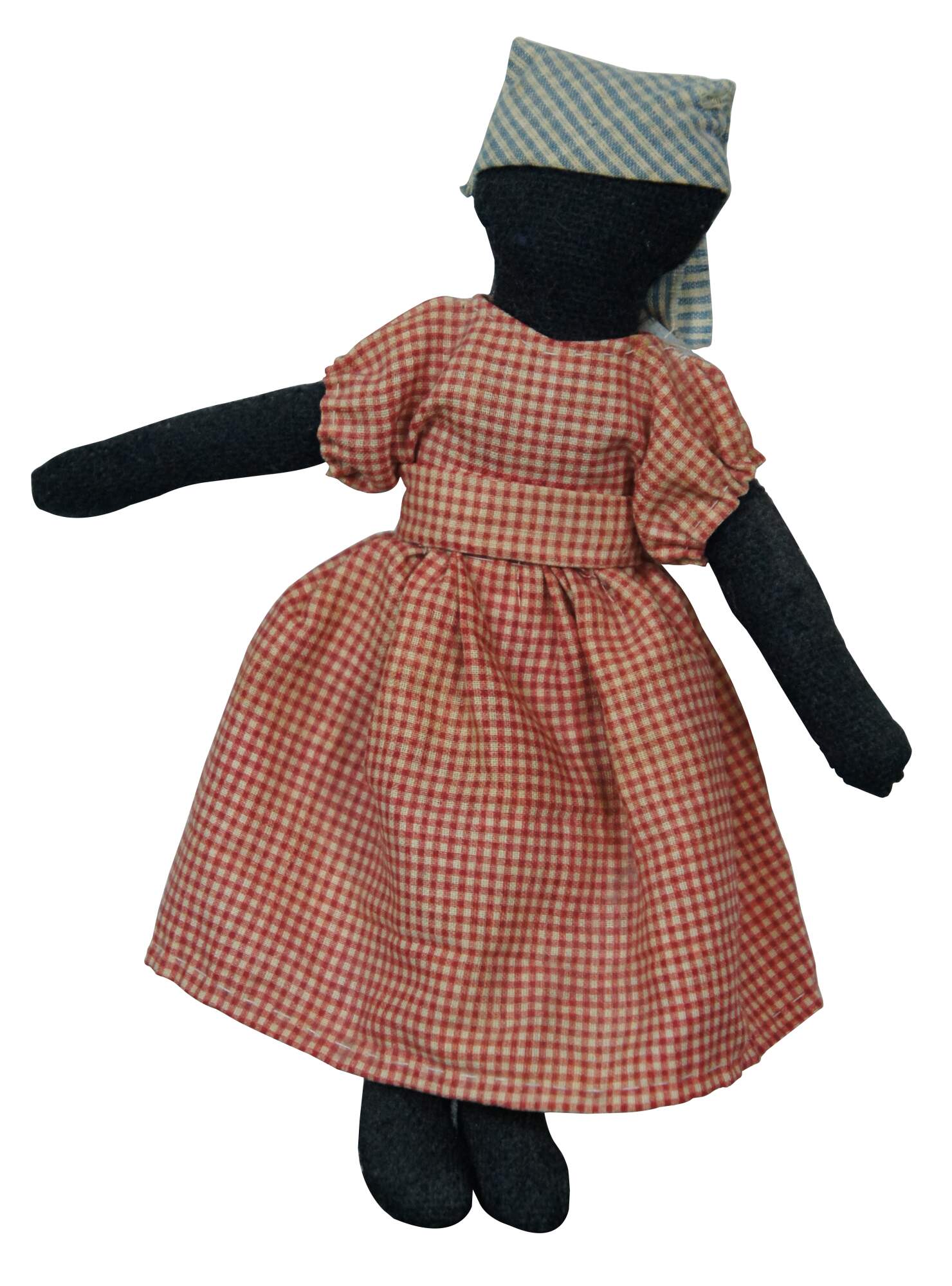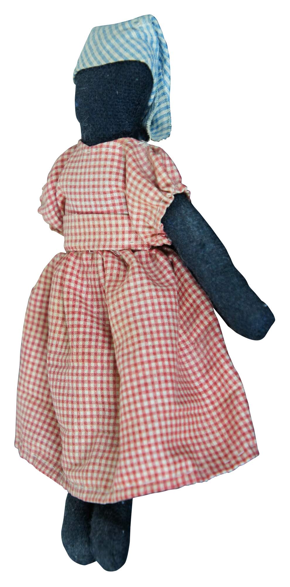 Antique folk art cloth doll of a woman dressed in a red gingham dress and blue gingham kerchief.