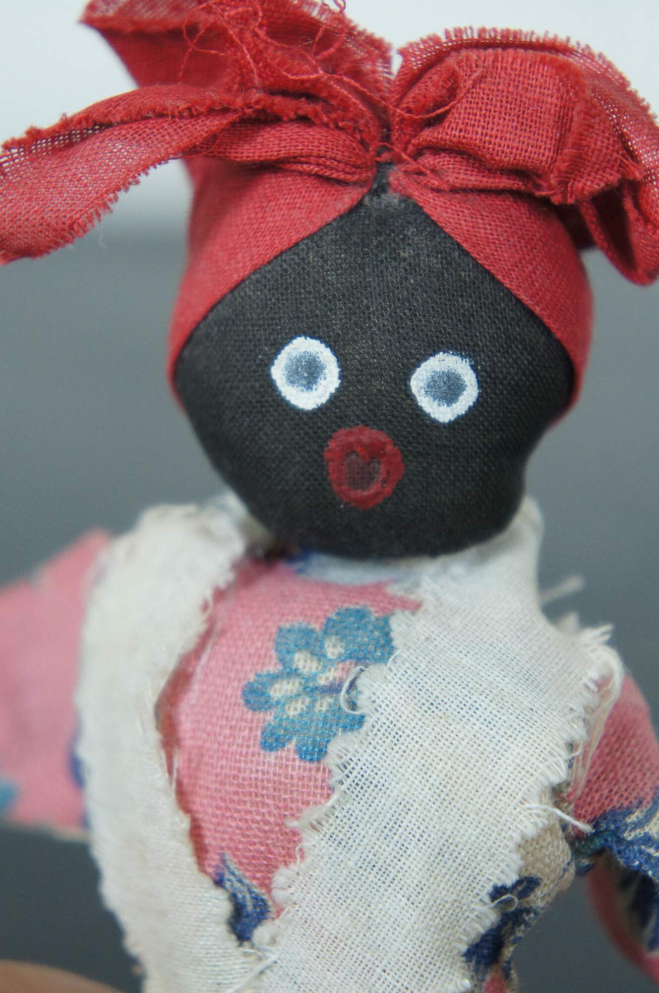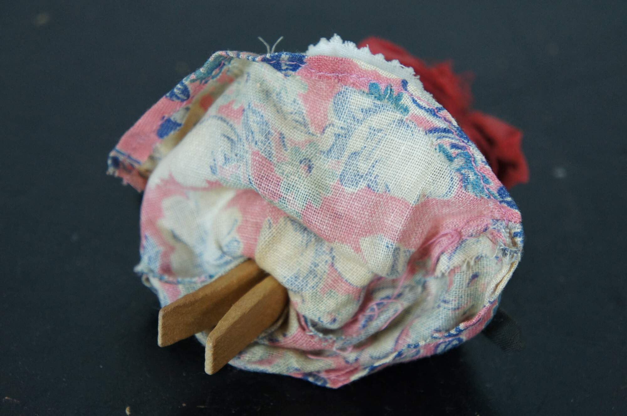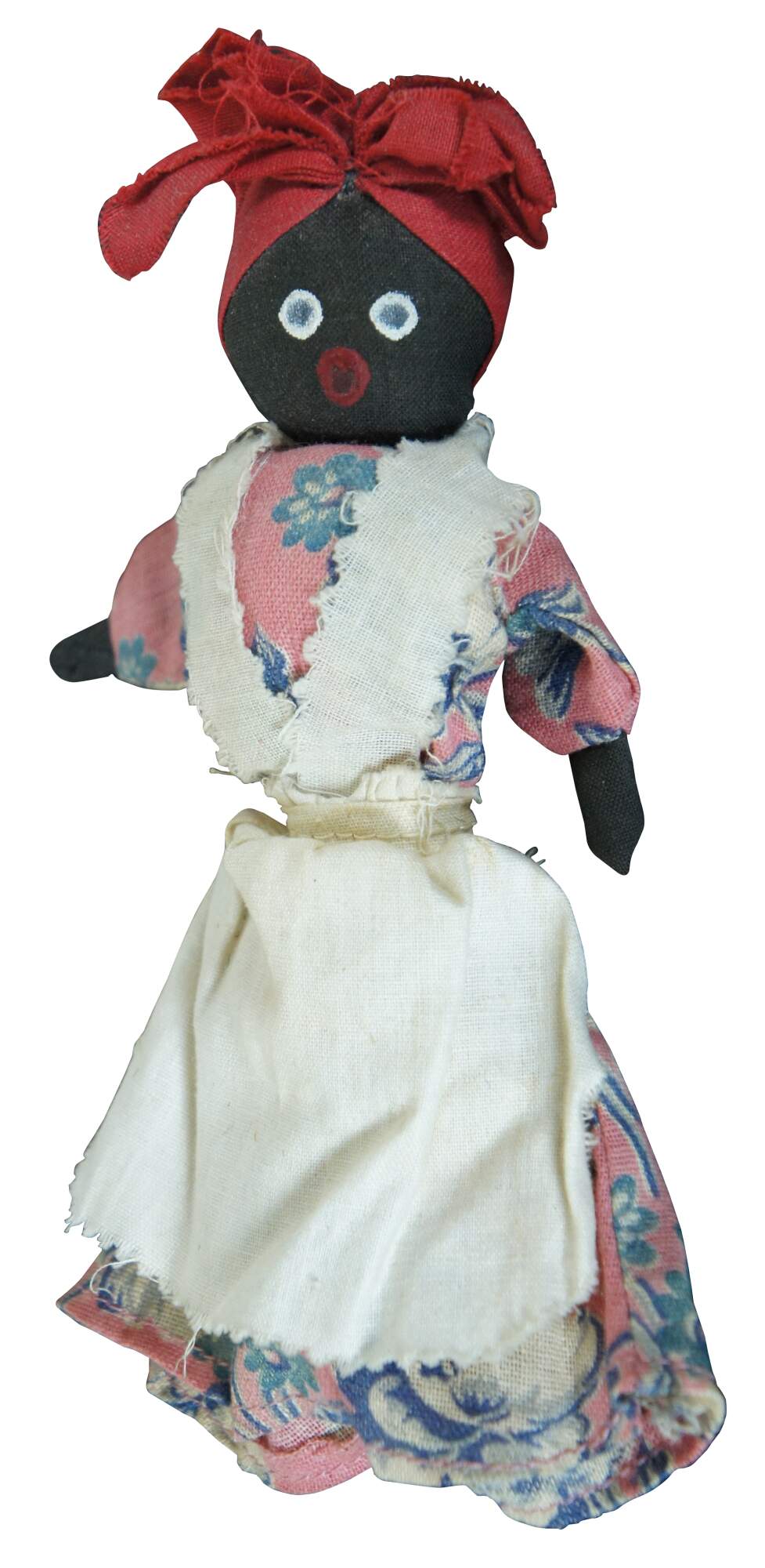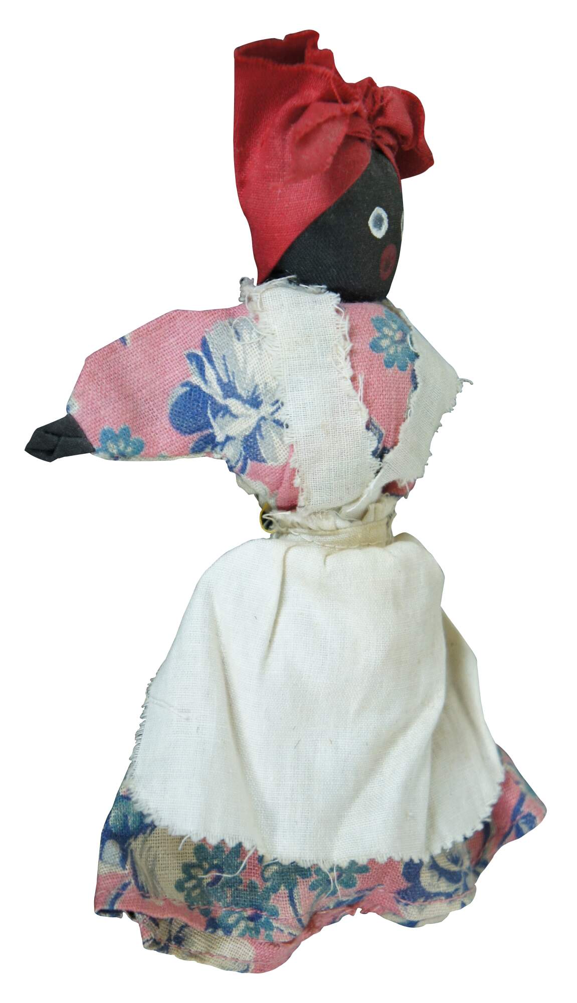 Antique folk art cloth and clothes pin doll of a woman dressed in a pink floral dress, white pinafore apron, and red kerchief.