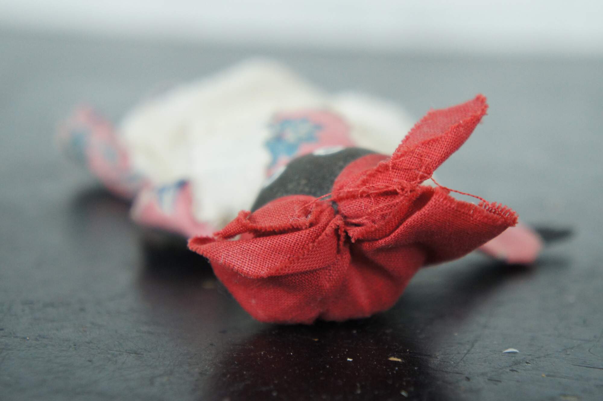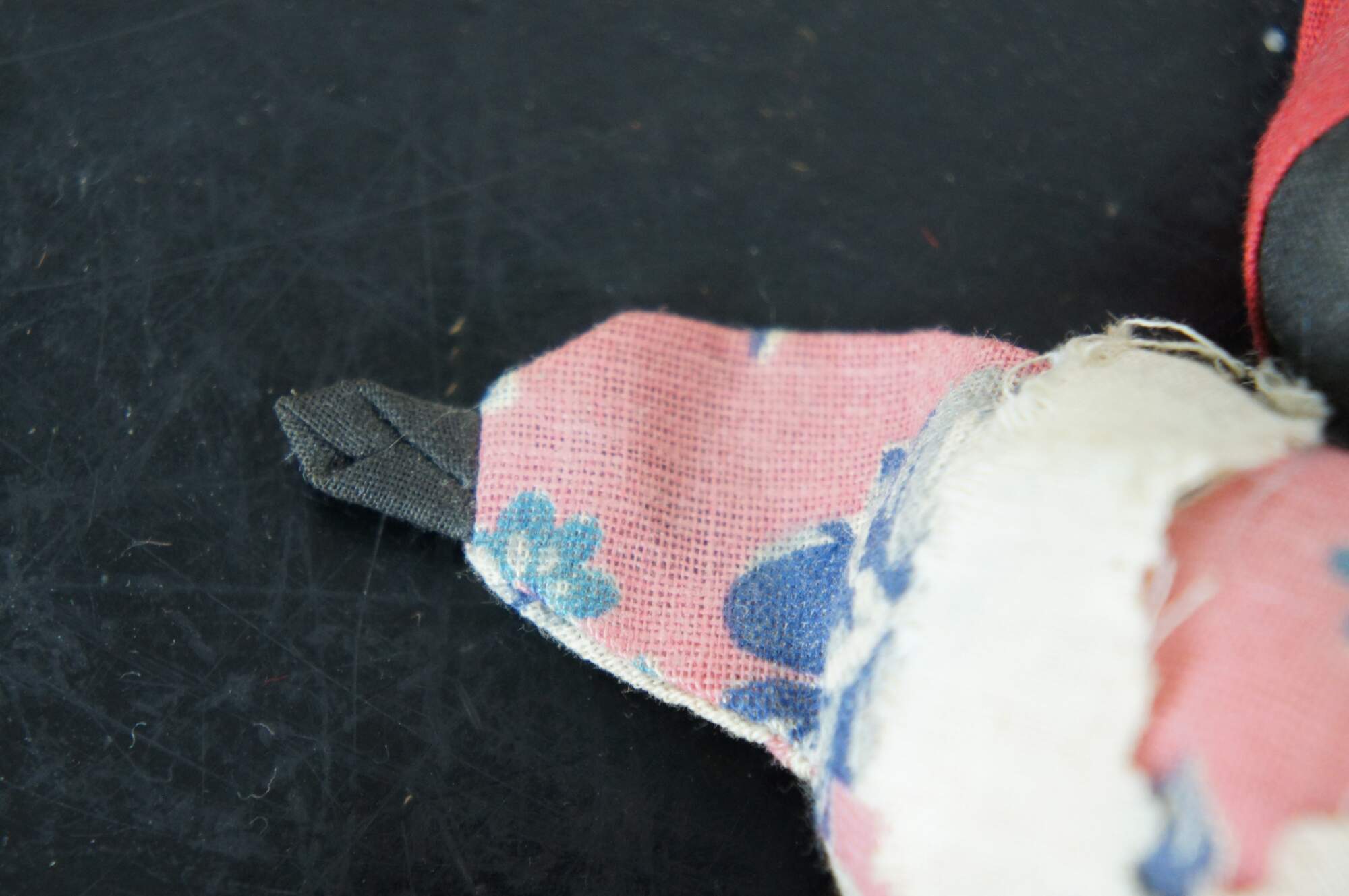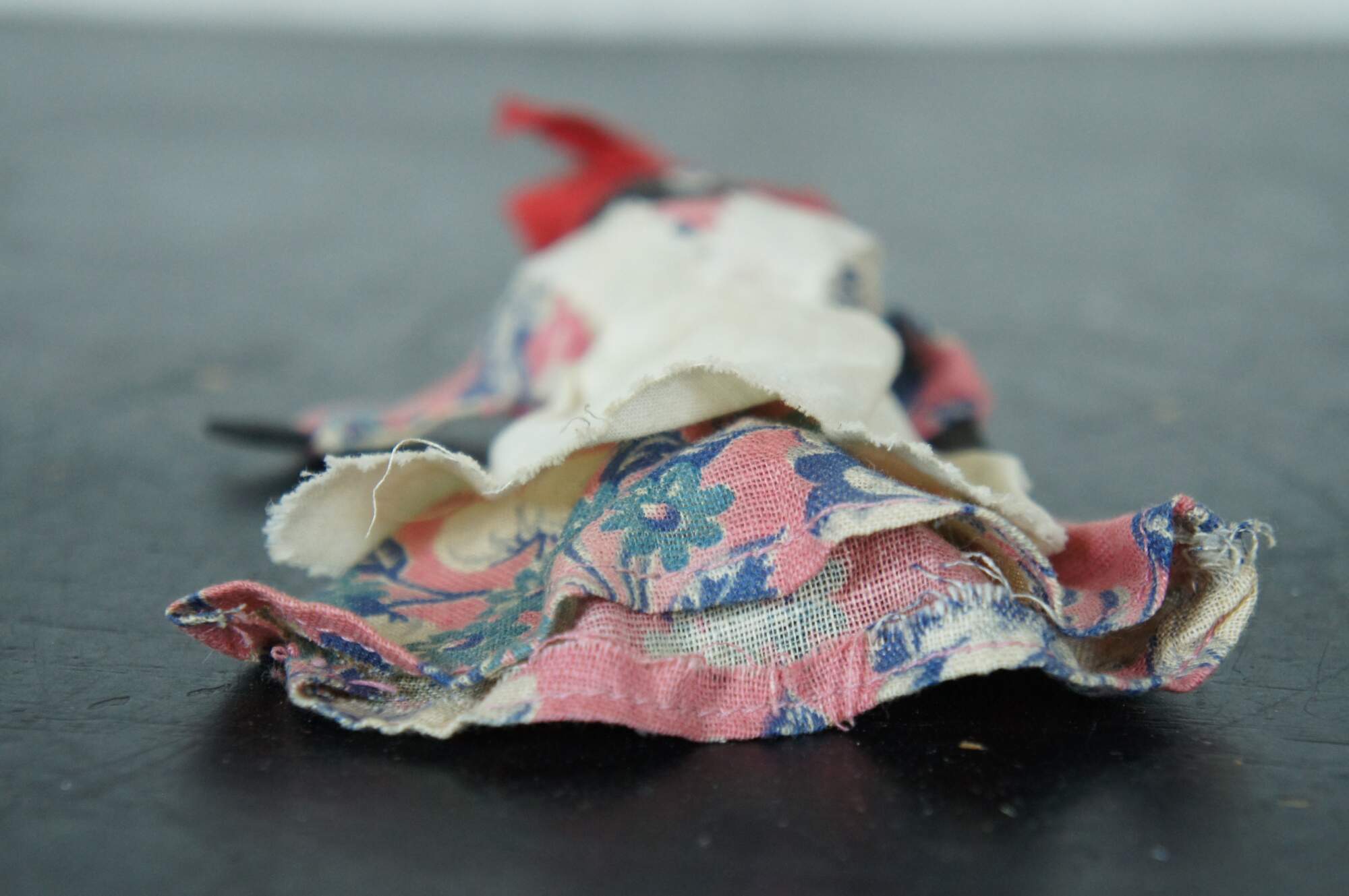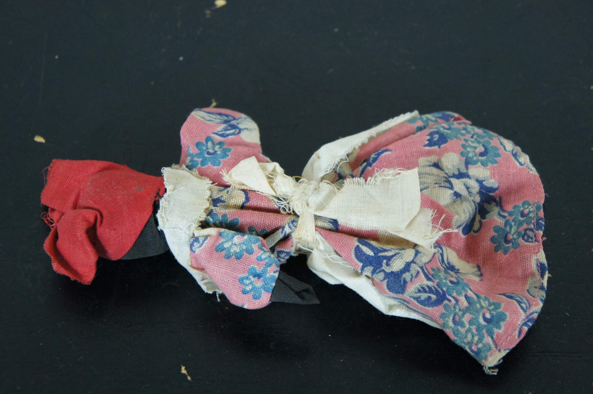 Antique folk art cloth and clothes pin doll of a woman dressed in a pink floral dress, white pinafore apron, and red kerchief.